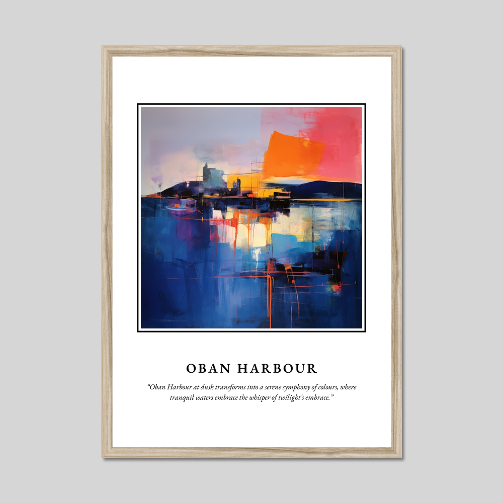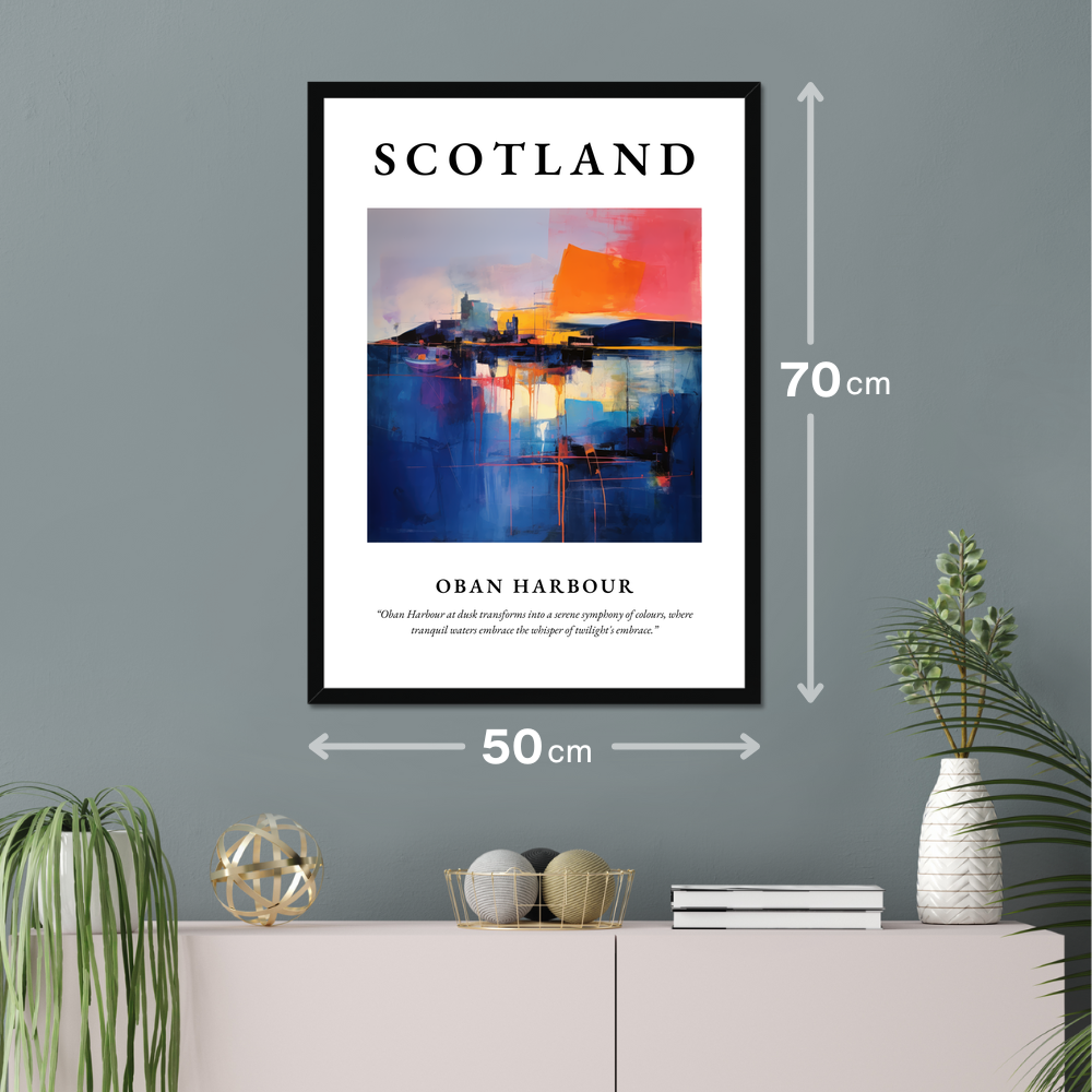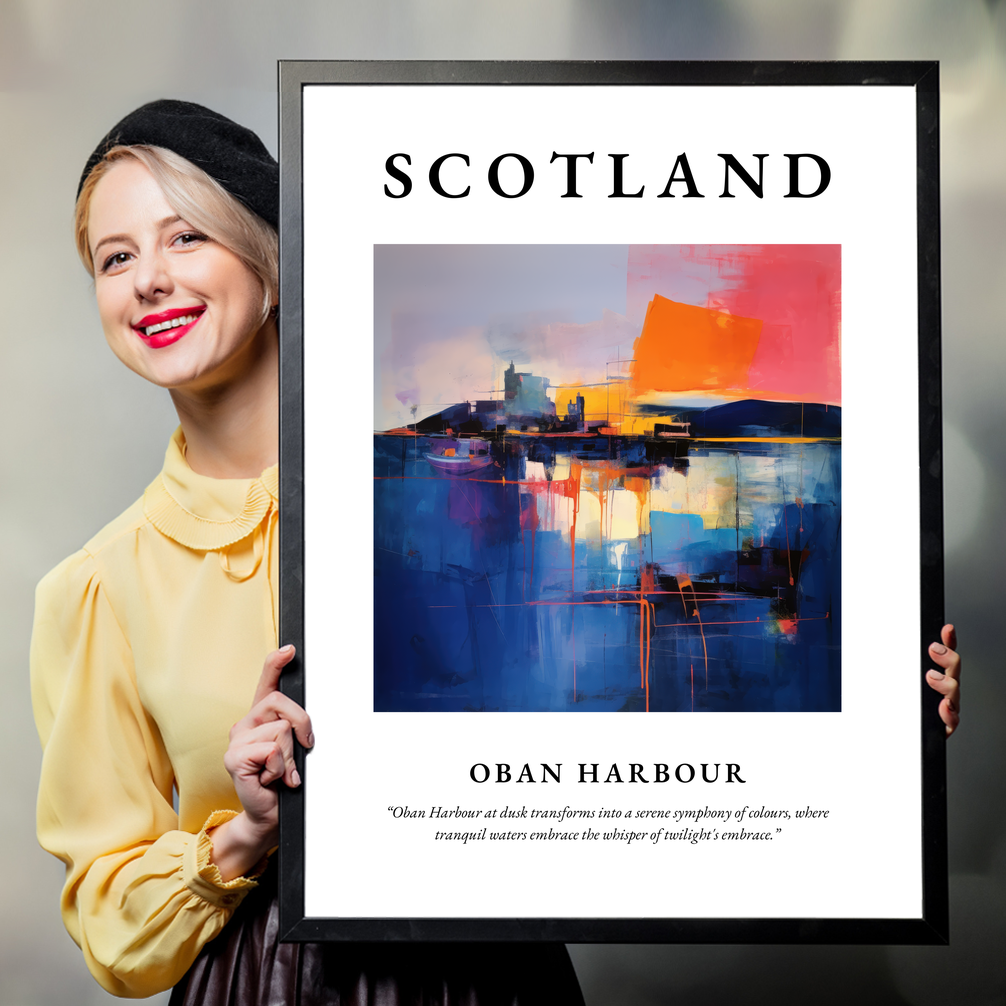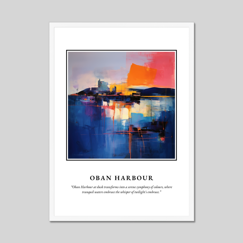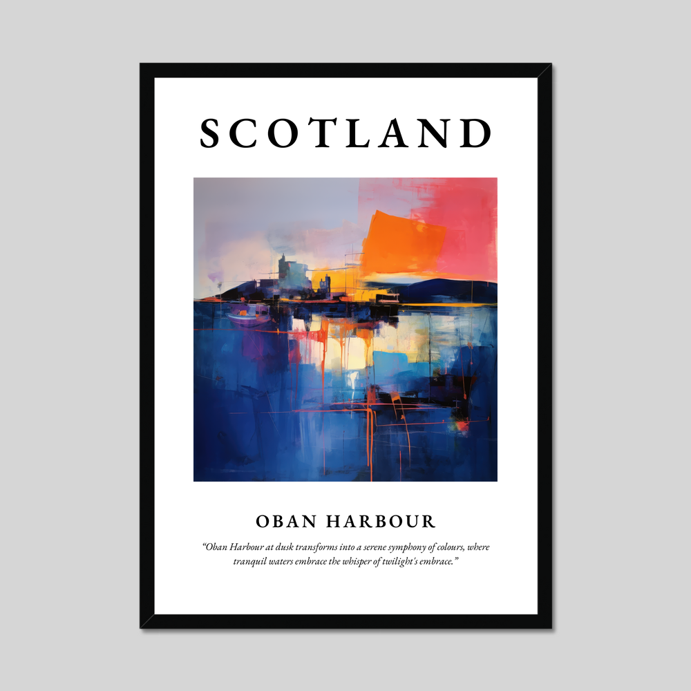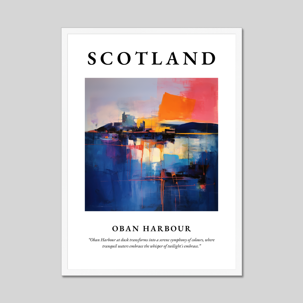 At the top, the bold "SCOTLAND" declares its origin, setting the stage for the stunning abstract painting below. The artwork captures Oban Harbour in a mesmerizing dance of vibrant colours, where deep blues and fiery oranges meet in a tranquil embrace. Below this visual symphony, the quote, “Oban Harbour at dusk transforms into a serene symphony of colours, where tranquil waters embrace the whisper of twilight's embrace,” perfectly encapsulates the scene.