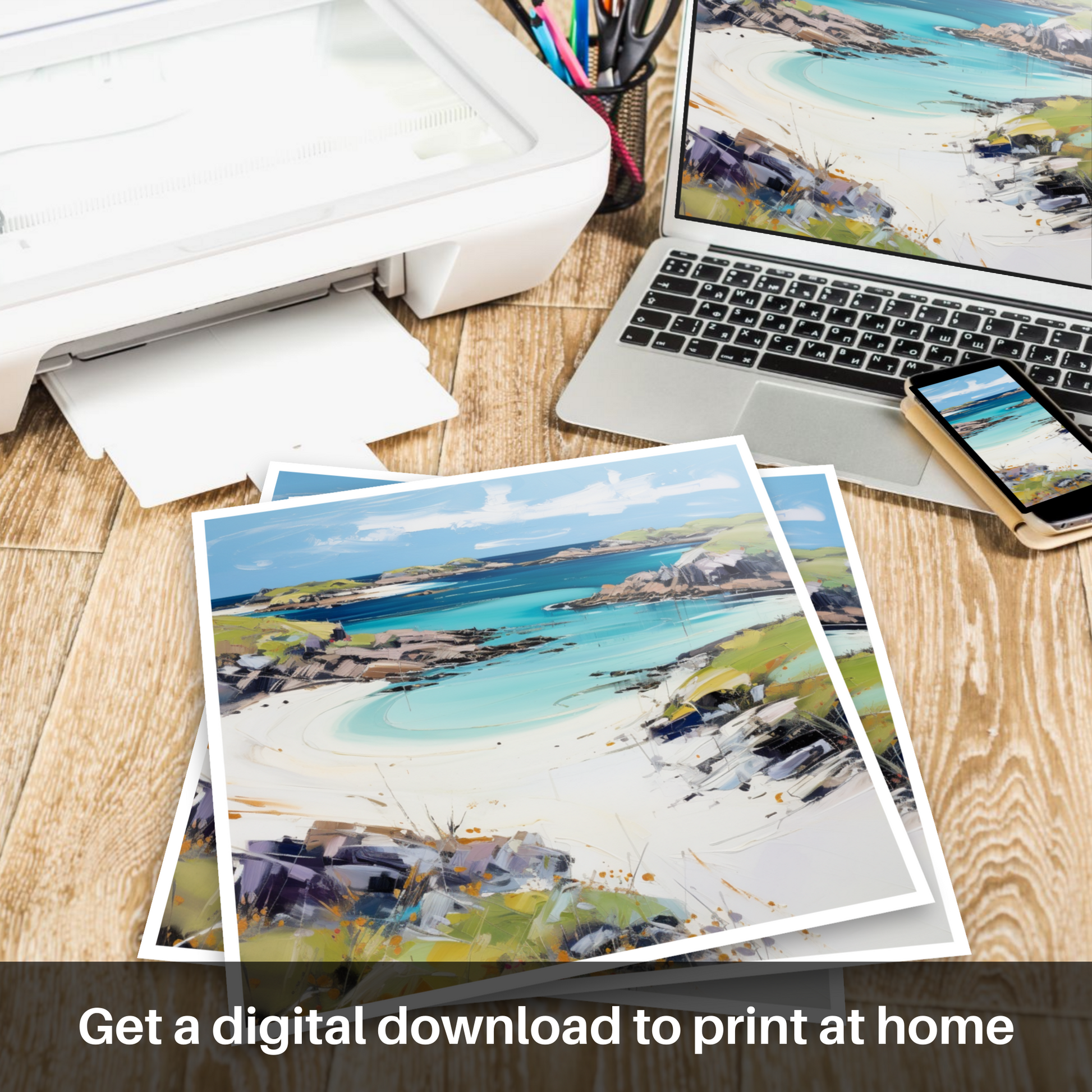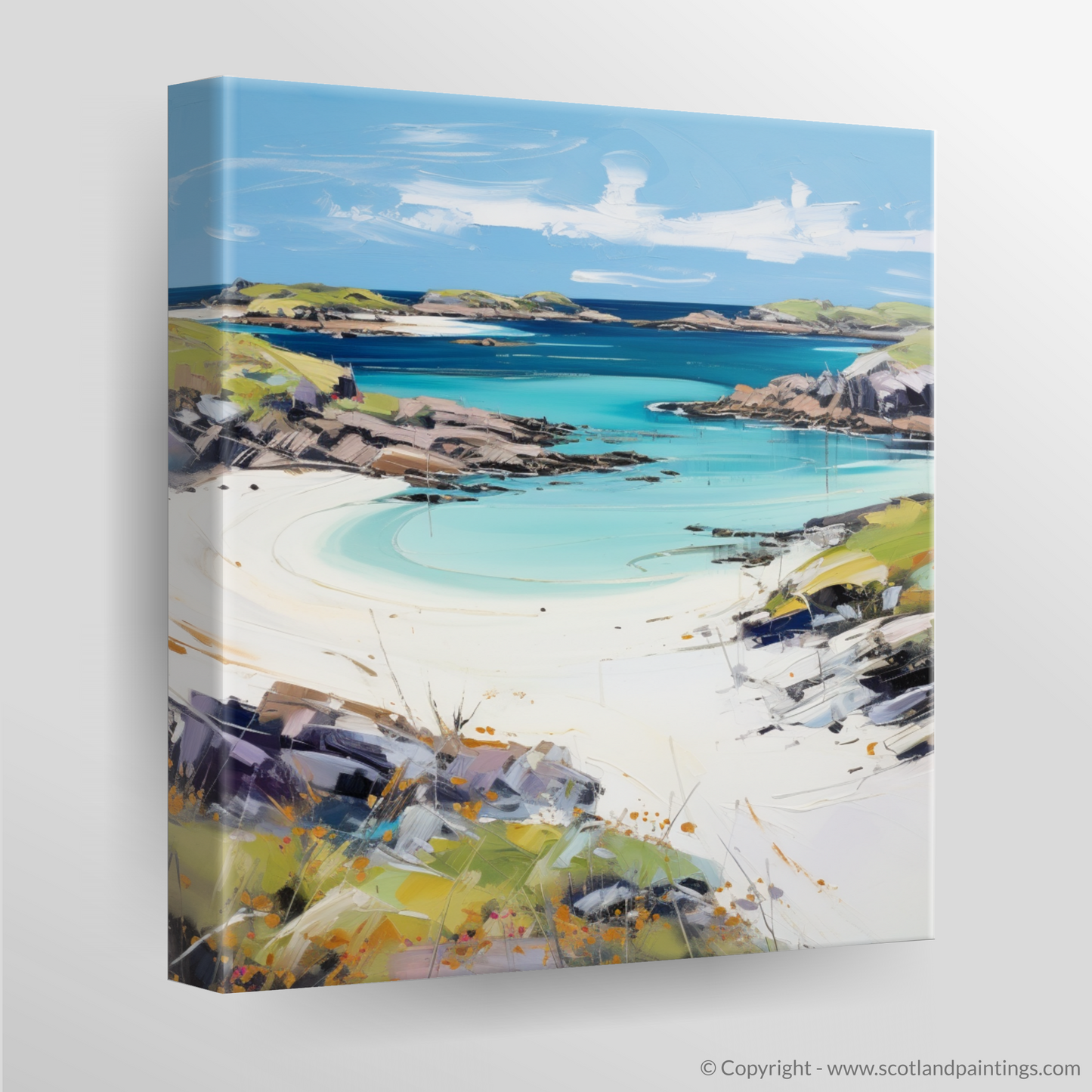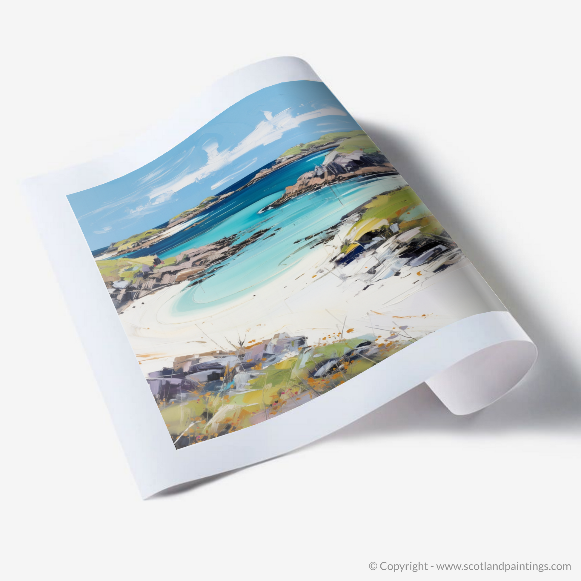 Immerse yourself in the transformative allure of a Scottish seaside haven with this captivating abstract interpretation of Achmelvich Bay. With a palette that boasts effervescent blues and serene whites, this piece echoes the crisp, invigorating air of the highland shores. Each stroke on the canvas swirls with the rhythmic dance of the waves, while dashes of vivid aquamarine and subtle cerulean embody the crystal-clear waters for which Achmelvich is renowned.