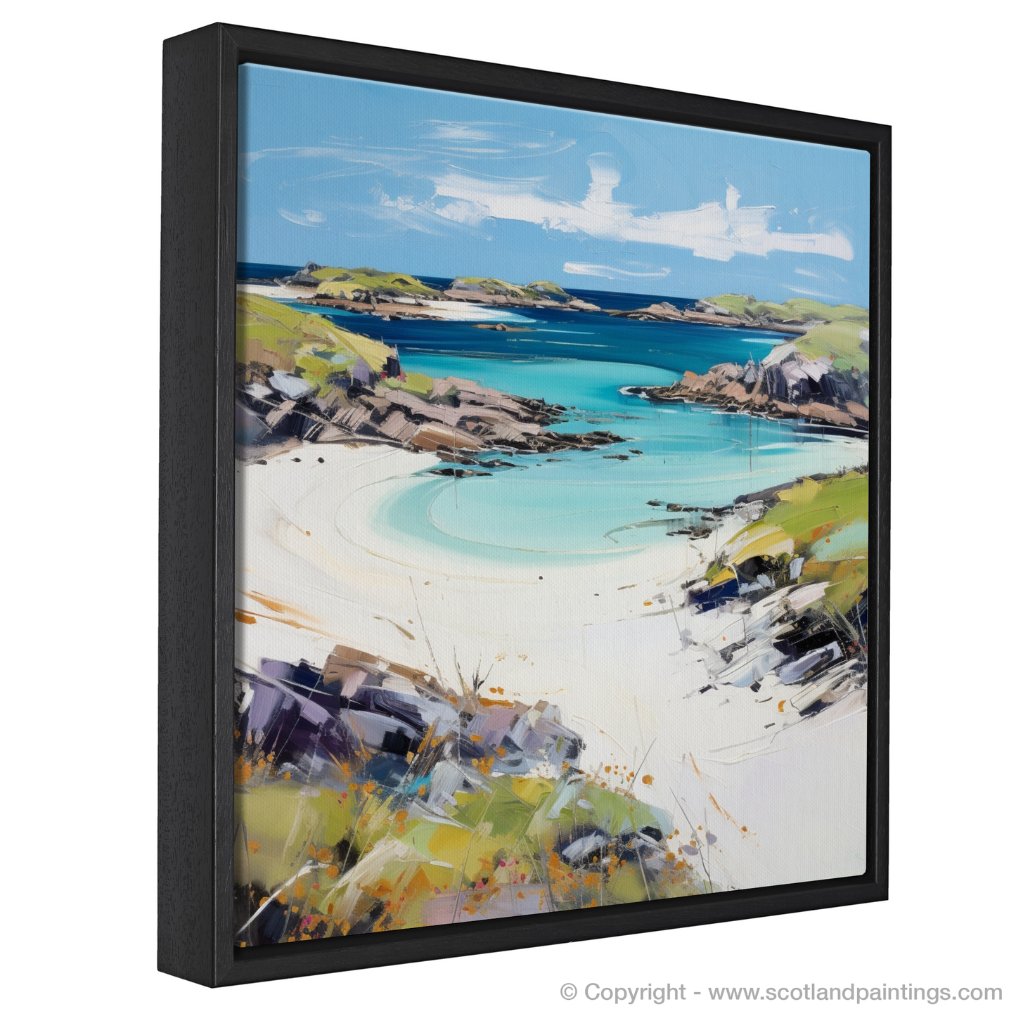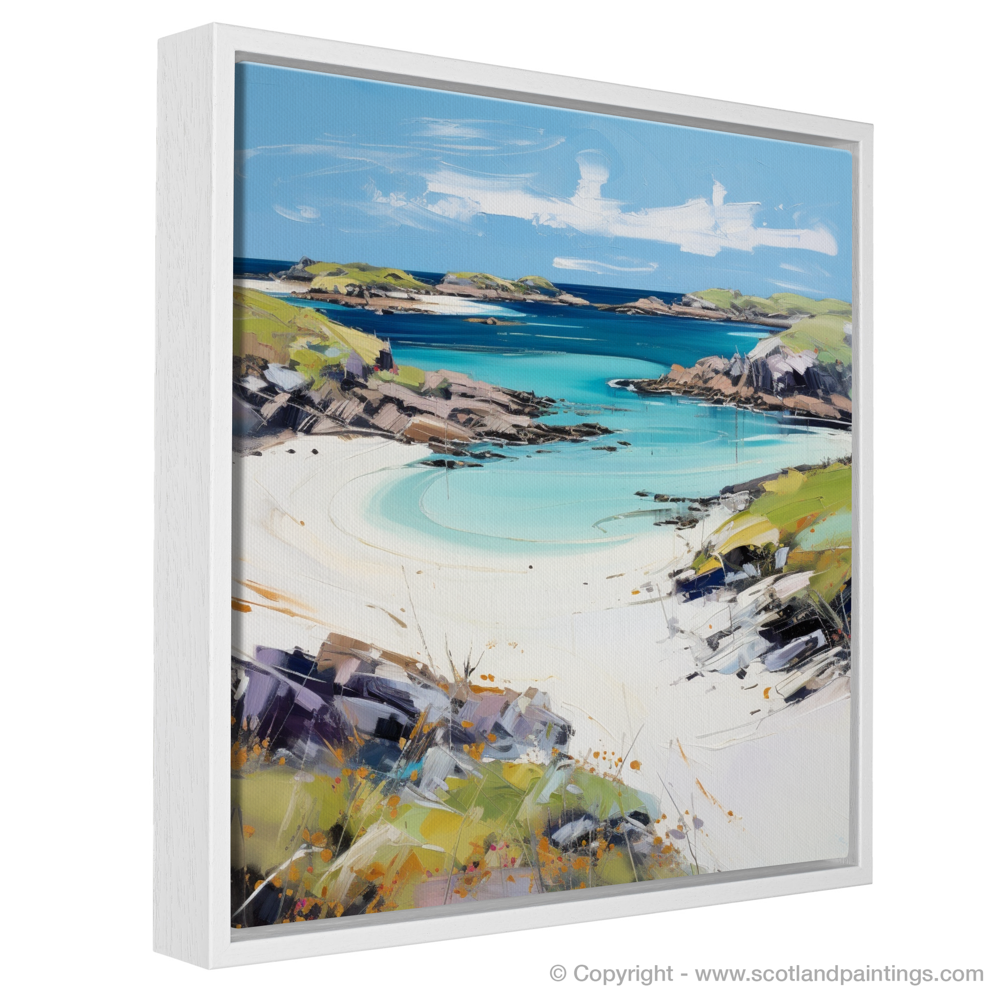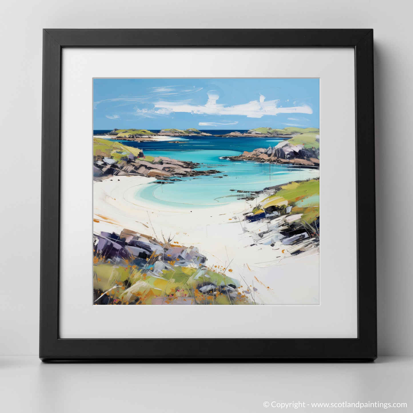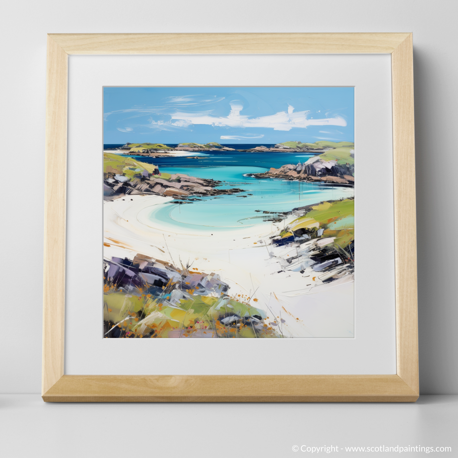 Immerse yourself in the transformative allure of a Scottish seaside haven with this captivating abstract interpretation of Achmelvich Bay. With a palette that boasts effervescent blues and serene whites, this piece echoes the crisp, invigorating air of the highland shores. Each stroke on the canvas swirls with the rhythmic dance of the waves, while dashes of vivid aquamarine and subtle cerulean embody the crystal-clear waters for which Achmelvich is renowned.