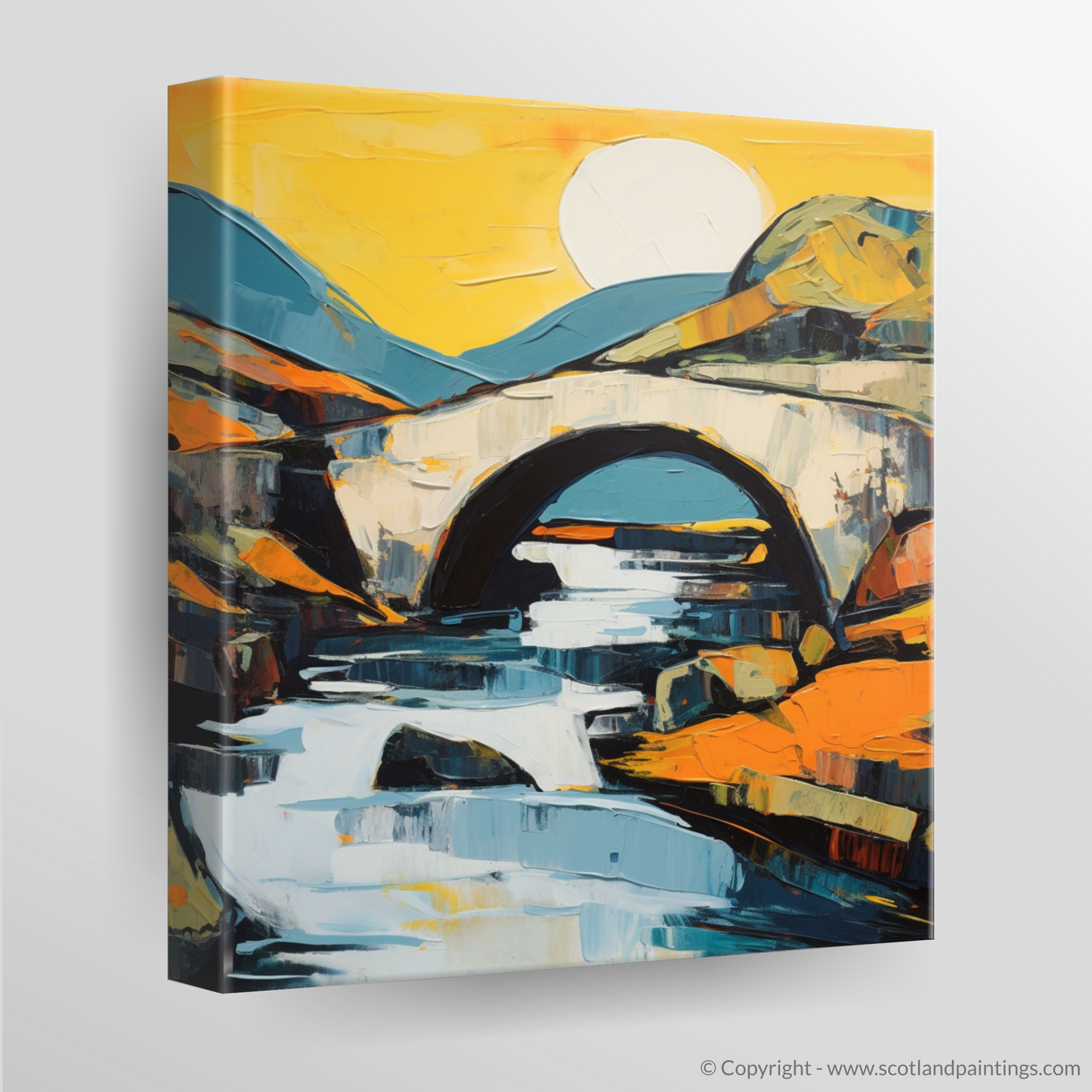 Mirroring the bridge's bold curvature are the soft, undulating hills that recede gently into the horizon. A dramatic sky unfurls above in a rich tapestry of golden yellows and soft blues, with the white sun holding court in a breathtaking dance of light and shadow. This juxtaposition creates a sense of enduring warmth and brilliant illumination, reminiscent of the closing act of a summer's day in the Scottish Highlands.