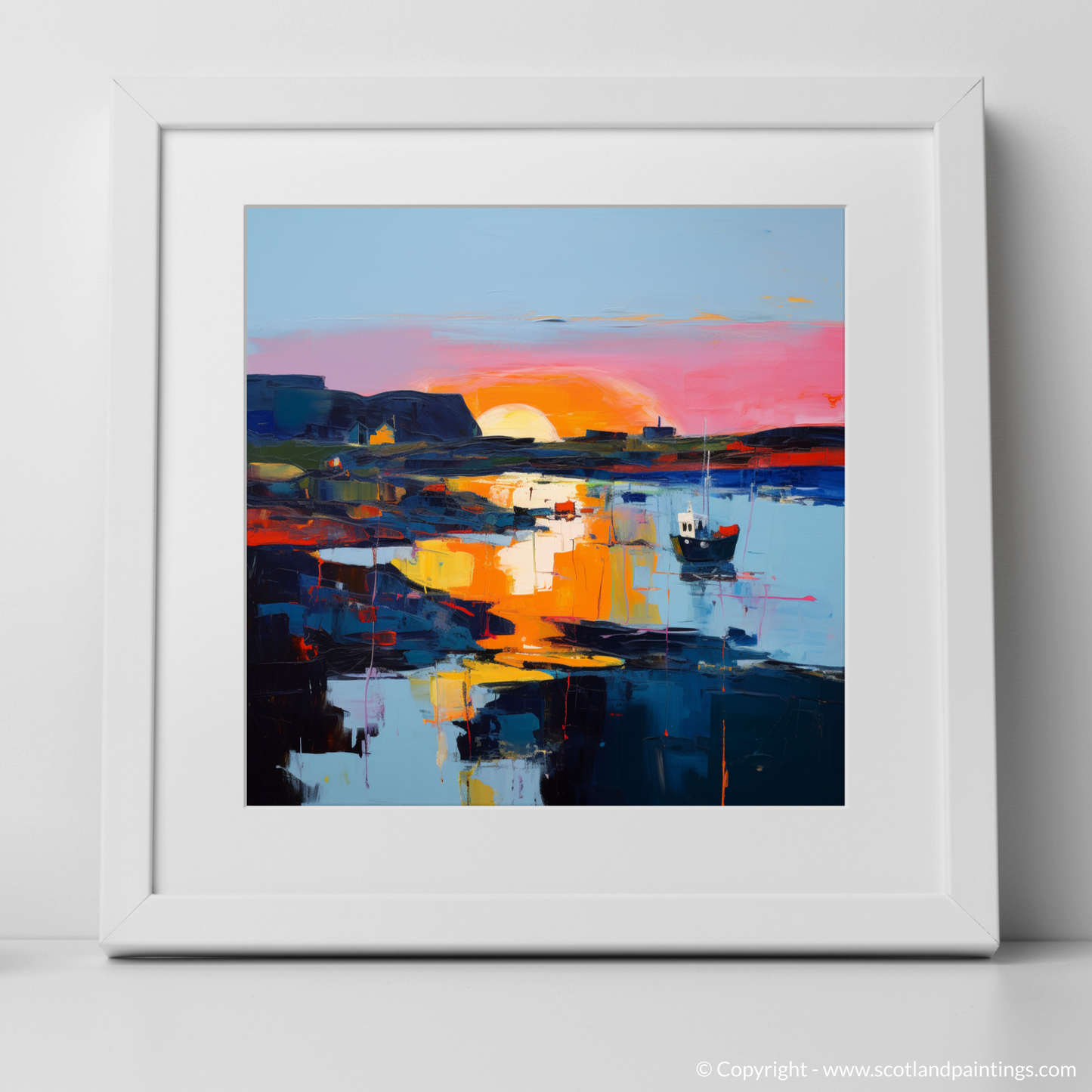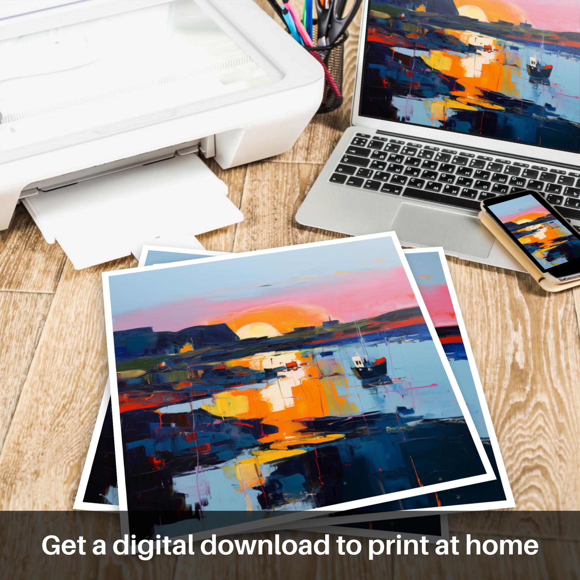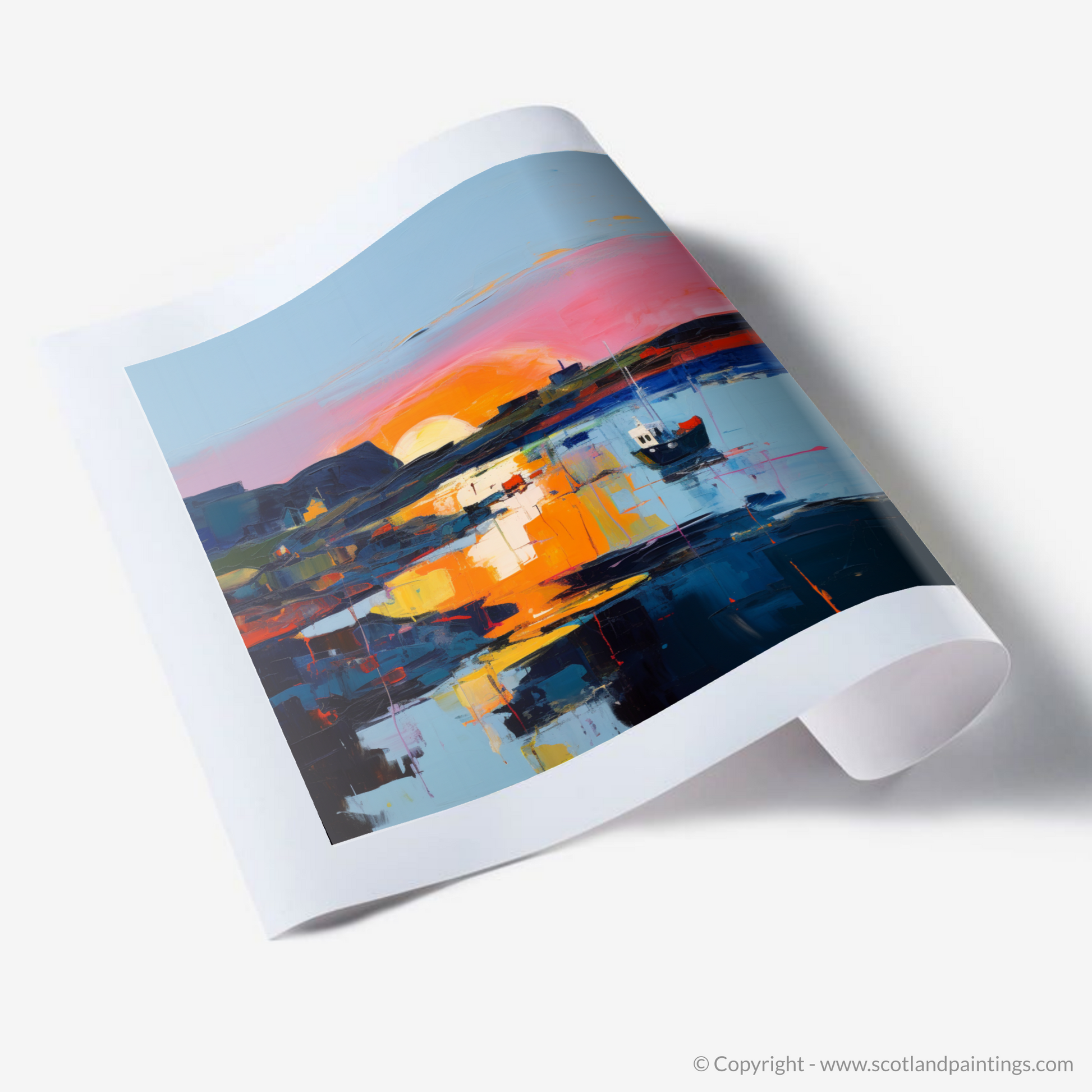As the evening sun dips below the horizon, casting a warm glow over Tayvallich Harbour, this captivating abstract print conjures the serene atmosphere of a Scottish coastal retreat at dusk. Swathes of vibrant orange, fiery red, and soothing pink stretch across the sky, reflected in the tranquil waters below, where darker shades of blue and hints of inky black provide a dramatic contrast. The abstract shapes and bold strokes of colour suggest the outline of a quaint harbour, with elements resembling boats gently rocking in the harbour and the silhouette of distant hills standing sentinel.