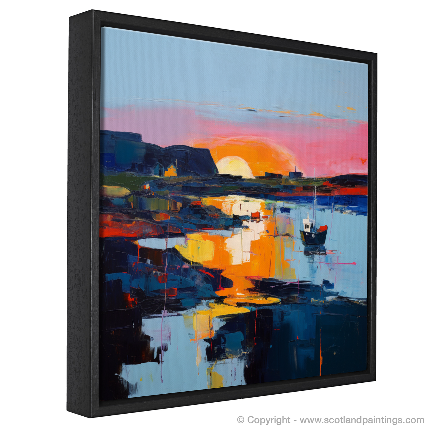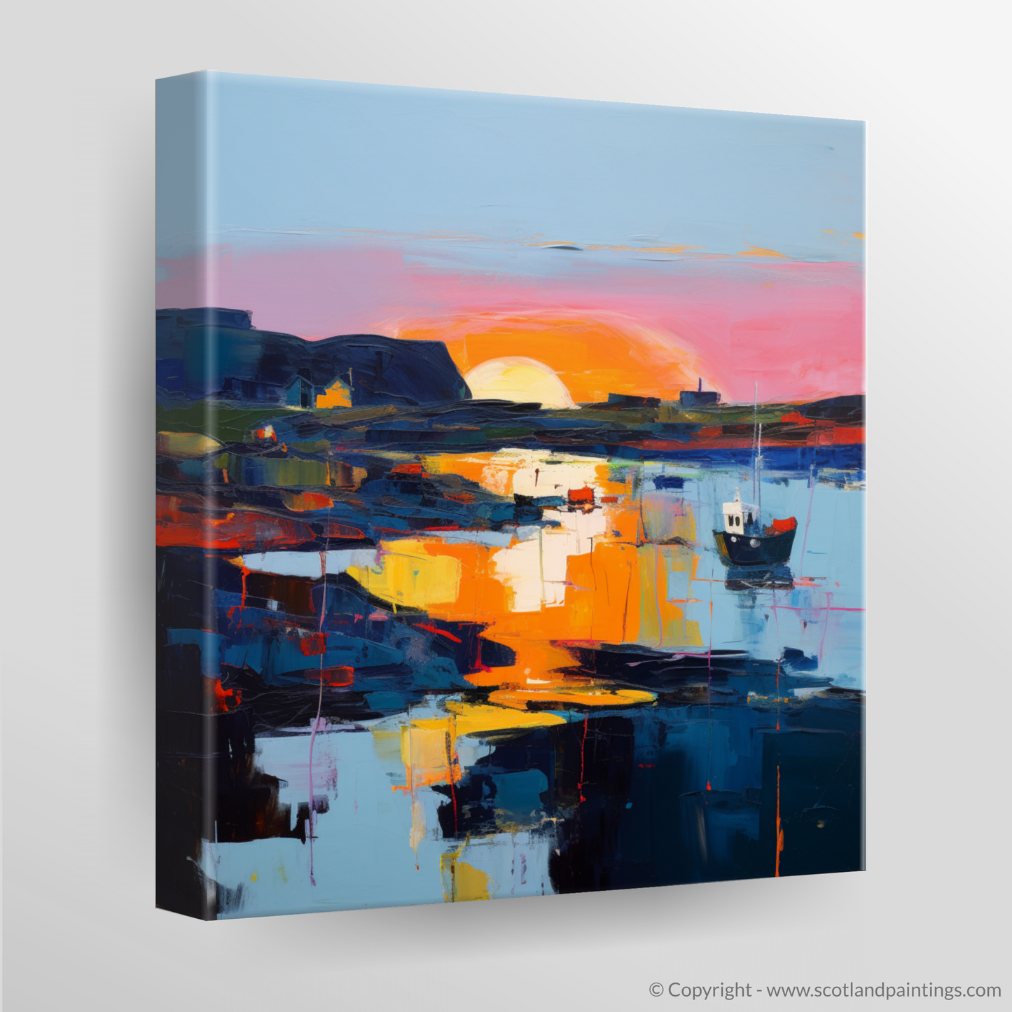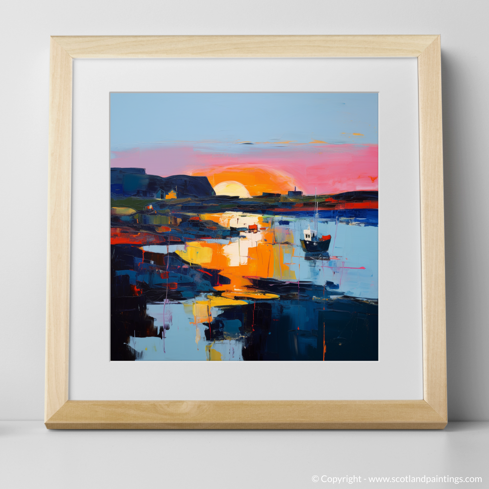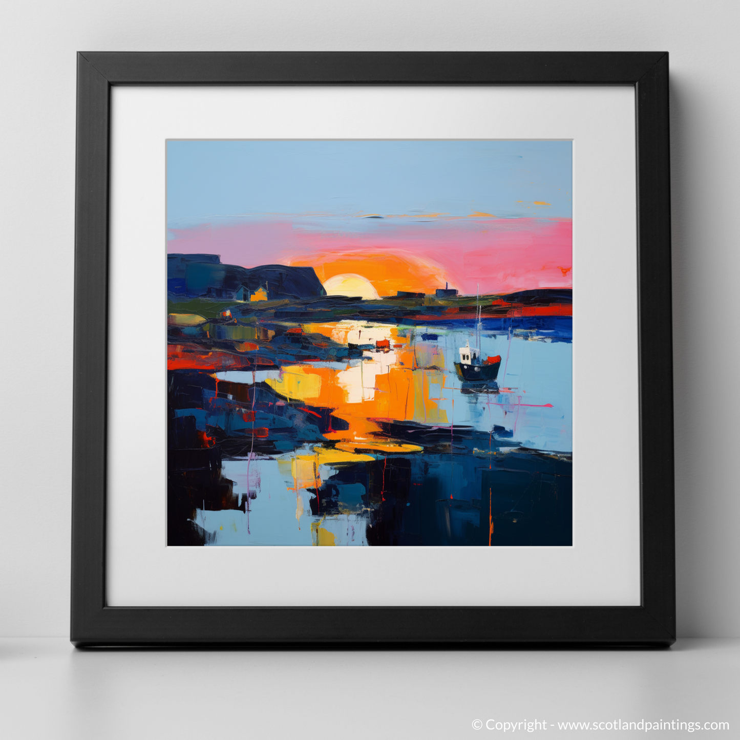 As the evening sun dips below the horizon, casting a warm glow over Tayvallich Harbour, this captivating abstract print conjures the serene atmosphere of a Scottish coastal retreat at dusk. Swathes of vibrant orange, fiery red, and soothing pink stretch across the sky, reflected in the tranquil waters below, where darker shades of blue and hints of inky black provide a dramatic contrast. The abstract shapes and bold strokes of colour suggest the outline of a quaint harbour, with elements resembling boats gently rocking in the harbour and the silhouette of distant hills standing sentinel.