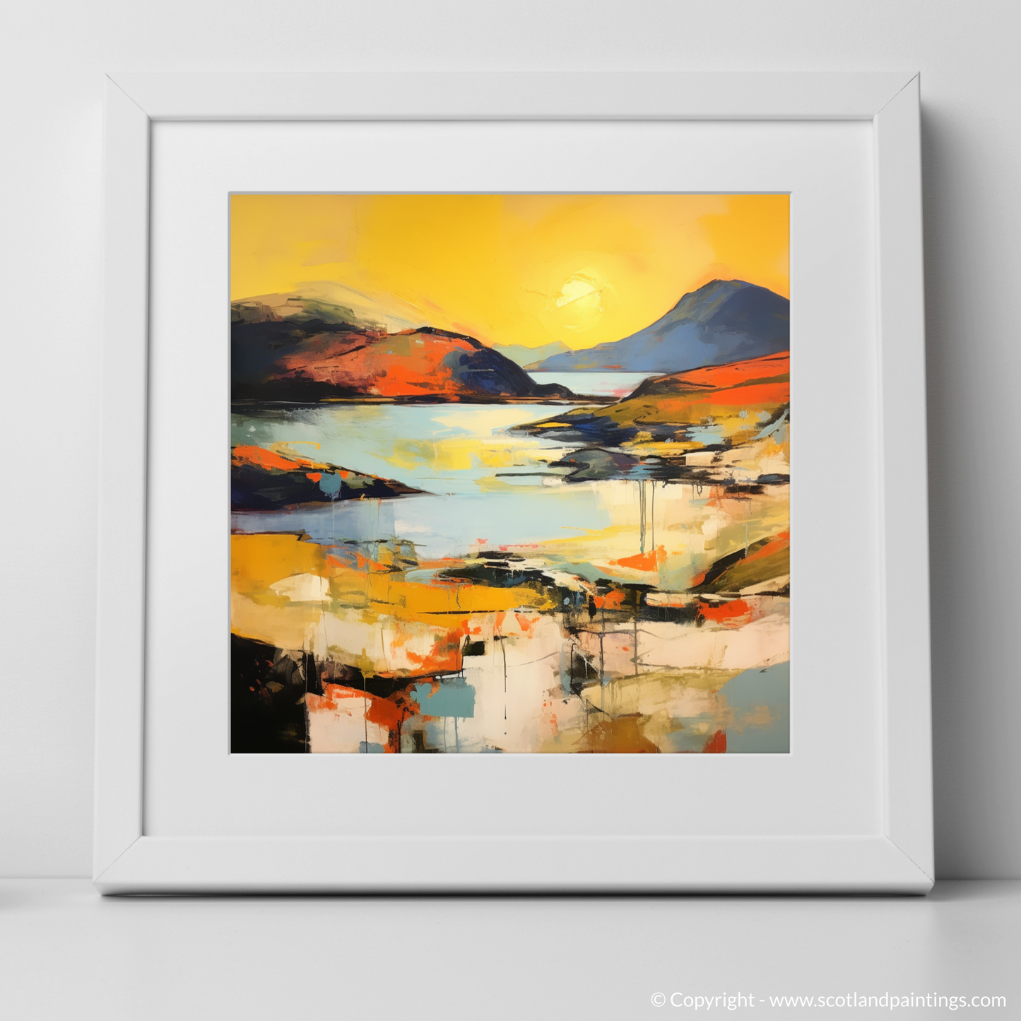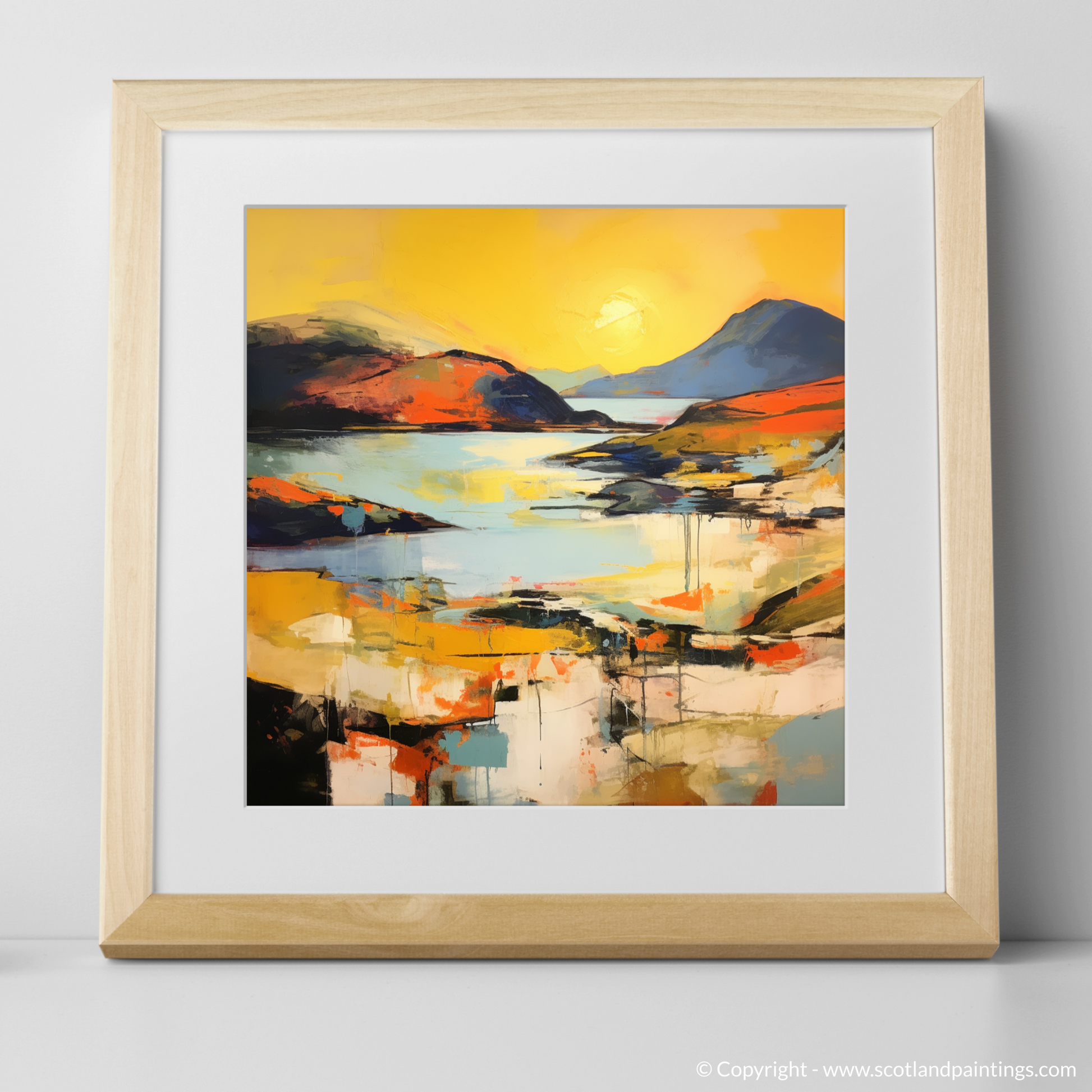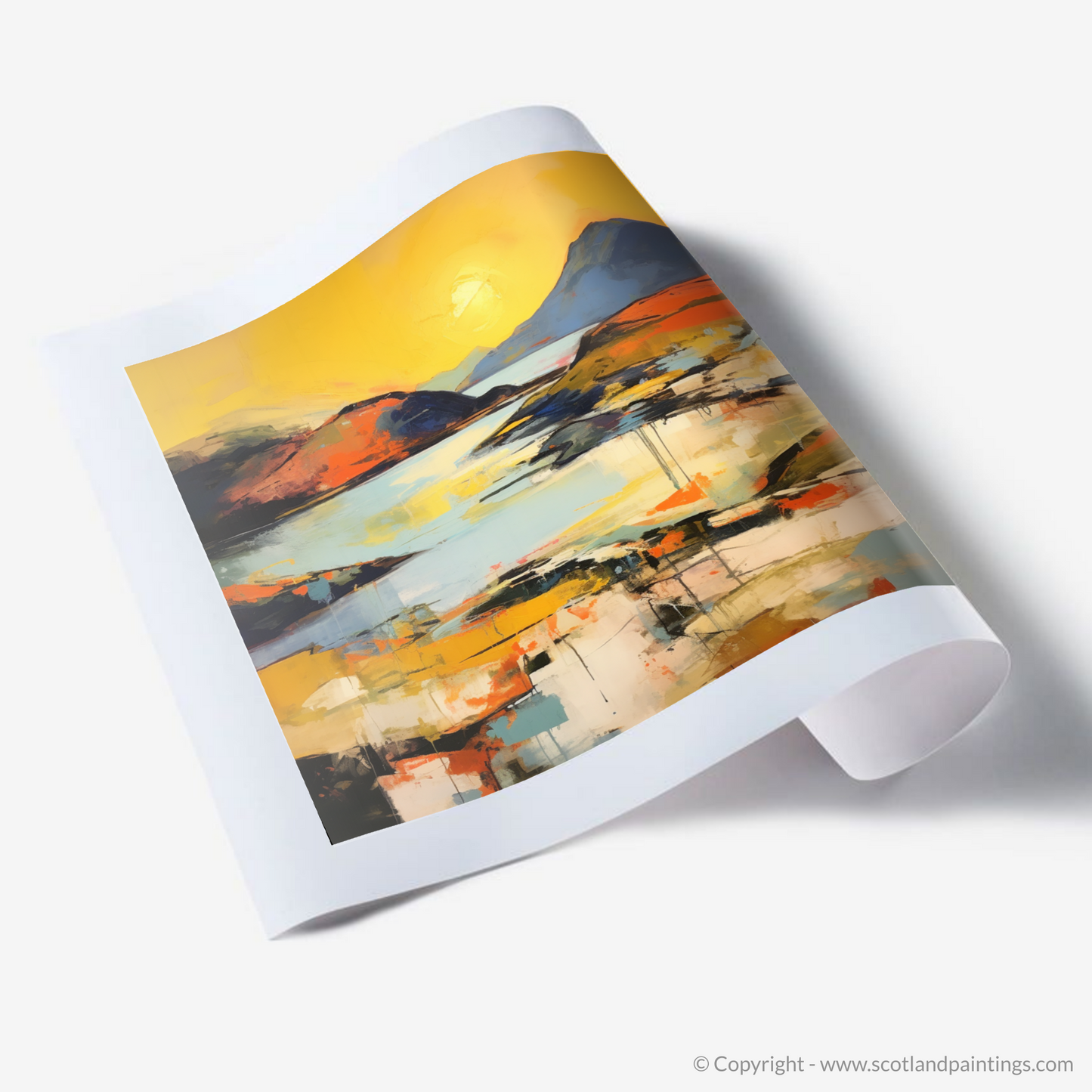 Capturing the ephemeral beauty of Scourie Bay bathed in the sublime light of golden hour, this abstract print invites viewers into a scene that balances the boundary between reality and imagination. Swathes of vibrant orange, fiery reds, and warm yellows dance across the canvas, evoking the feeling of the sun's last embrace as it kisses the picturesque Scottish landscape goodbye.