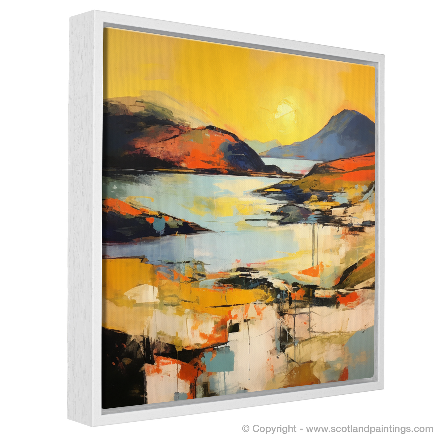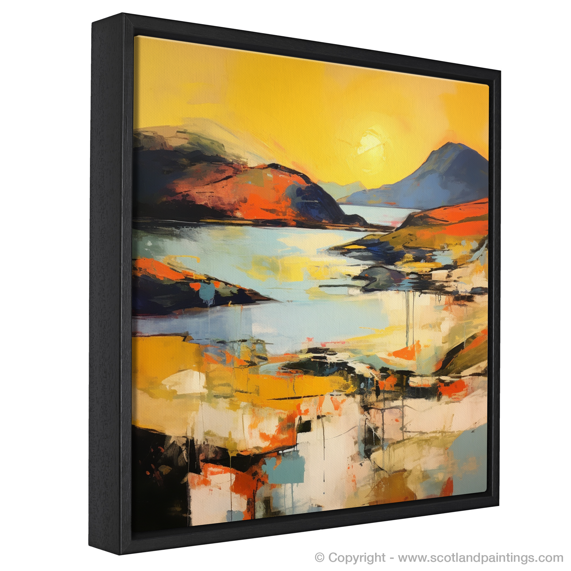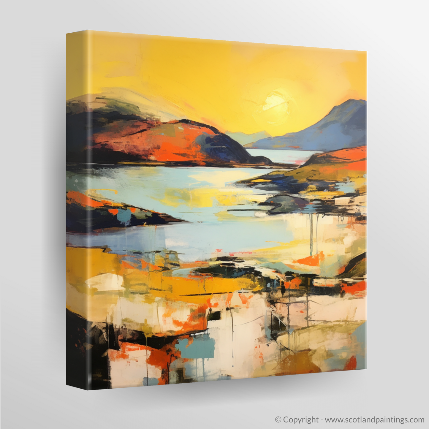 Capturing the ephemeral beauty of Scourie Bay bathed in the sublime light of golden hour, this abstract print invites viewers into a scene that balances the boundary between reality and imagination. Swathes of vibrant orange, fiery reds, and warm yellows dance across the canvas, evoking the feeling of the sun's last embrace as it kisses the picturesque Scottish landscape goodbye.