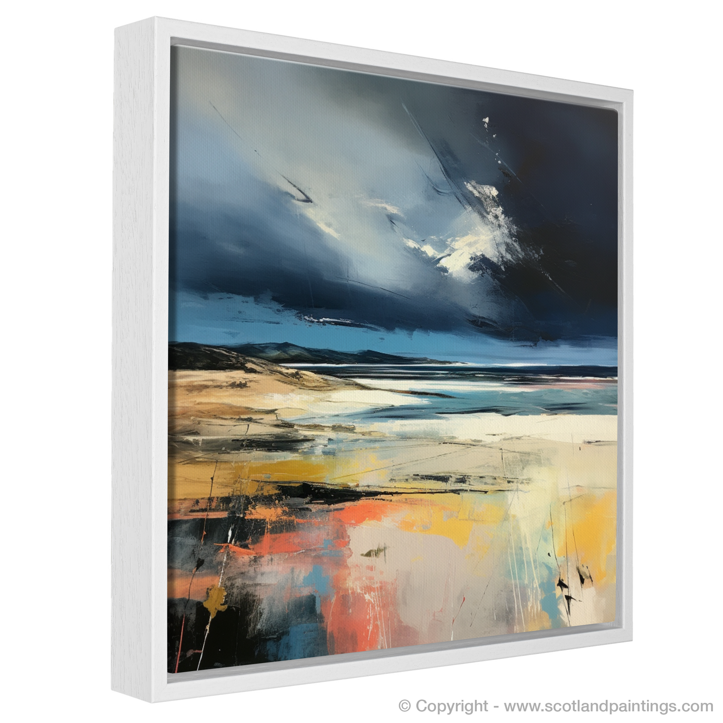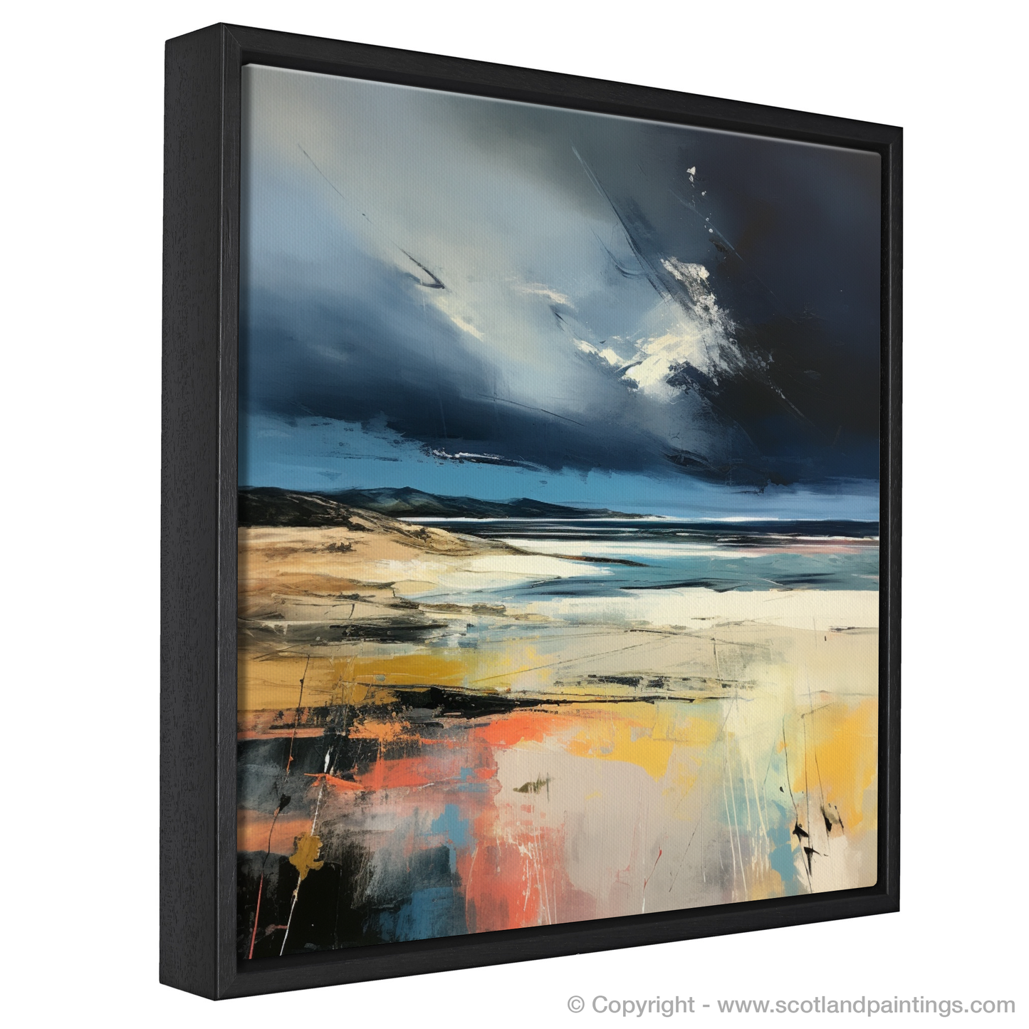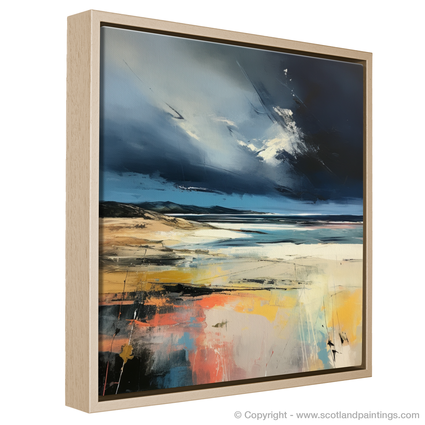 Capturing the dynamic essence of Scotland's coastal glory, this evocative abstract print embodies the untamed spirit and raw beauty of Nairn Beach under a tempestuous sky. Swathes of brooding midnight blues and stormy greys dominate the upper canvas, artfully conveying the tumultuous mood of a Scottish sky about to unleash its fury.