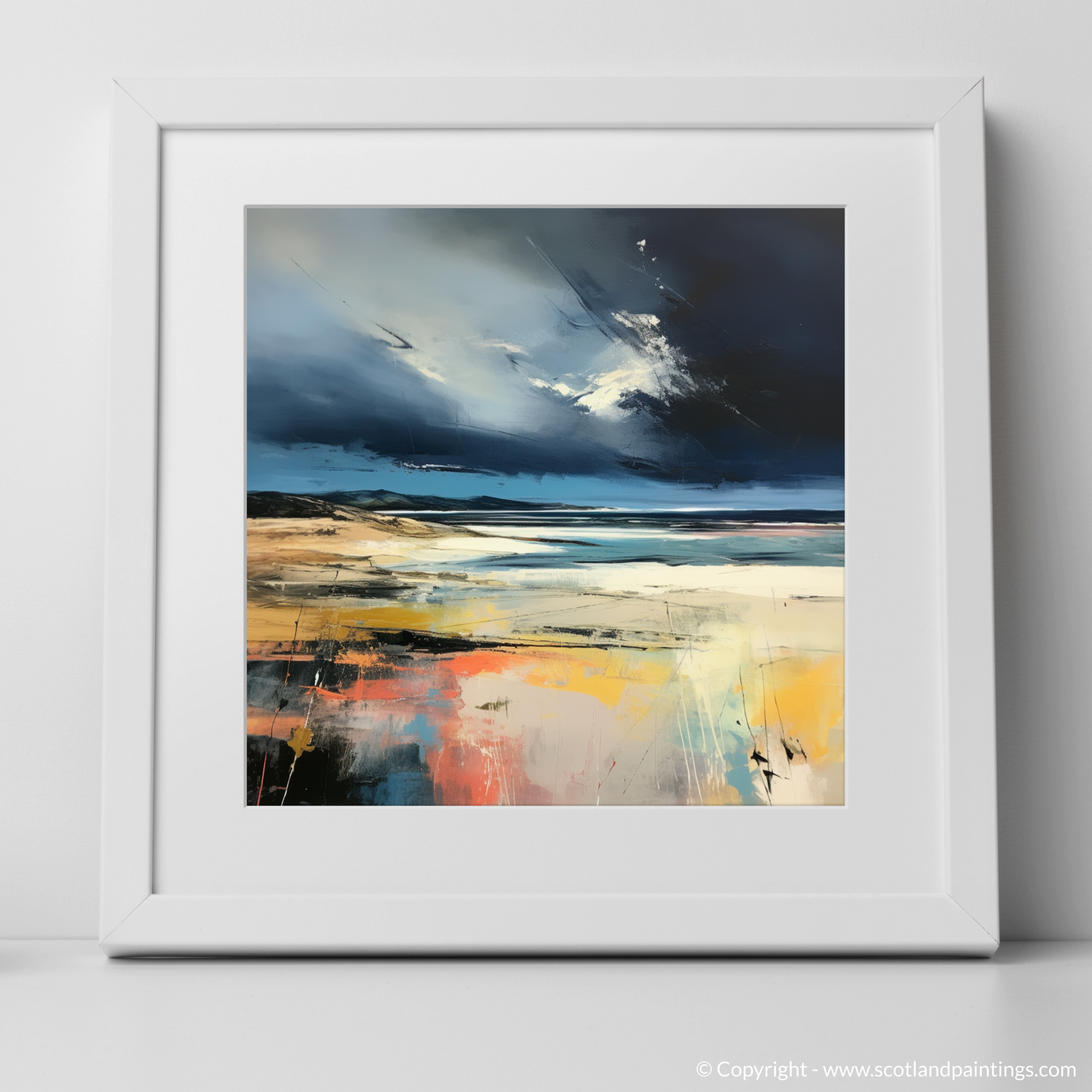 This print, a part of the 'Scottish Beaches' collection, goes beyond mere representation. It invites the viewer to feel the wind, hear the whispers of the impending downpour, and reflect on the stark beauty of nature's contrasts. It's an impeccable choice for collectors and admirers of landscapes that are not just seen, but felt. Whether hung in a minimalist modern space or a room rich with natural textures, this print will command attention and stir the imagination.