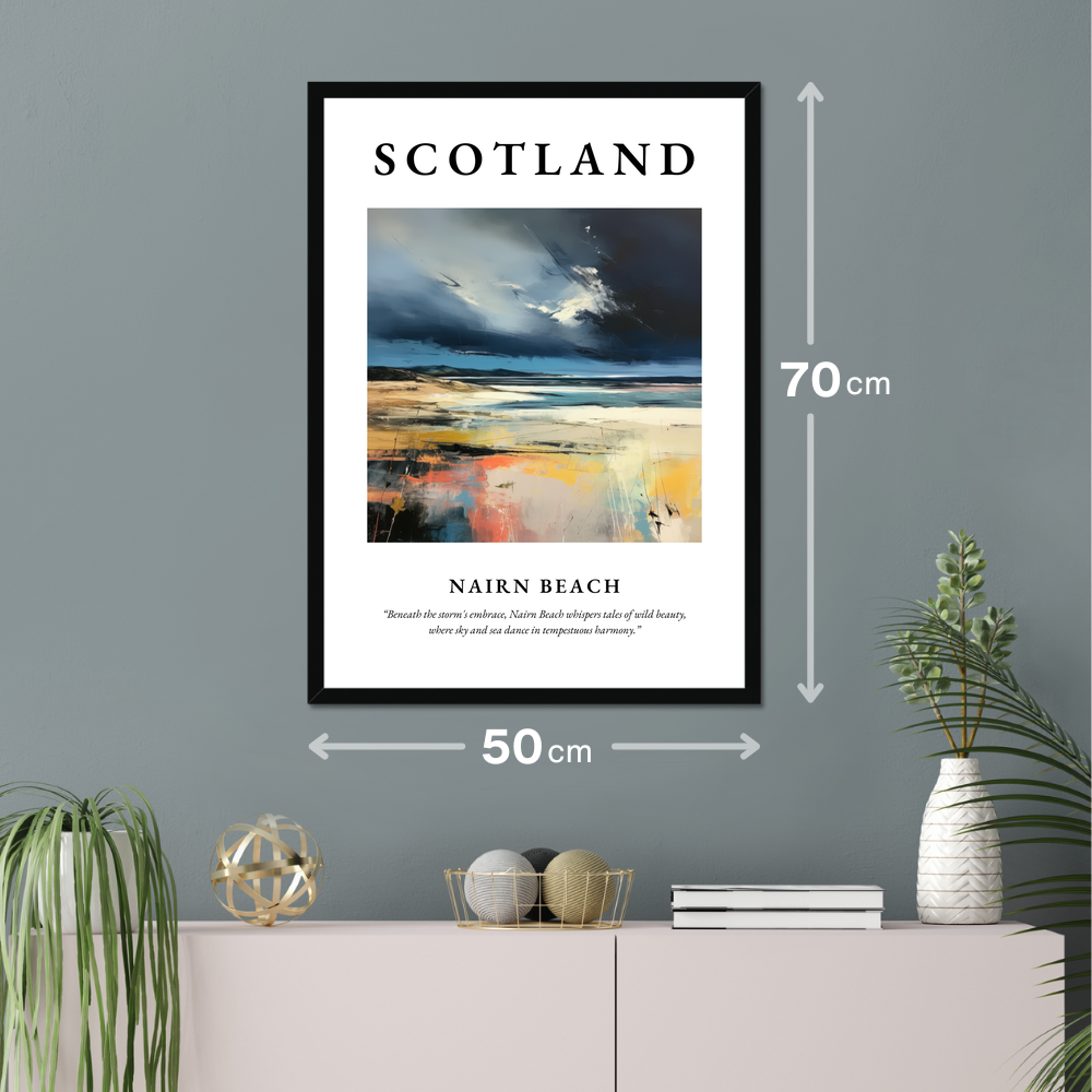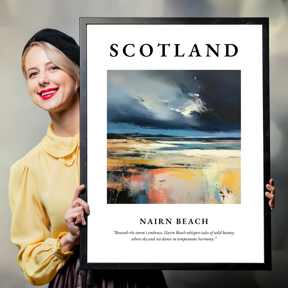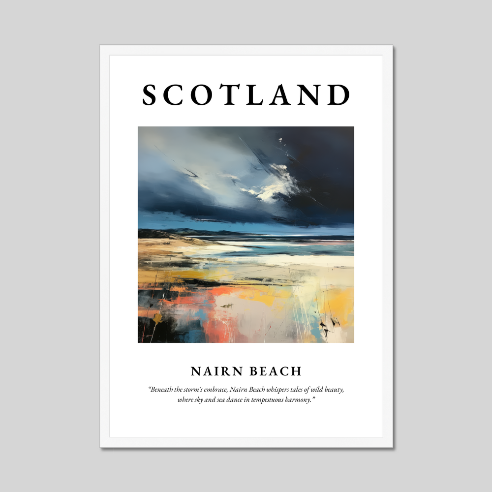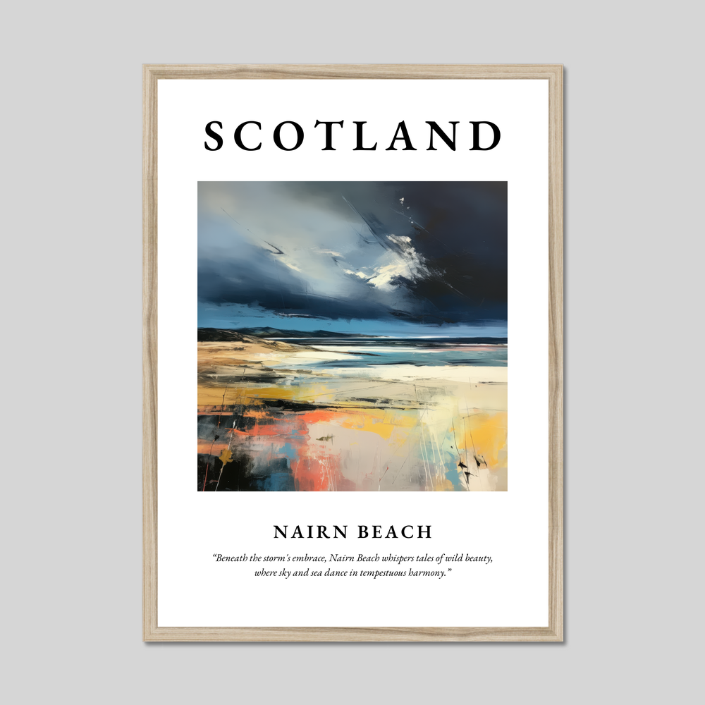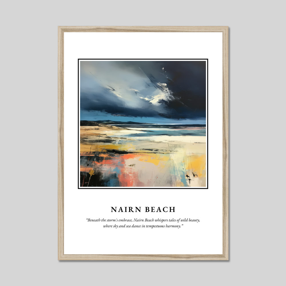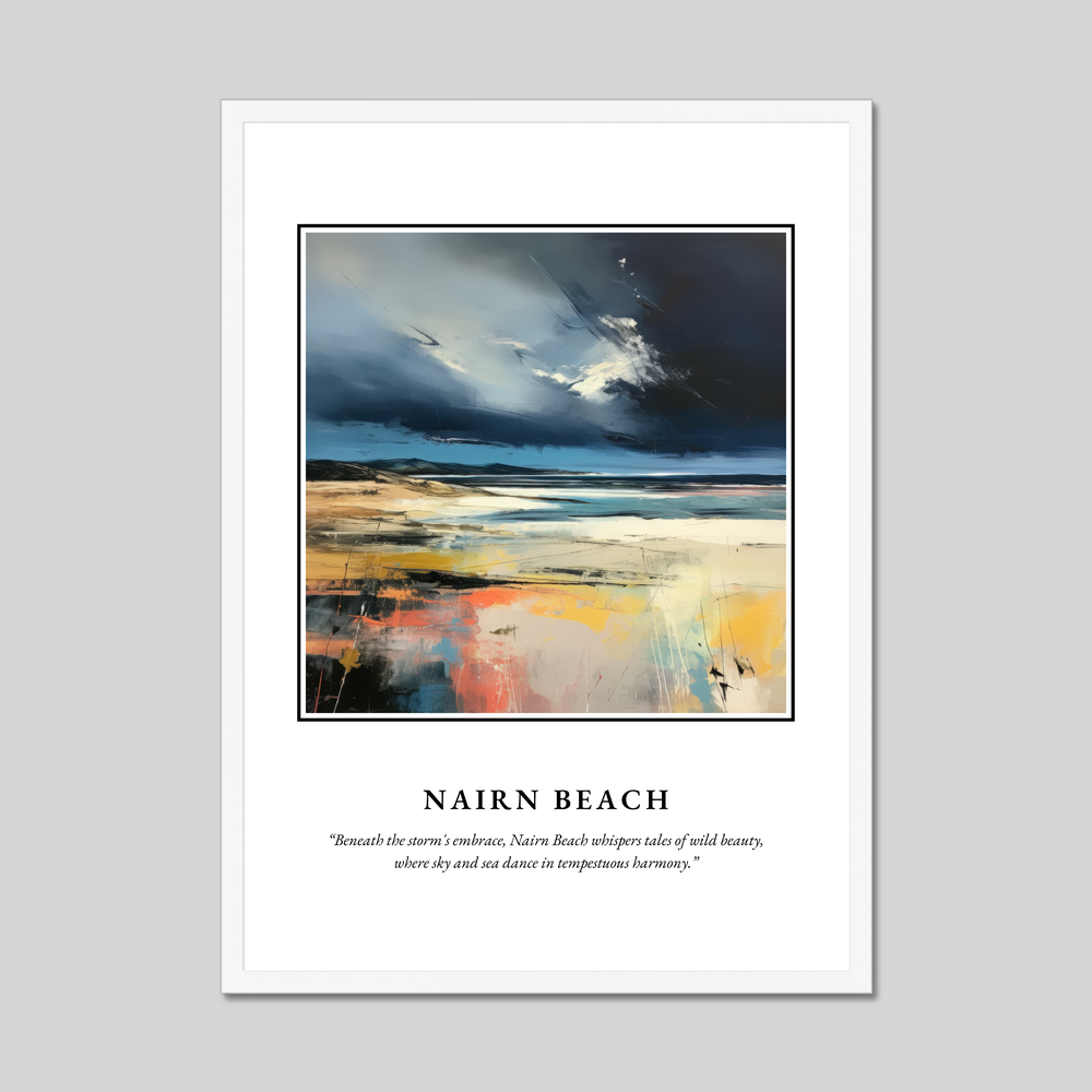 The artwork within reveals a symphony of stormy skies blending seamlessly with the ocean’s restless waves, evoking the emotional depth and wildness of this Scottish treasure. Beneath this visual masterpiece lies the poetic line, “Beneath the storm's embrace, Nairn Beach whispers tales of wild beauty, where sky and sea dance in tempestuous harmony,” capturing the essence of the scene.