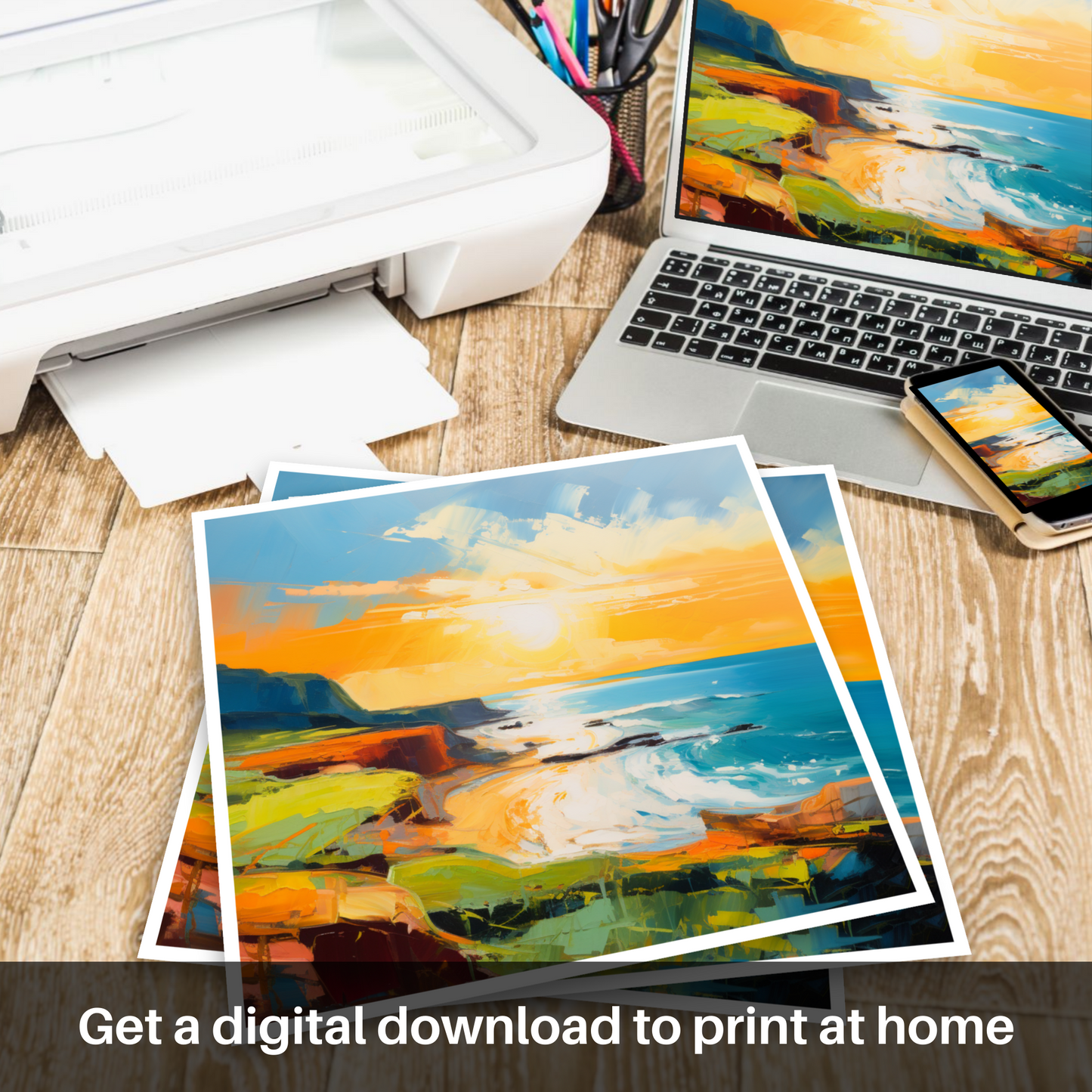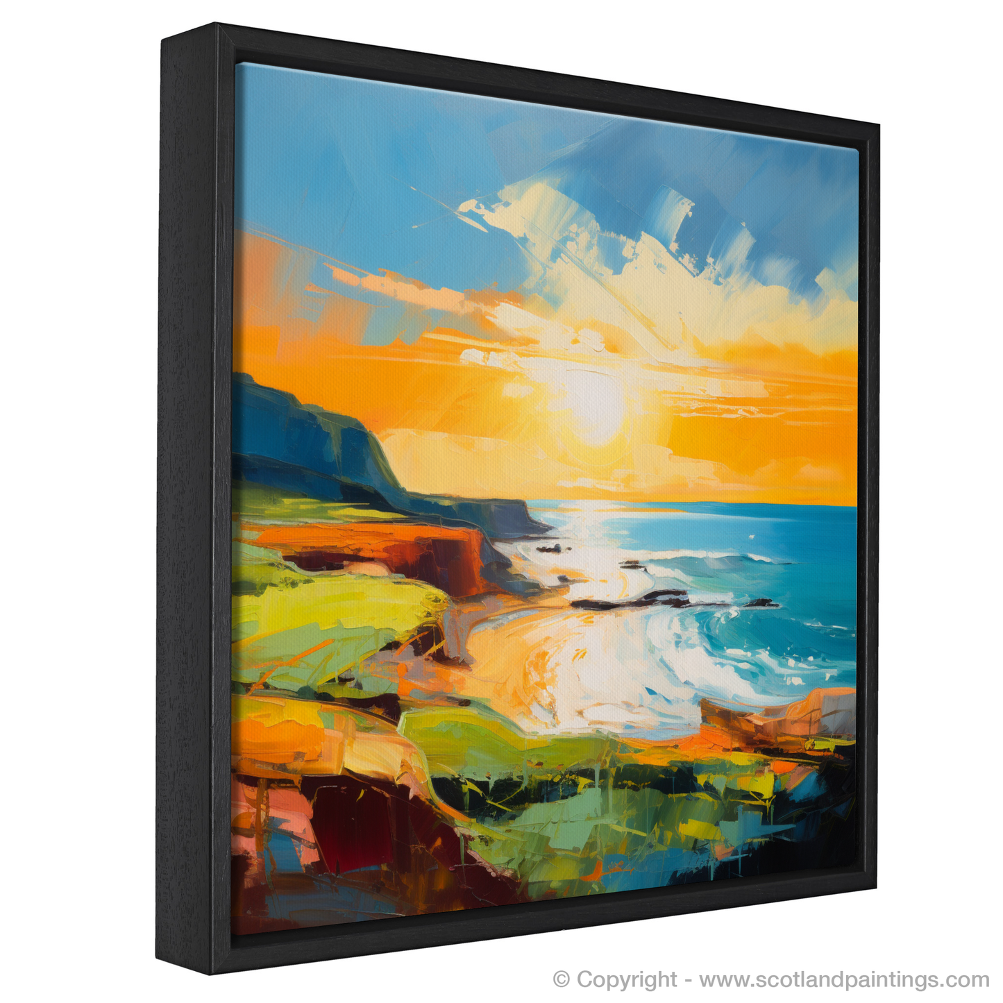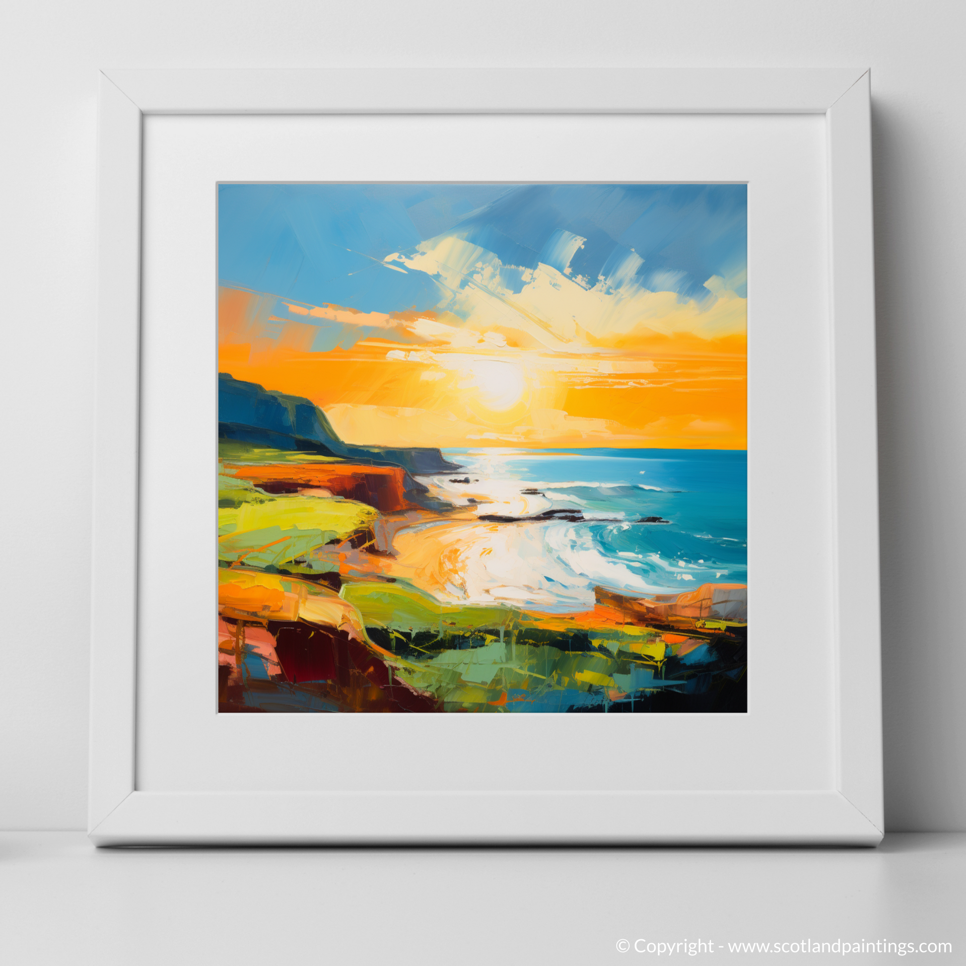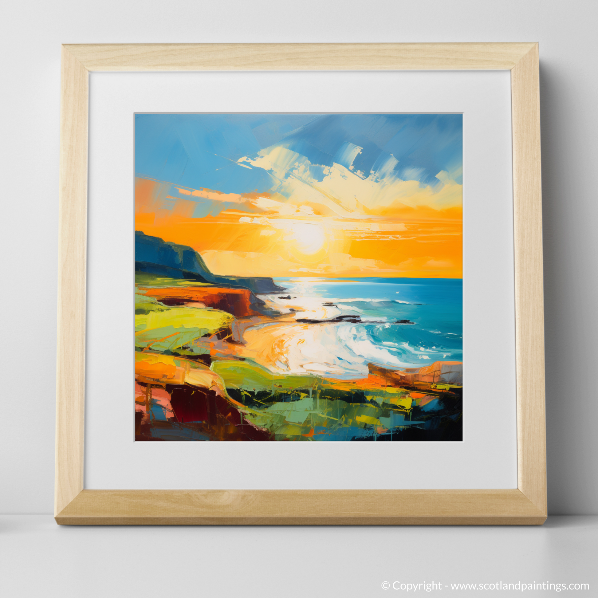 Immerse yourself in the vibrant hues that encapsulate the serene beauty of Coldingham Bay at the cusp of evening's glow with our exquisite seaside-inspired abstract print. This striking piece captures the essence of the Scottish shoreline bathed in the resplendent light of the golden hour, effortlessly evoking the gentle ebb and flow of the tide against the rugged landscape.