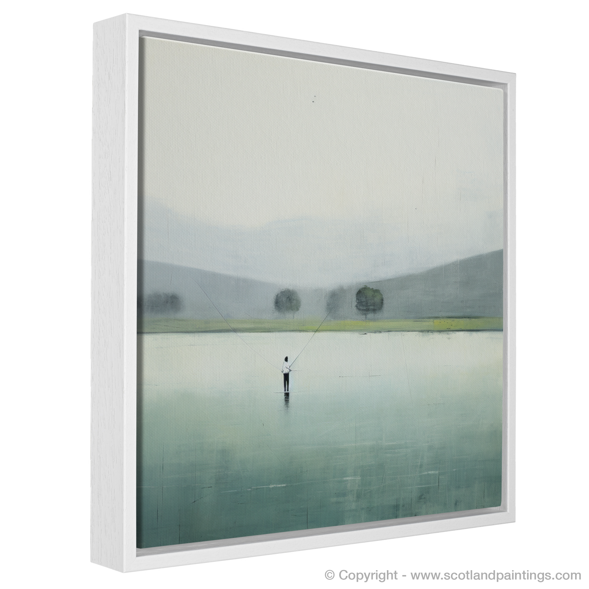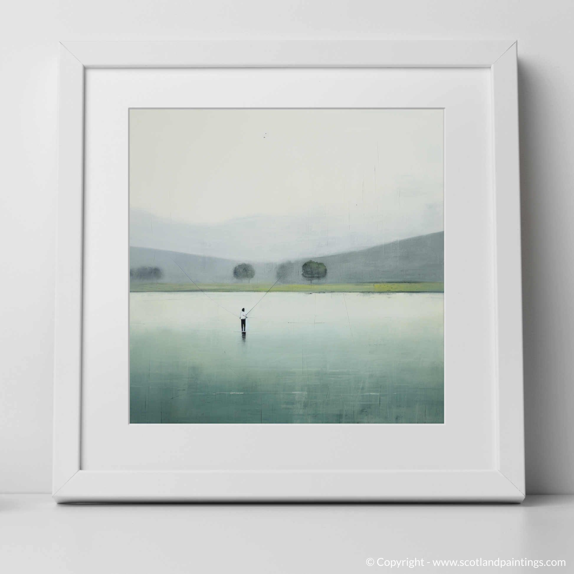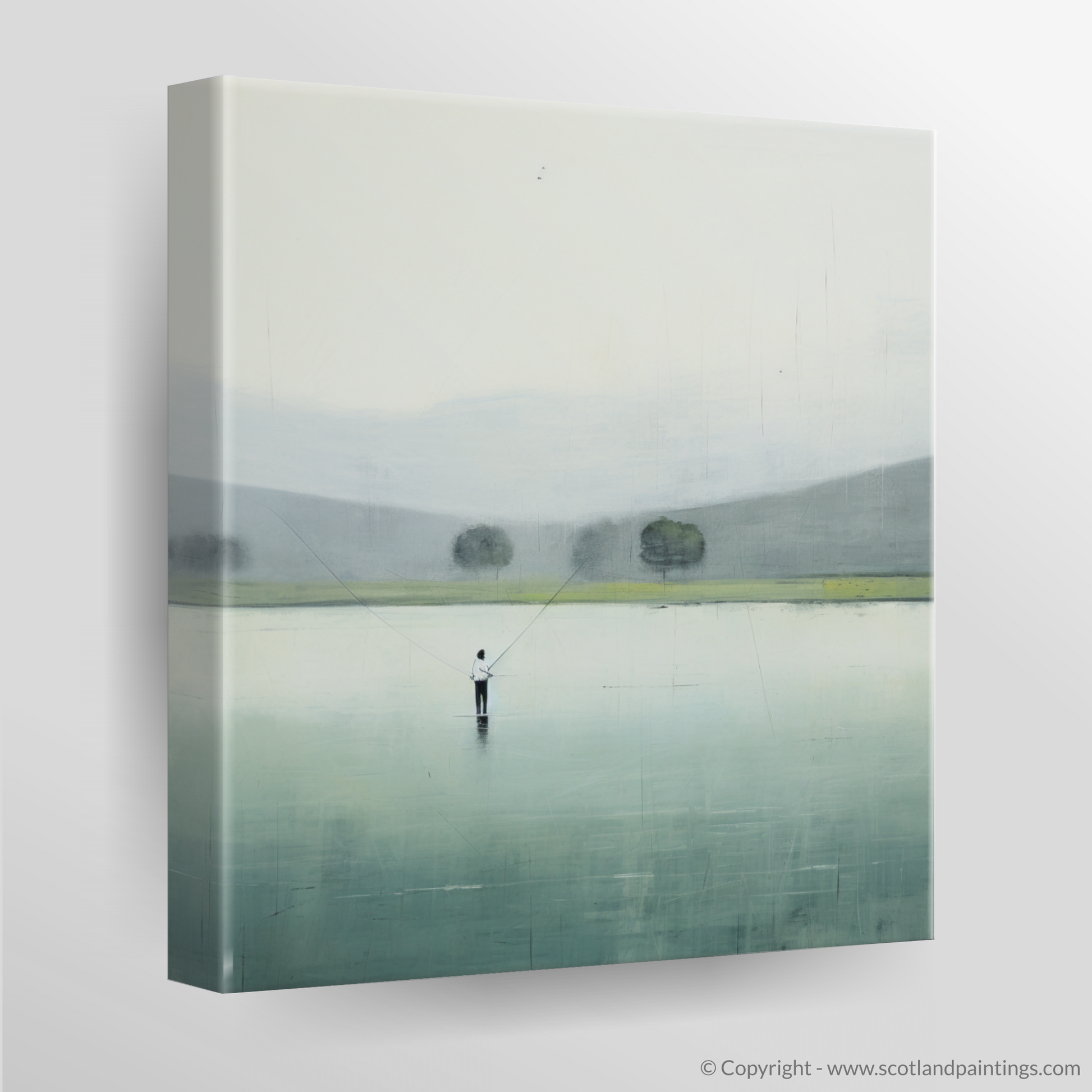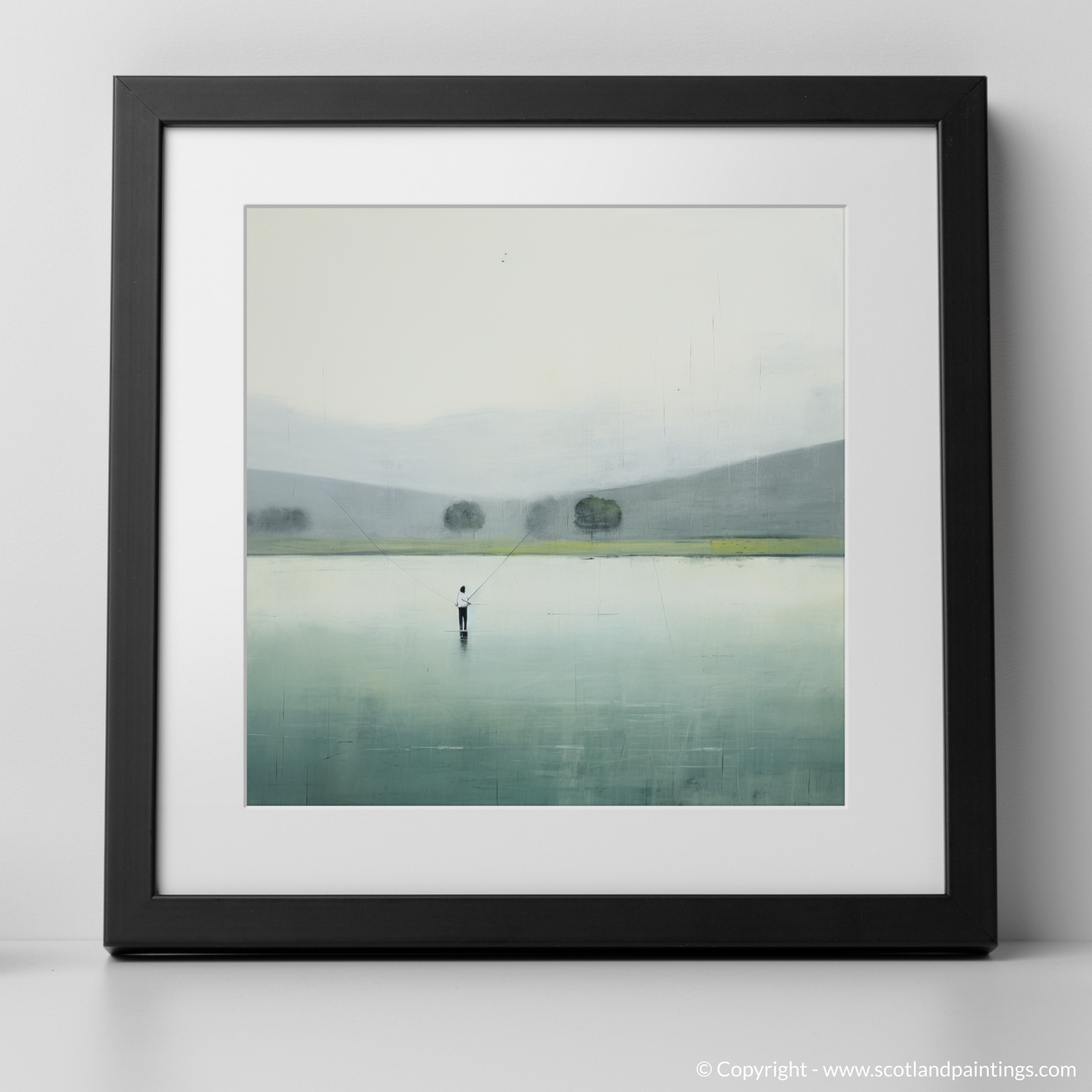 Immerse yourself in the serene allure of this abstract rendition capturing the essence of fly fishing on Scotland's tranquil River Teith. A soothing palette of muted greens, soft blues, and gentle greys blend harmoniously, inviting the viewer into a scene both calming and captivating. The central figure, a solitary fly fisher, stands immersed in the still water, poise captured in the arc of the fishing line that dances with the whispering breeze.