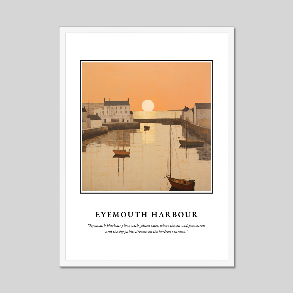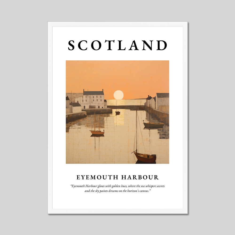 This captivating print features the word “SCOTLAND” boldly emblazoned at the top, drawing immediate attention to the country's enchanting charm. Below, an abstract painting of Eyemouth Harbour comes to life, evoking the rich hues of a golden evening where the sea whispers and the sky dreams. The work's abstract style beautifully captures the vivid play of light and shadow on the water, while the quaint harbour scene exudes a sense of peace and nostalgia. Below the painting, a poetic quote—“Eyemouth Harbour glows with golden hues, where the sea whispers secrets and the sky paints dreams on the horizon's canvas.”—adds a lyrical touch to the visual spectacle.