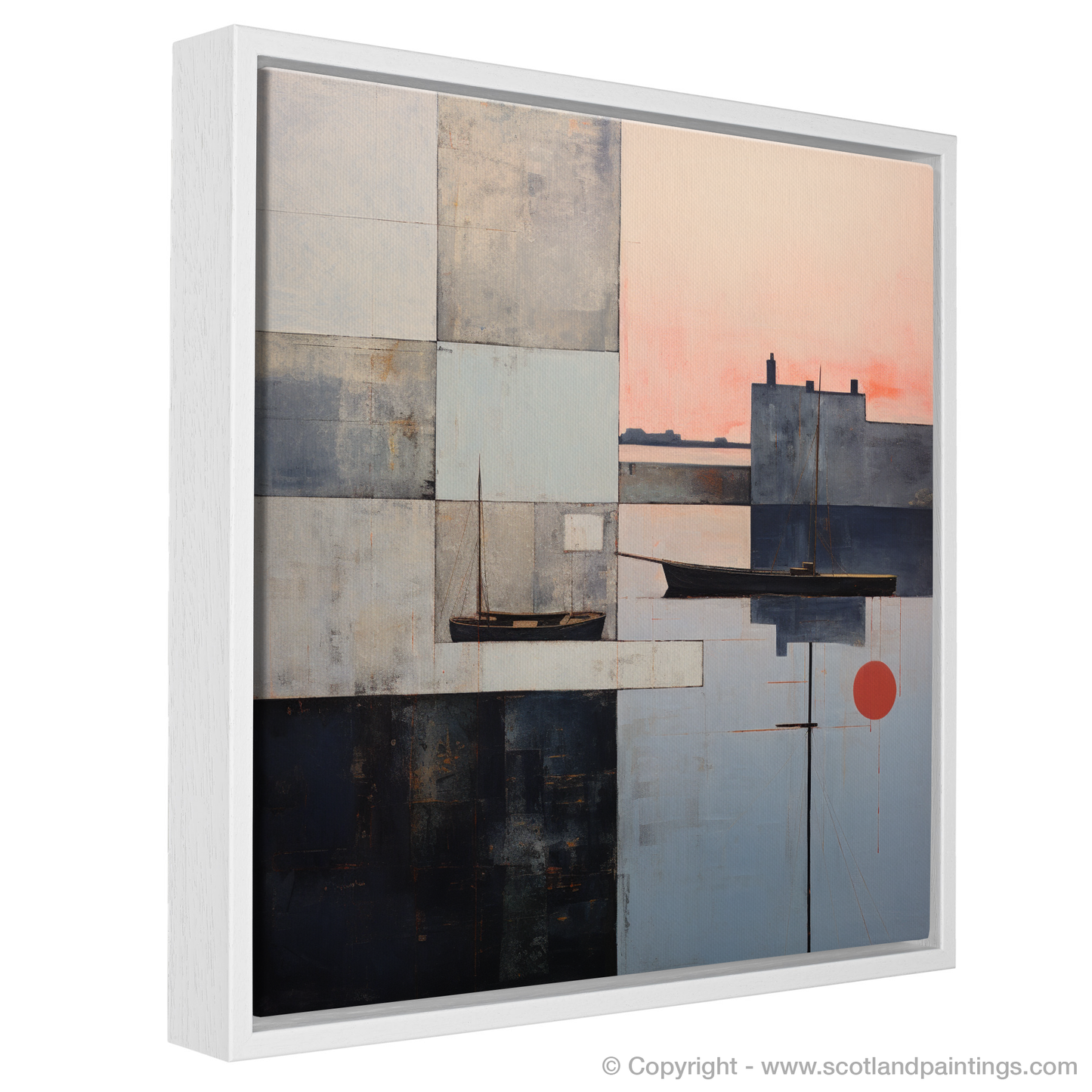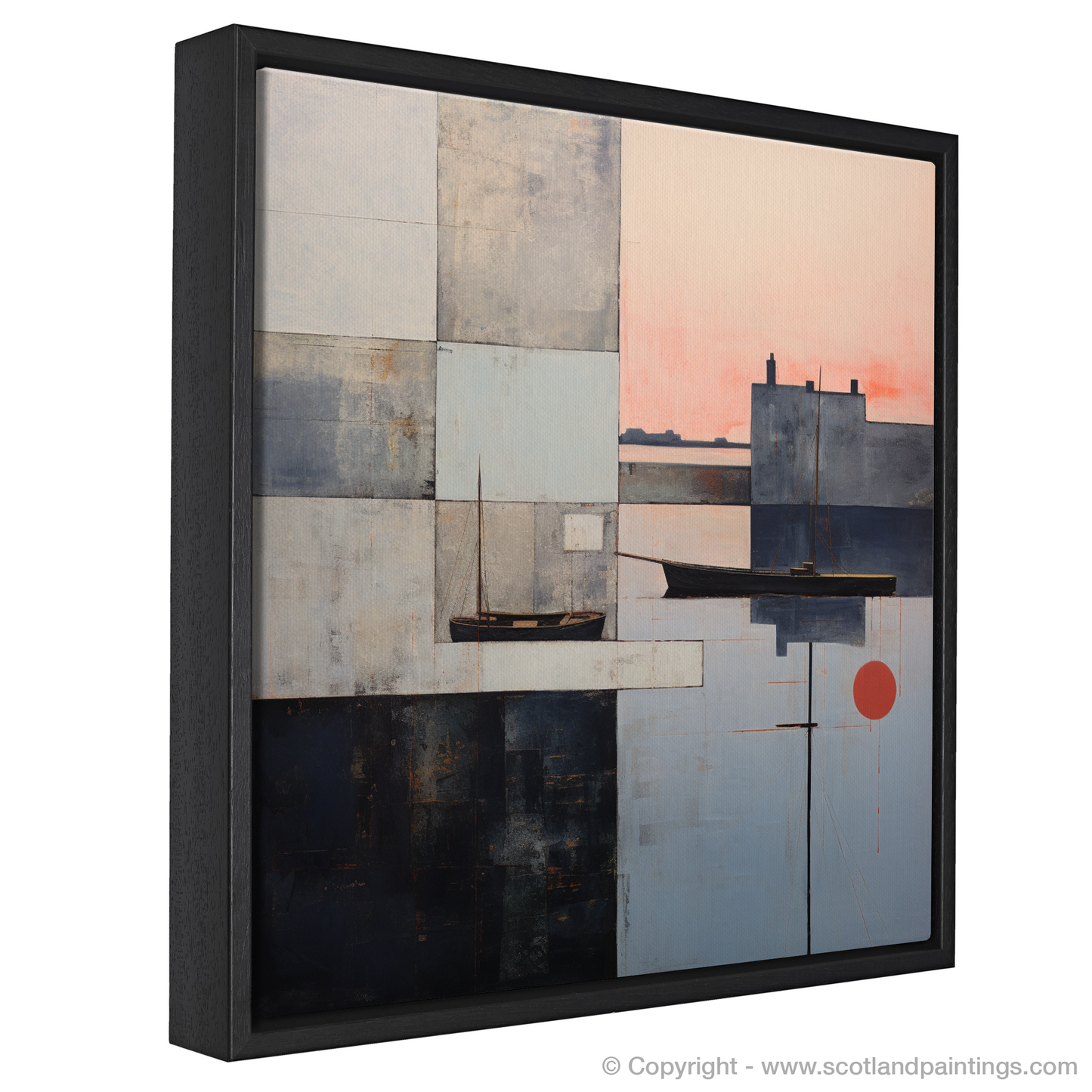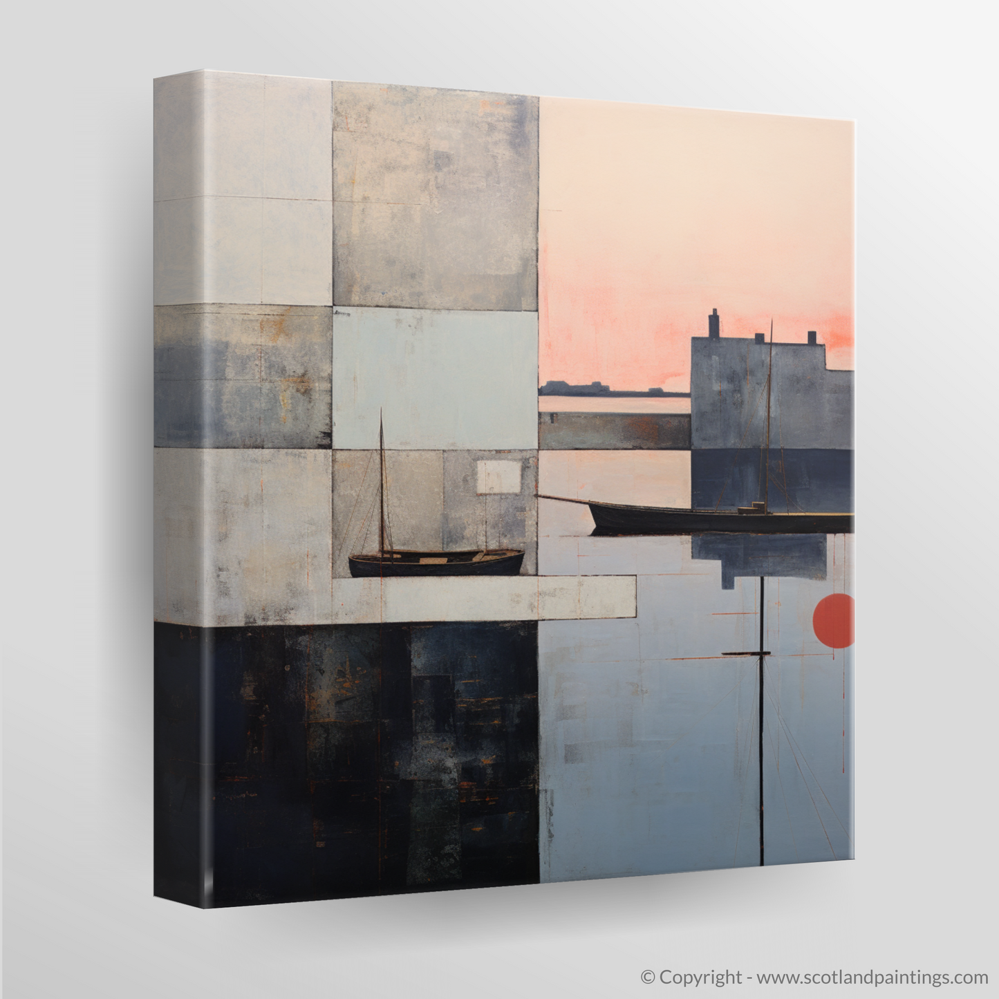 Capturing the ephemeral beauty of Eyemouth Harbour at the twilight hour, this abstract piece invites contemplation and serenity into any space. A symphony of contrasting shapes and forms play across the canvas, their harmonious yet unpredictable arrangement echoing the tranquil chaos of maritime life.