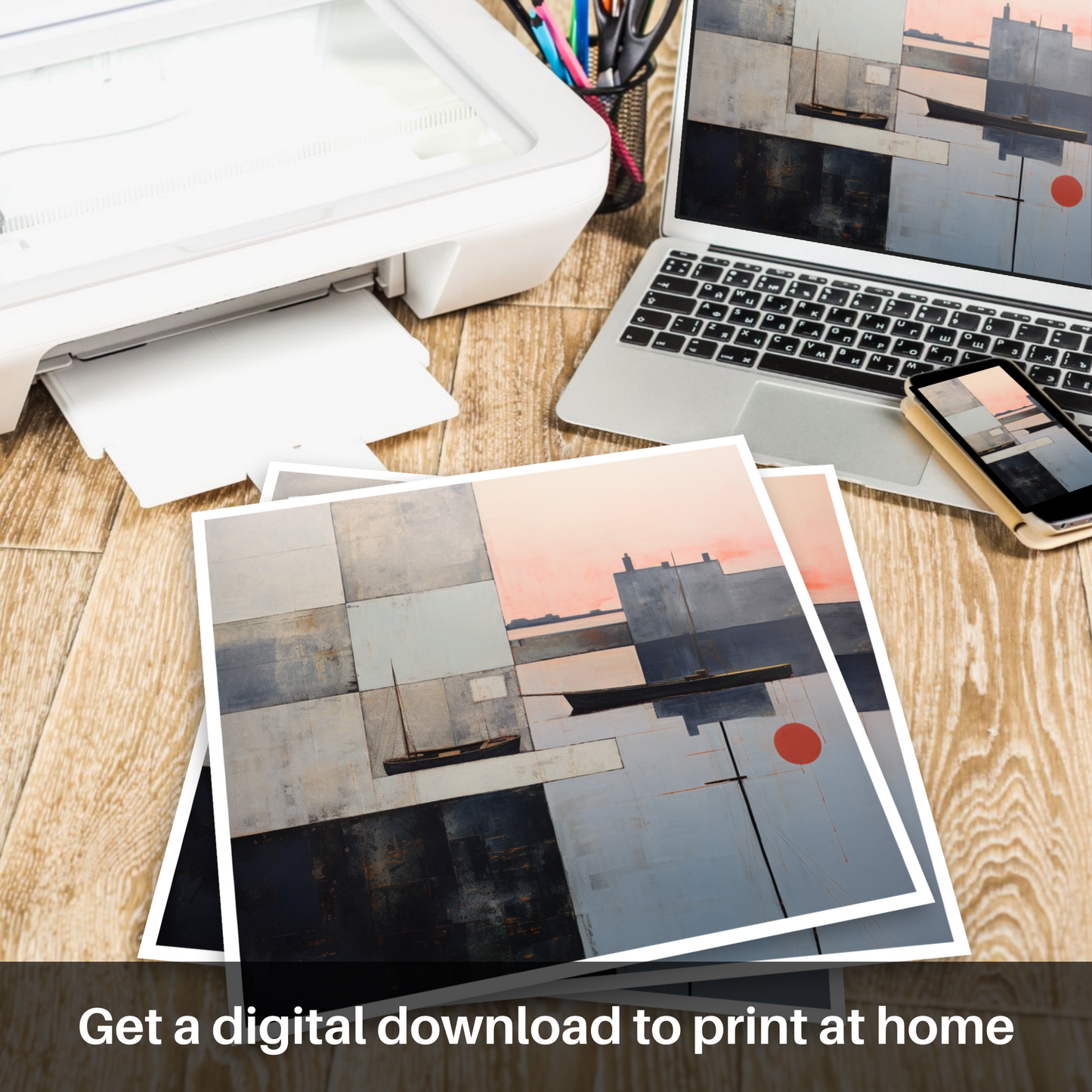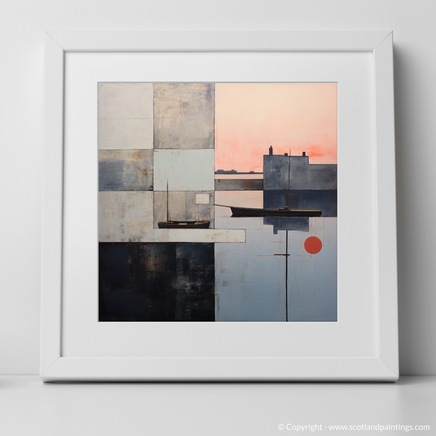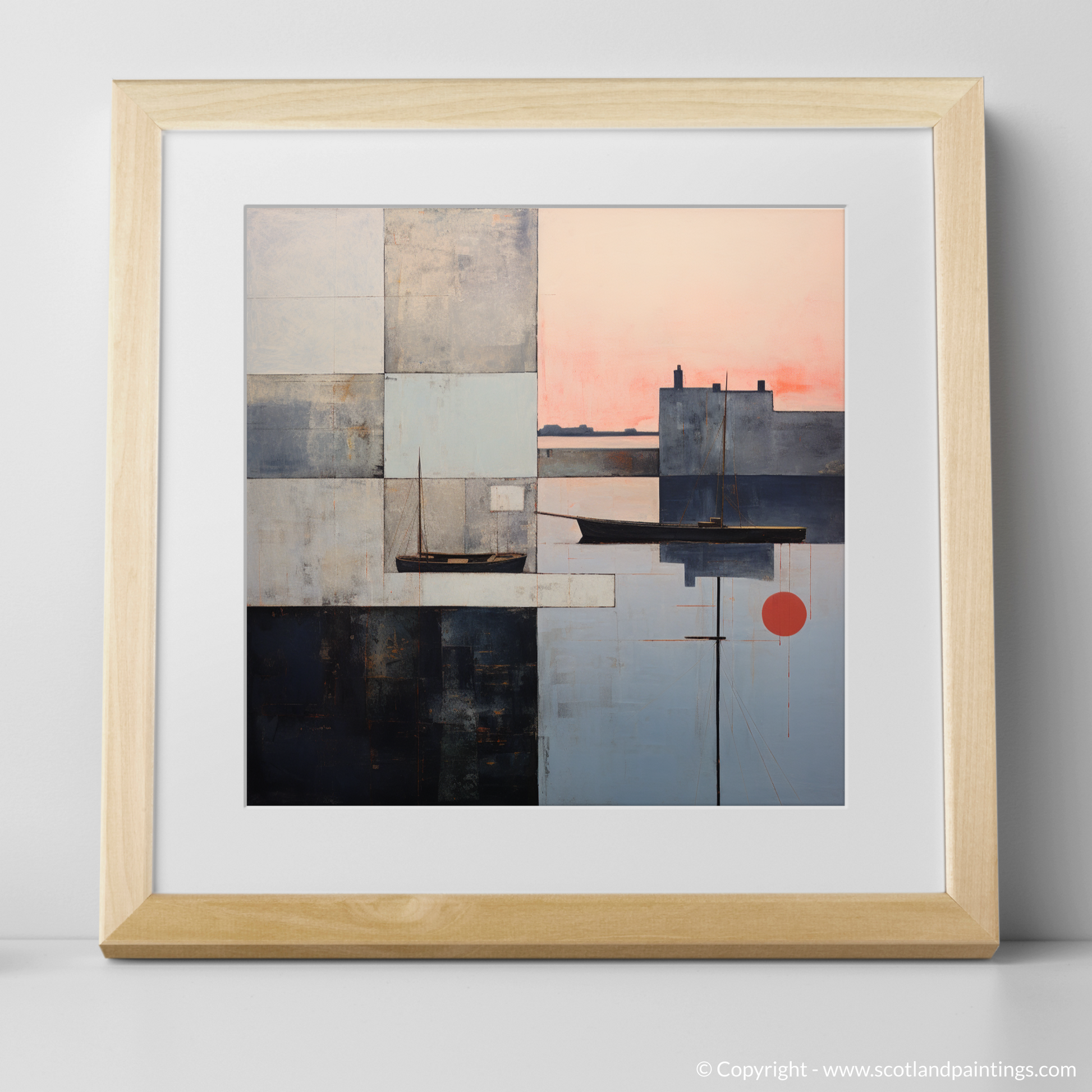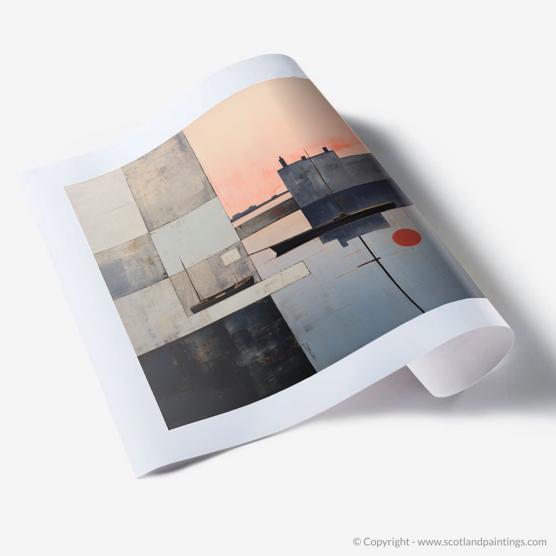 This abstract portrayal strips down the essential elements of the Scottish harbour, transforming it into a tapestry of geometric blocks and intersecting lines that invite the viewer to unravel the layers of meaning within. Embracing both stillness and motion, this print is a captivating homage to the enchanting hour when daylight gives way to the soft embrace of evening.