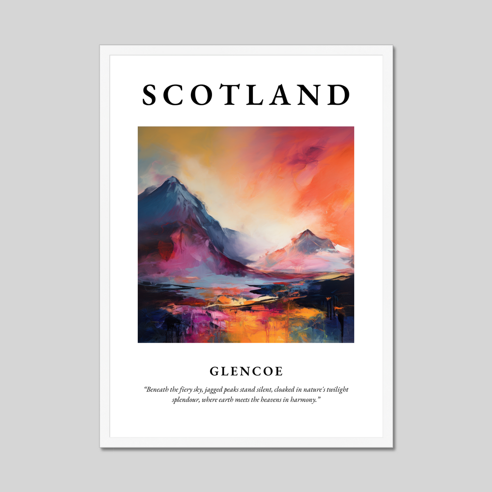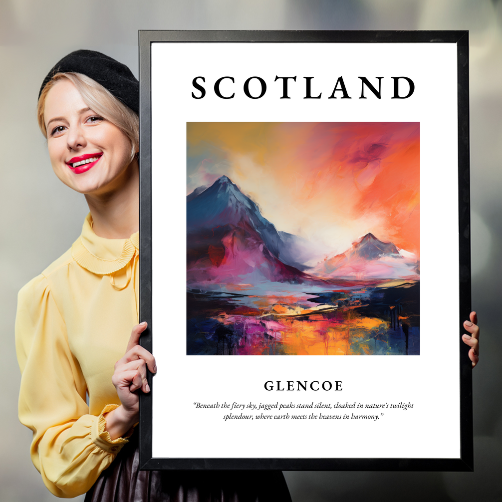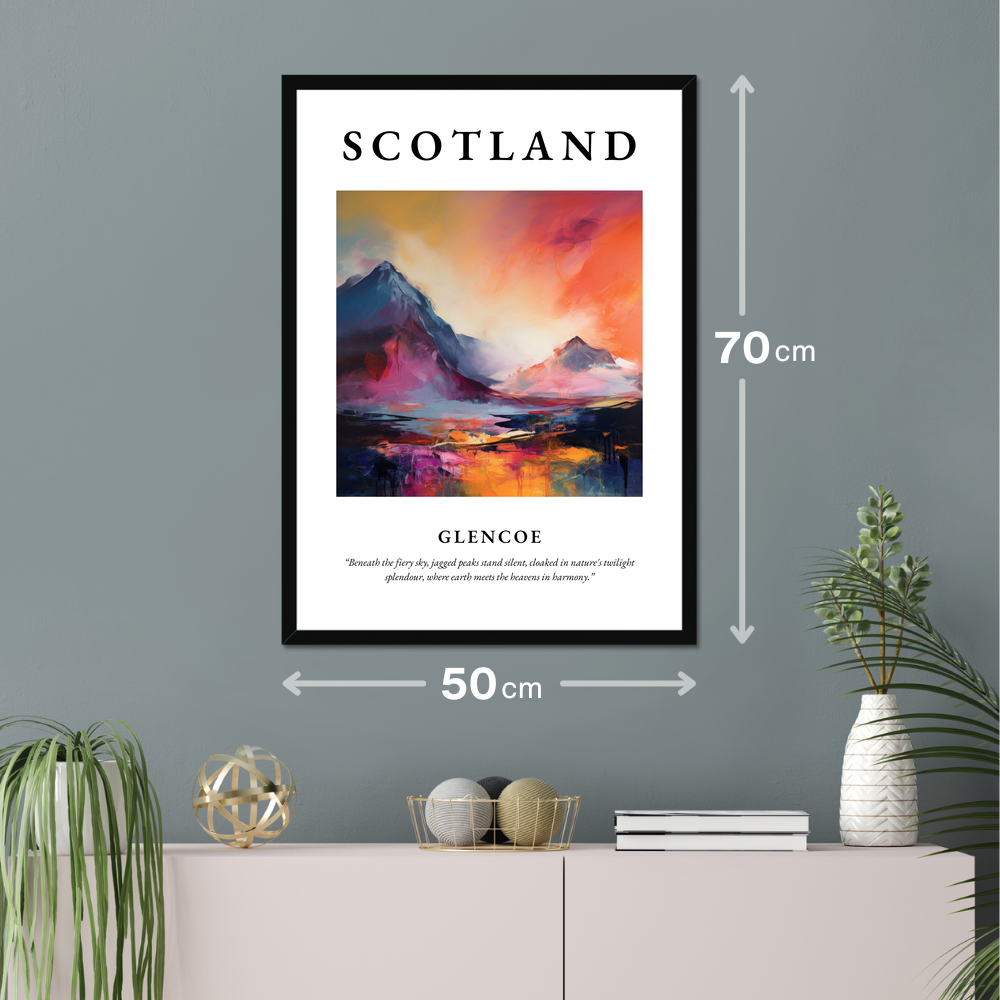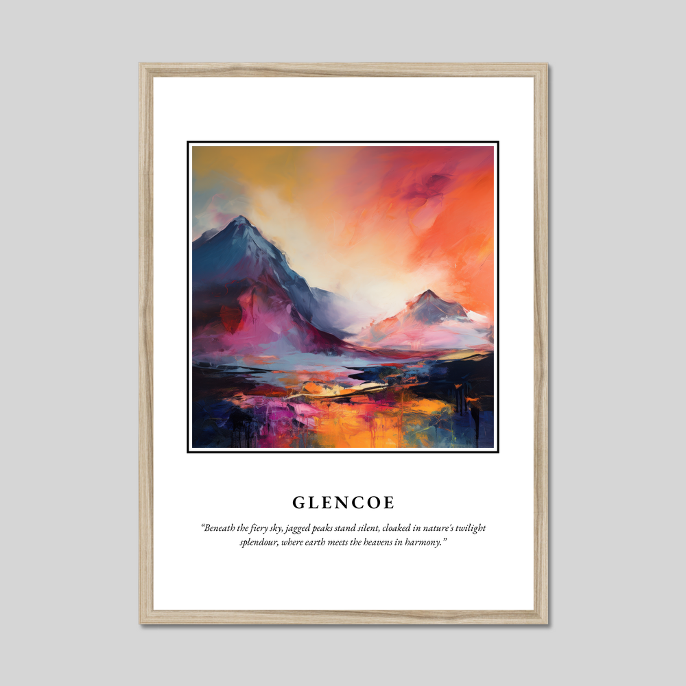 Below the painting, the thoughtful quote “Beneath the fiery sky, jagged peaks stand silent, cloaked in nature's twilight splendour, where earth meets the heavens in harmony.” encapsulates the serene yet dramatic essence of Glencoe. Each element combines to evoke a deep sense of place and passion, making it a perfect addition for those with a connection to Scotland or an appreciation for the beauty of abstract art.