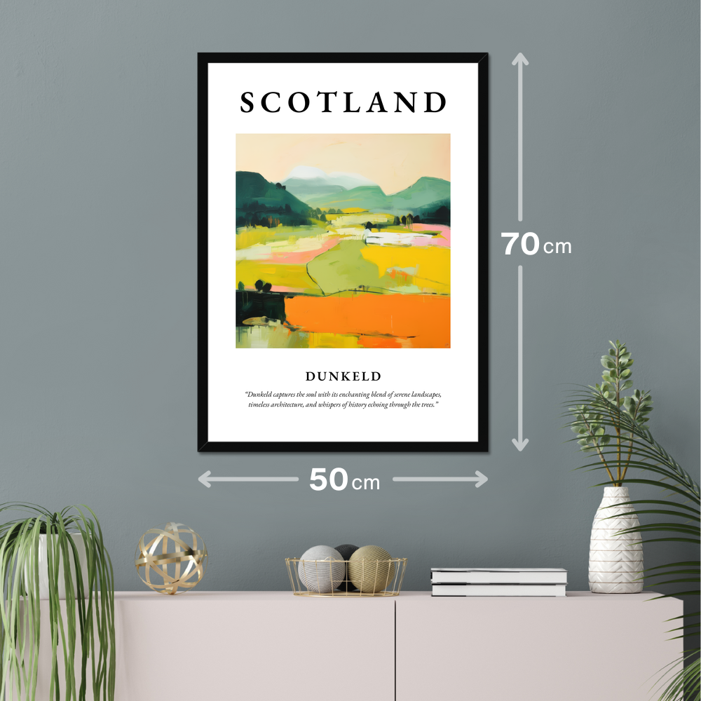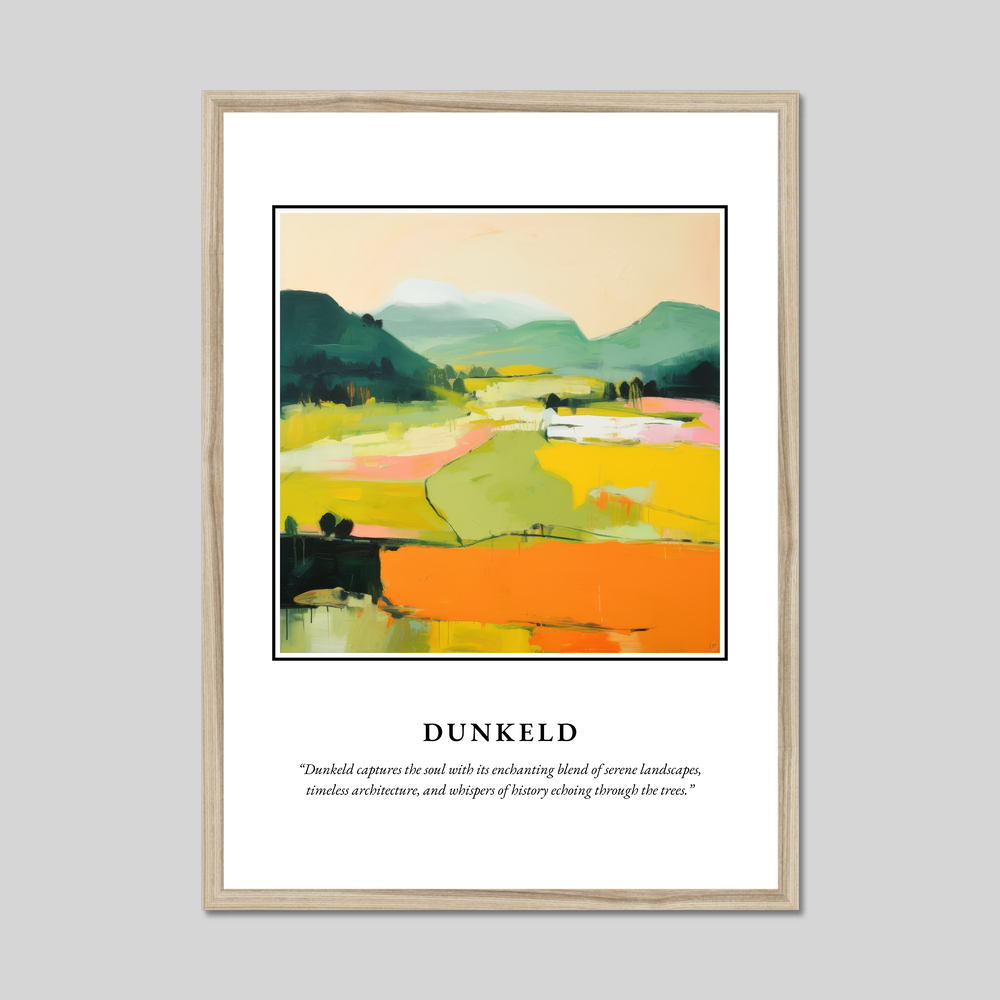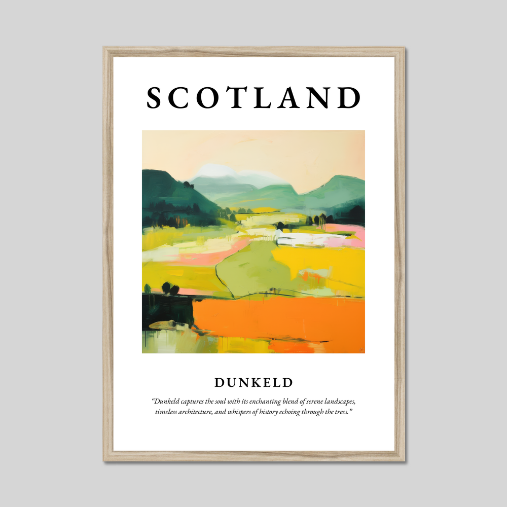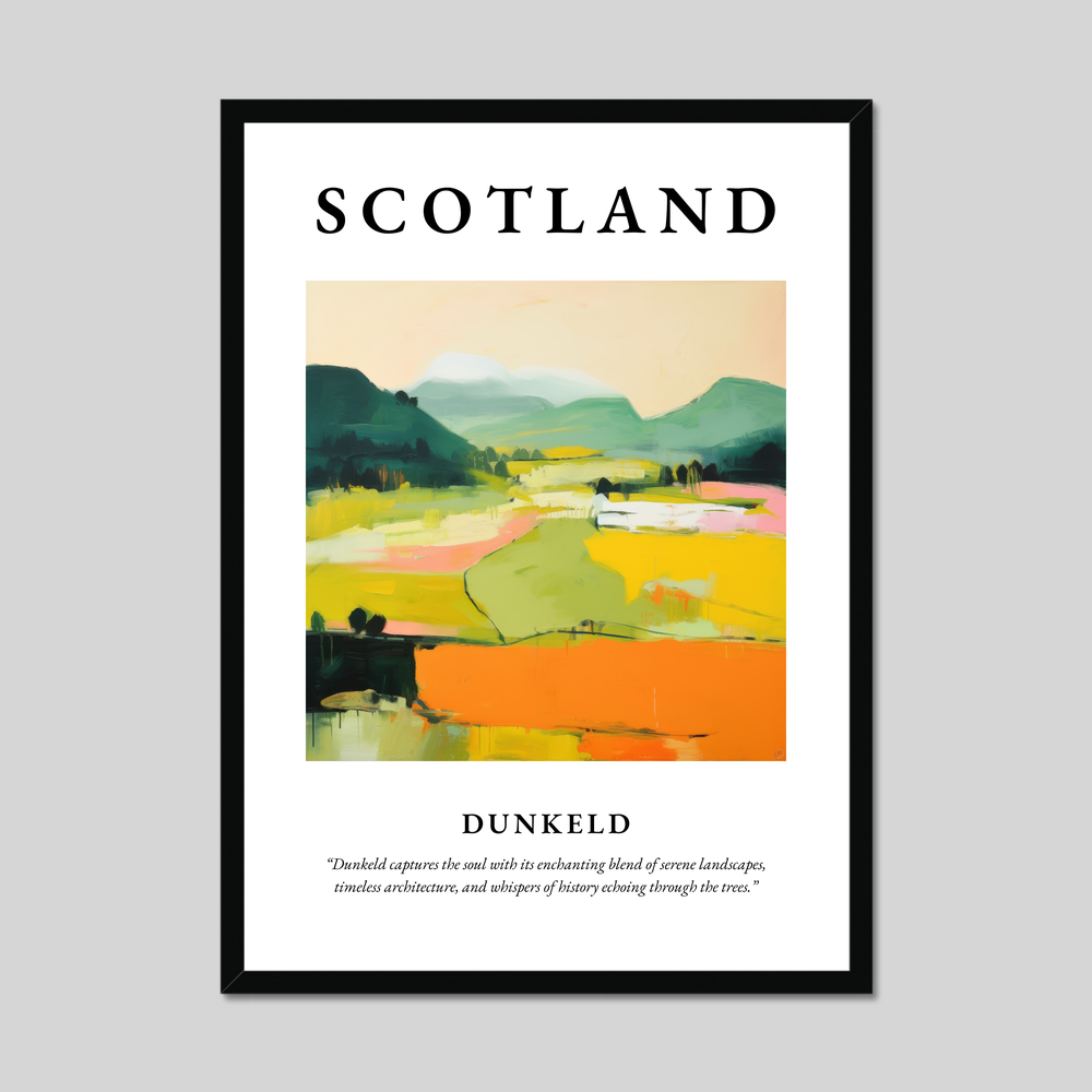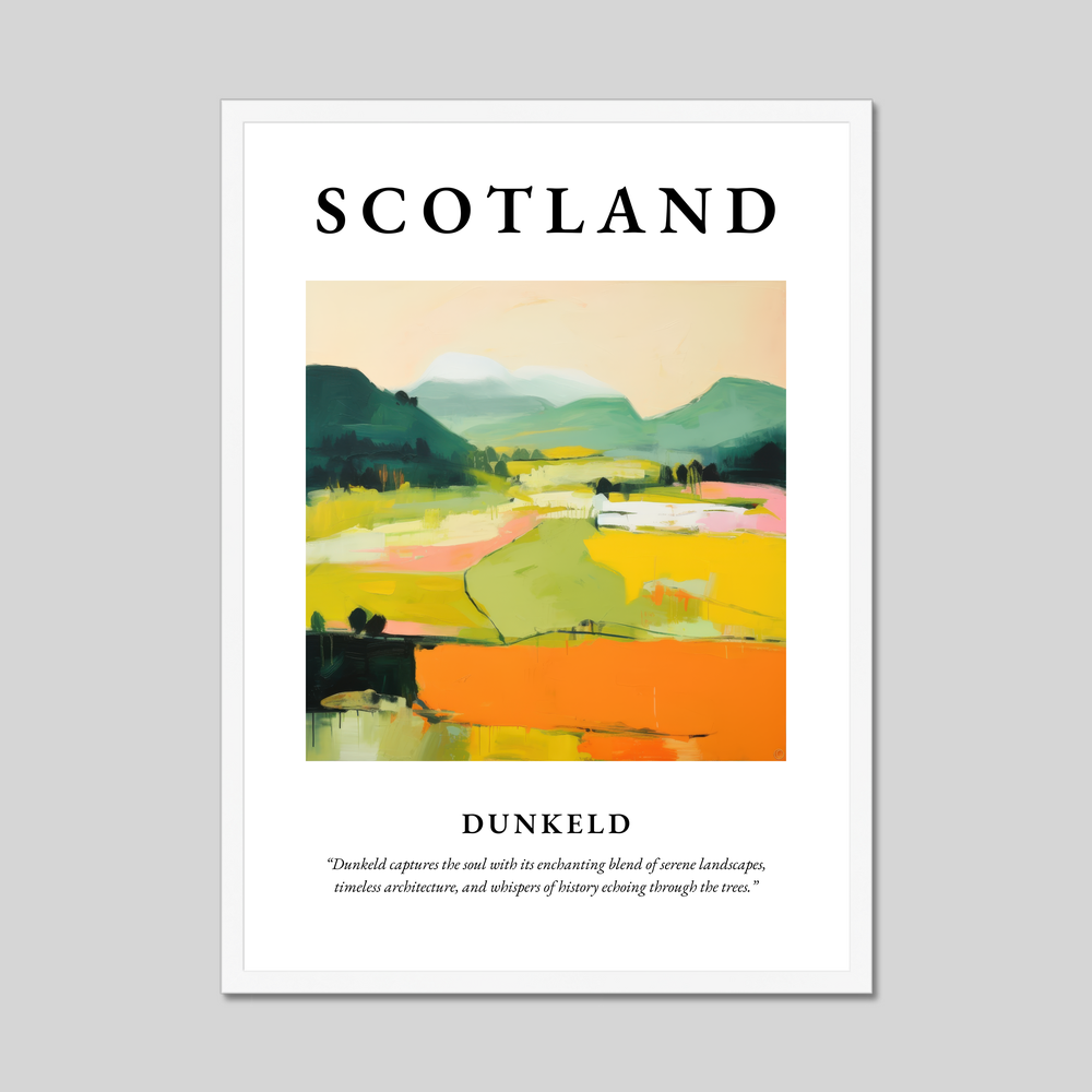 At the top, the bold lettering of “SCOTLAND” proudly announces its heritage, beckoning viewers to journey through the artistic landscape below. The abstract painting of Dunkeld invites both art enthusiasts and admirers of Scotland's picturesque locales to lose themselves in a whirl of earthy greens, warm yellows, and soft pinks. This vivid interpretation captures the essence of the region with broad strokes and a kaleidoscope of colours, creating a sense of depth and movement that mirrors the ever-changing Scottish skies. Below the painting, a poetic quote wraps up the experience: “Dunkeld captures the soul with its enchanting blend of serene landscapes, timeless architecture, and whispers of history echoing through the trees.”