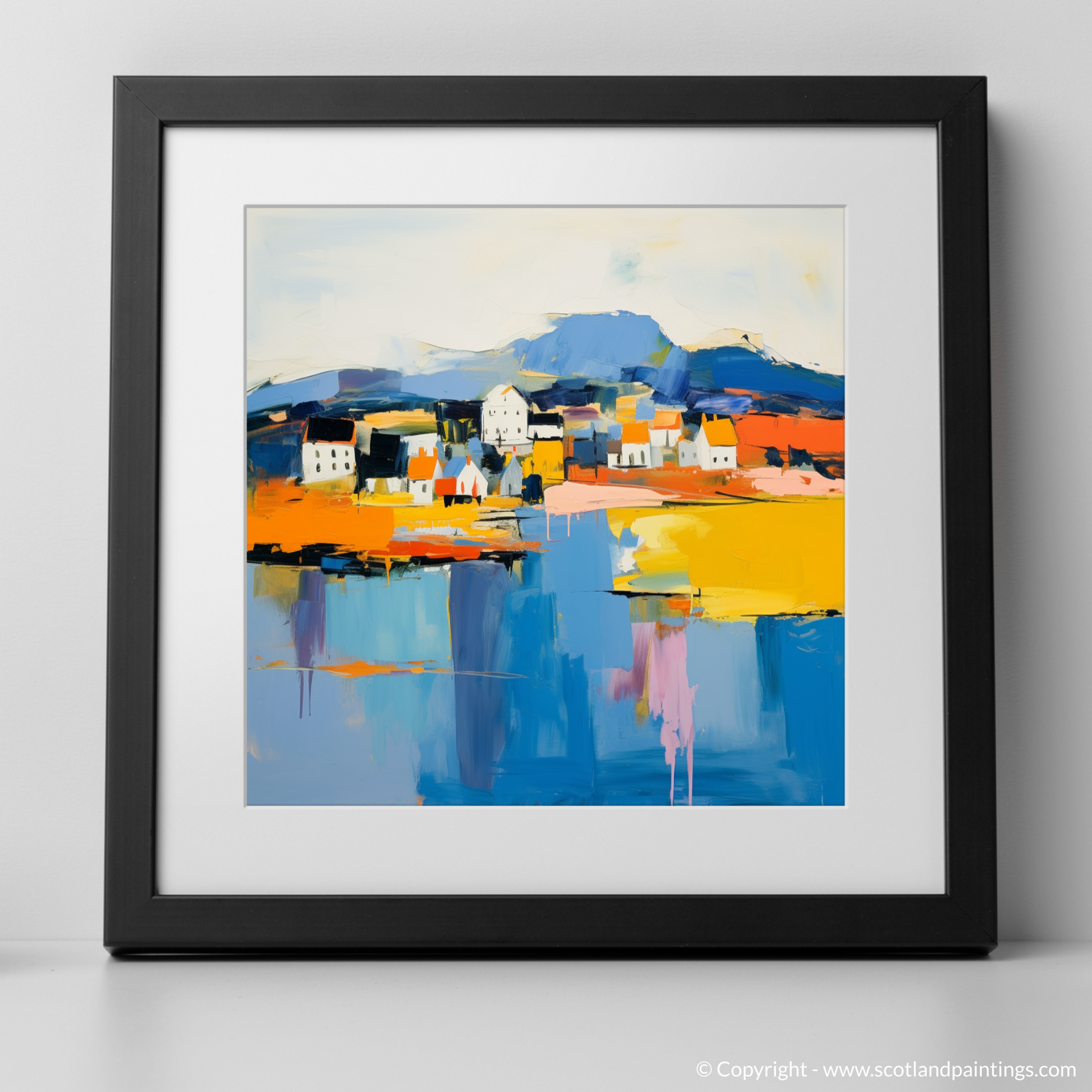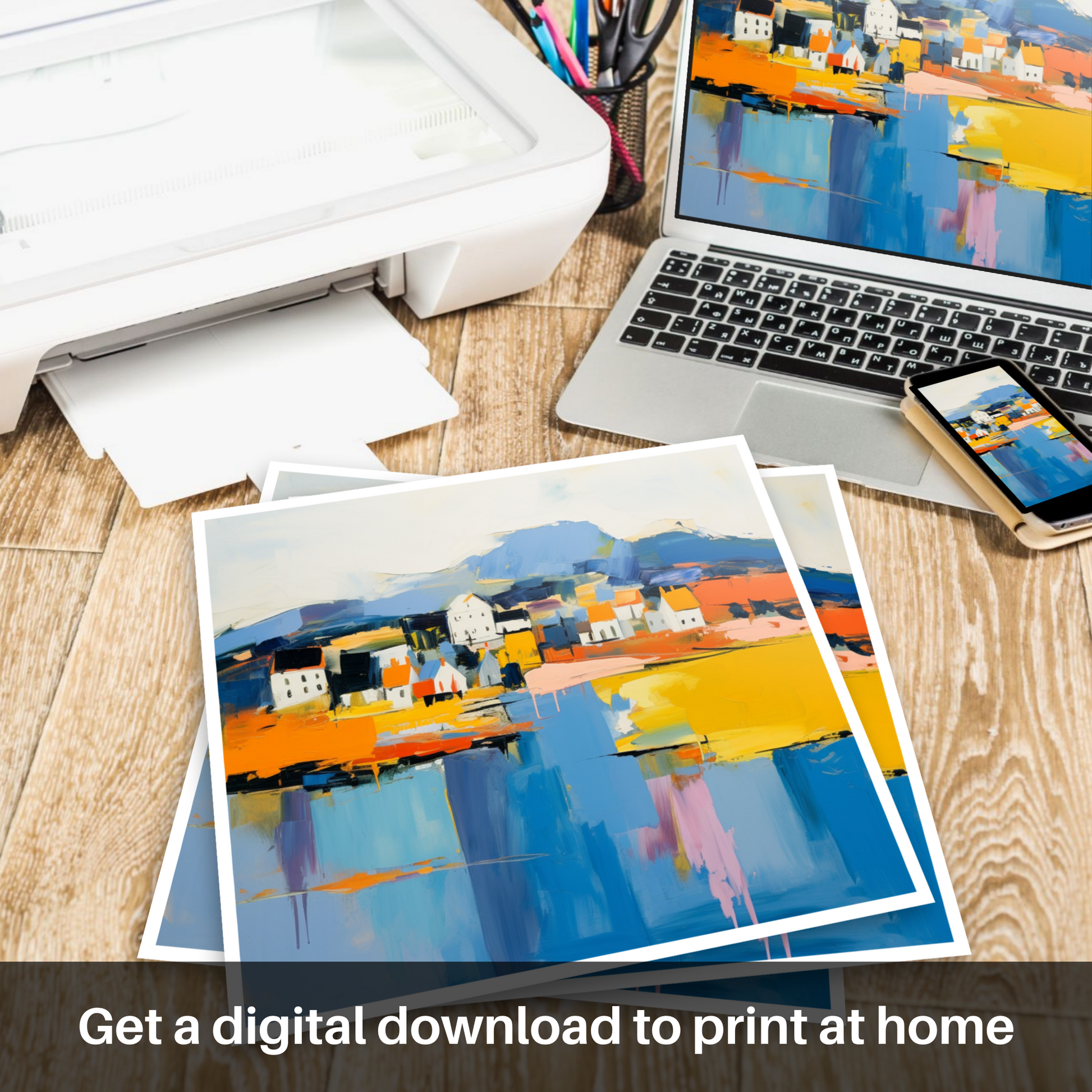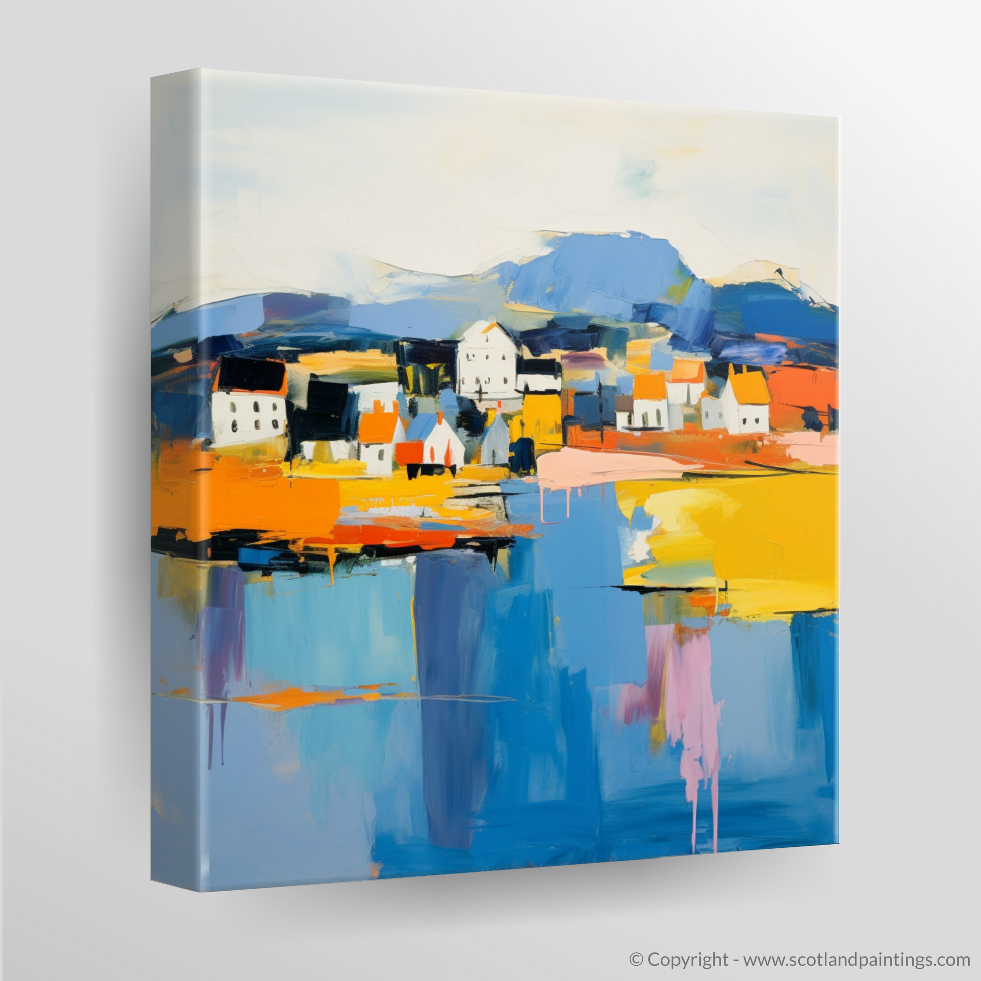 Step into a world where the essence of Oban is captured through a harmonious play of colour and form. This entrancing abstract interpretation elevates the coastal charm and quaint hamlets of Argyll and Bute to new artistic heights. Bold strokes of azure and cobalt blue convey the expansive Scottish skies, while a vibrant medley of tangerine, sun-kissed yellow, and warm ochre illustrates the land kissed by the light of different times of day. Simplified structures adorn the canvas, with their whites and creams offering a tranquil contrast to the dynamic backdrop, reminiscent of the town’s picturesque buildings.