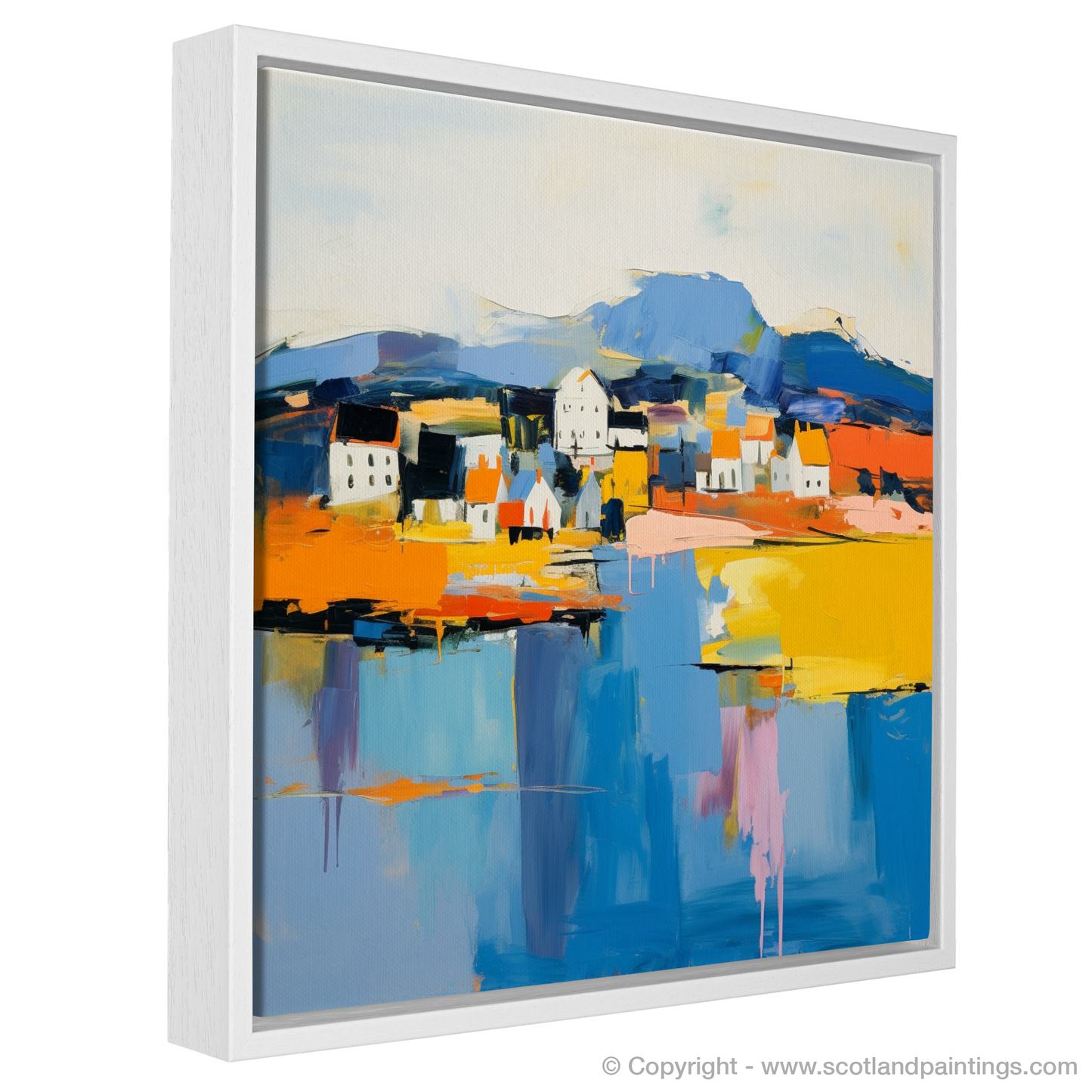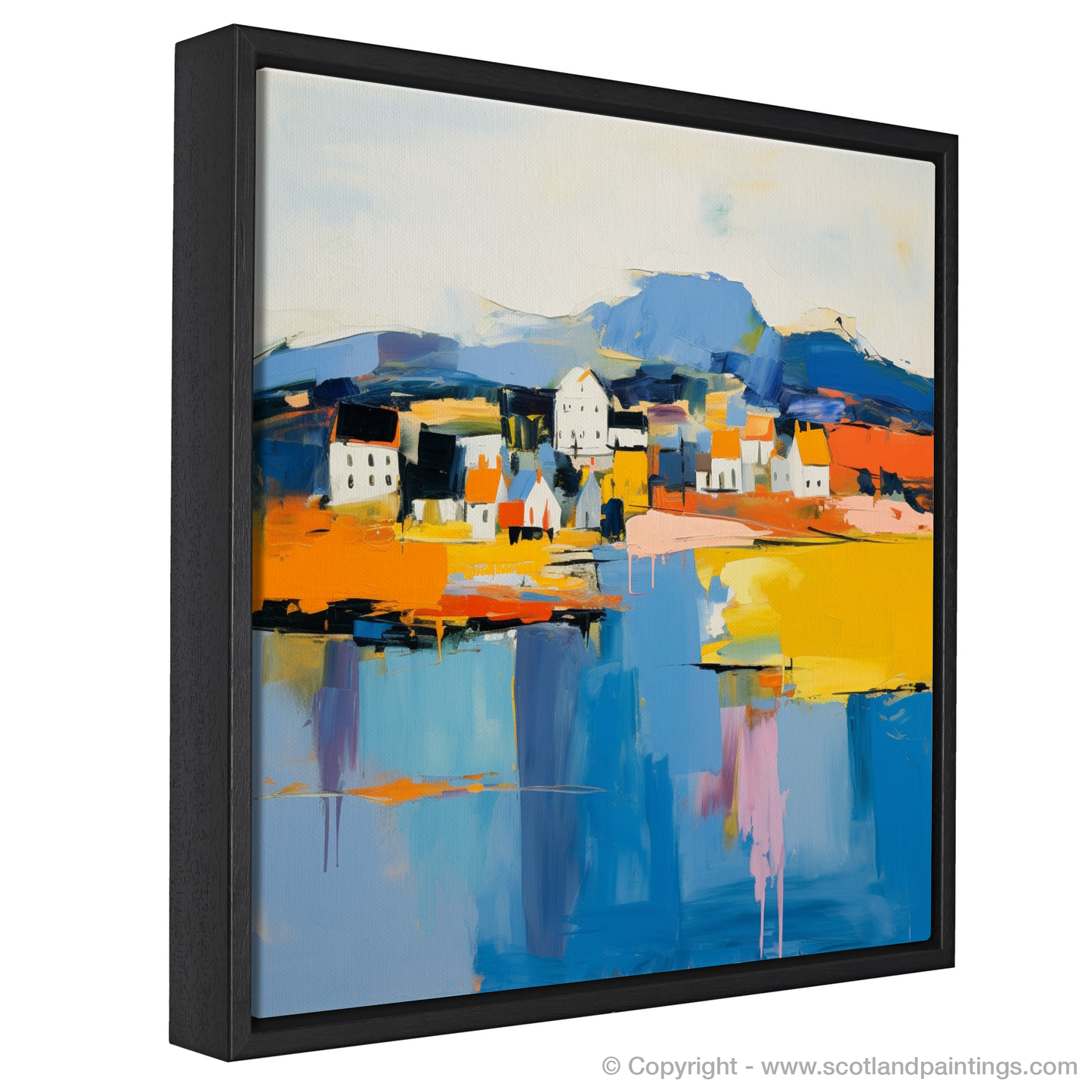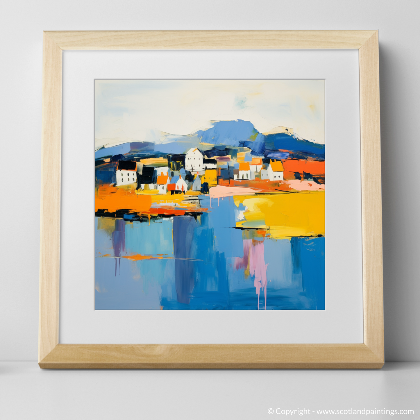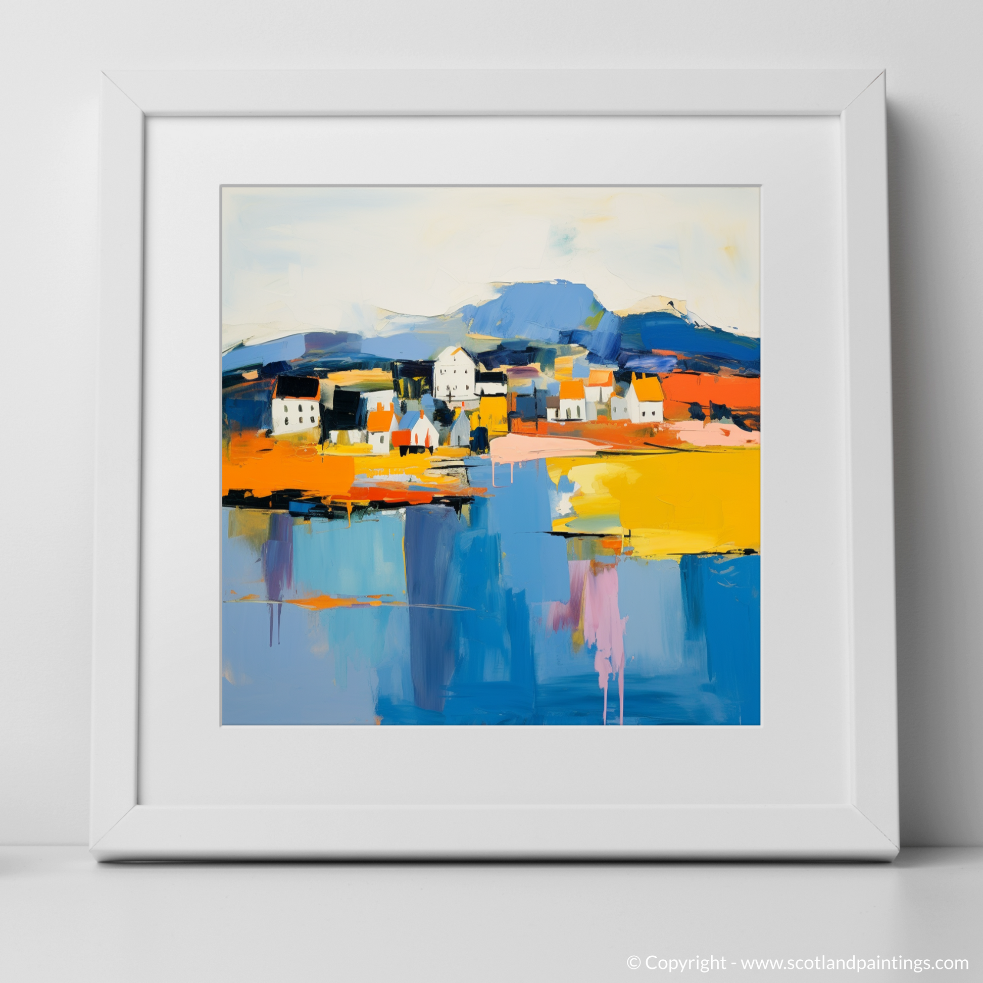 Step into a world where the essence of Oban is captured through a harmonious play of colour and form. This entrancing abstract interpretation elevates the coastal charm and quaint hamlets of Argyll and Bute to new artistic heights. Bold strokes of azure and cobalt blue convey the expansive Scottish skies, while a vibrant medley of tangerine, sun-kissed yellow, and warm ochre illustrates the land kissed by the light of different times of day. Simplified structures adorn the canvas, with their whites and creams offering a tranquil contrast to the dynamic backdrop, reminiscent of the town’s picturesque buildings.