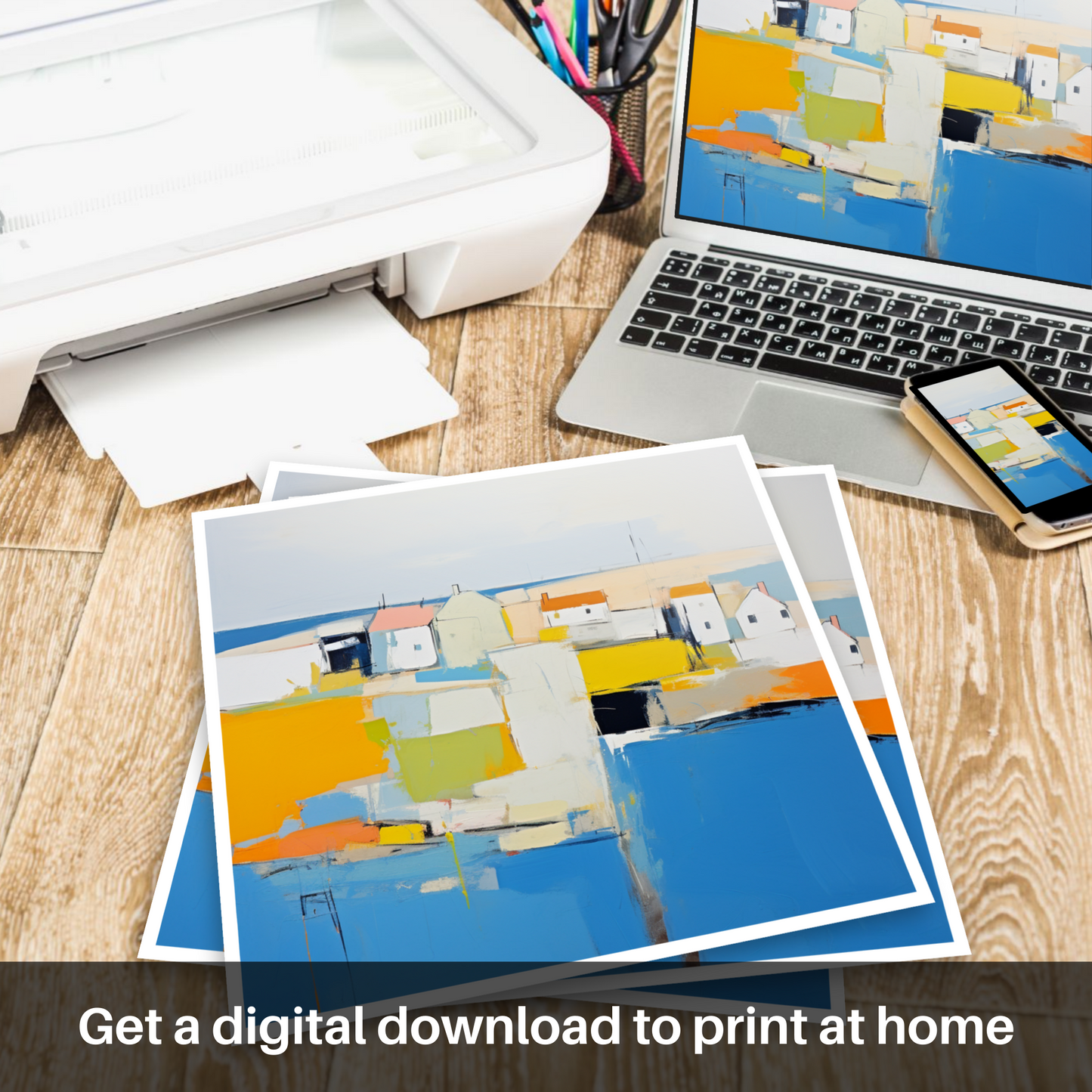 Capturing the essence of coastal charm through a vivid abstract lens, this print offers a striking tribute to Portmahomack Harbour, a serene spot nestled in Easter Ross. Bold, gestural strokes of azure, cobalt, and marine blues conjure the expansive skies and deep waters, blending seamlessly with the striking yellows and crisp whites that invoke the harbour's sandy beaches and sunlit facades.