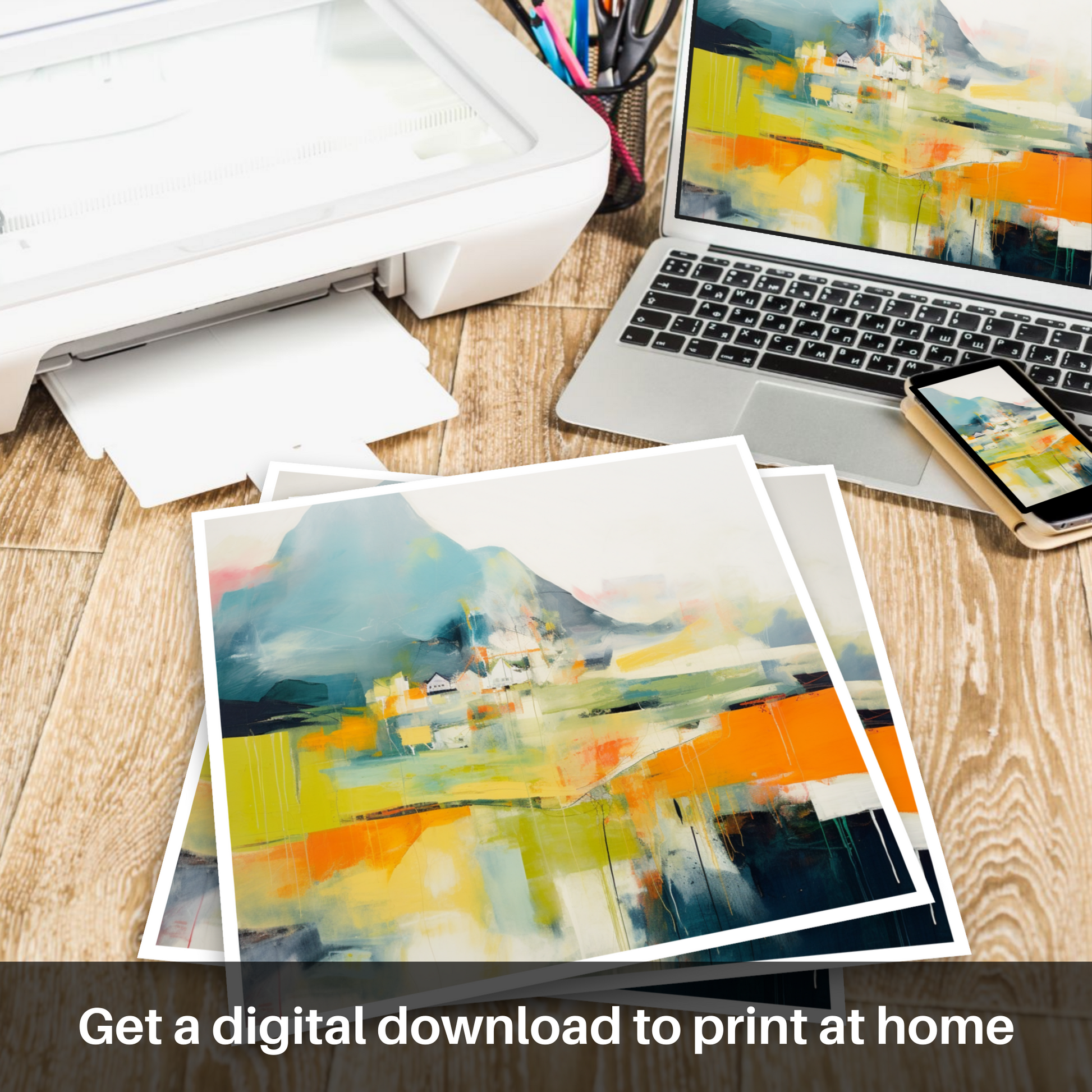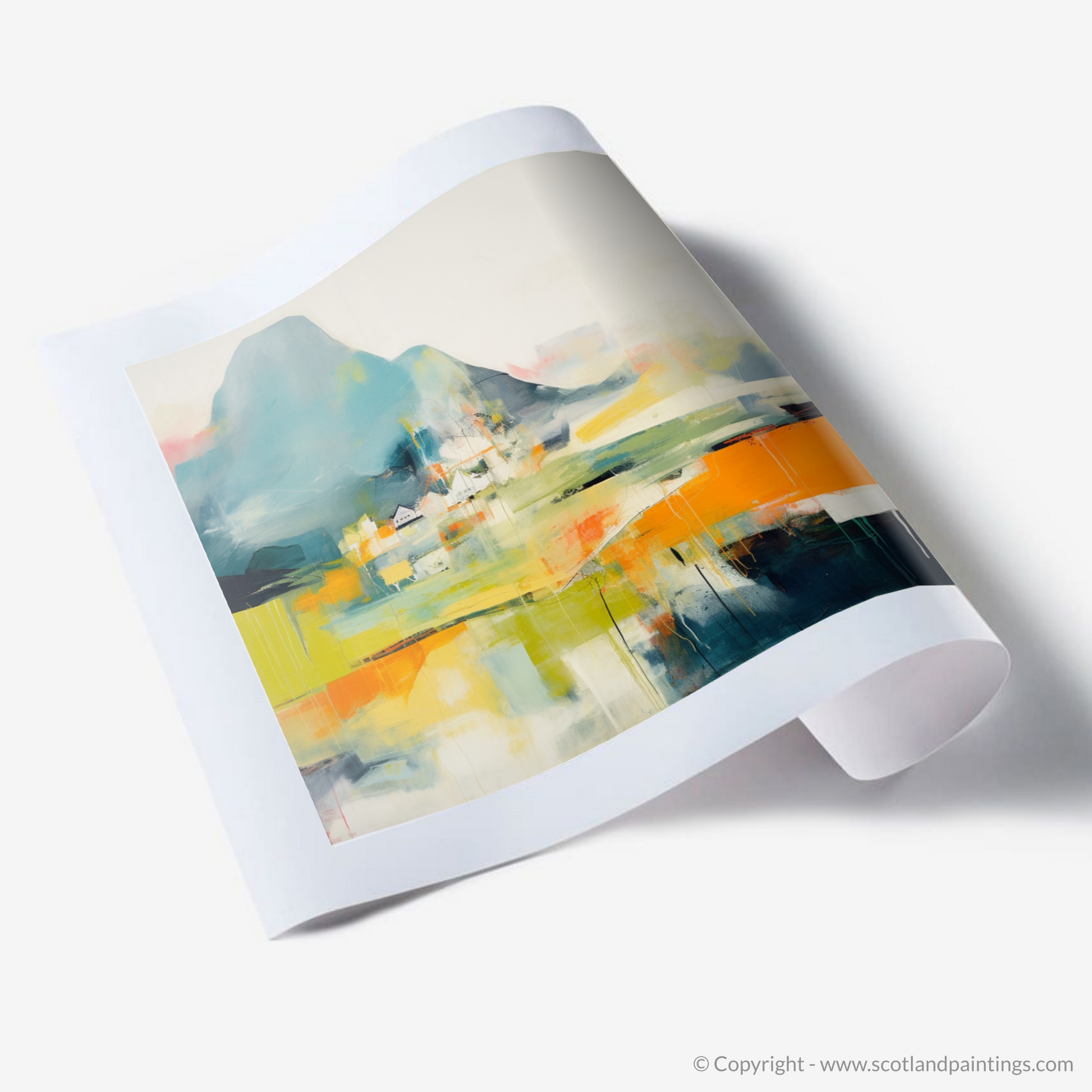 Immerse yourself in the vibrant hues and ethereal essence of the Scottish Highlands with this mesmerising abstract print inspired by Fort William. Cascading layers of colour blend seamlessly across the canvas, inviting the onlooker to decipher the interplay between light and landscape. At first glance, one is enveloped by the primary hues—startling oranges and vivid yellows that recall the stunning autumnal tones of the region, laid out like a patchwork of unending fields and open skies.