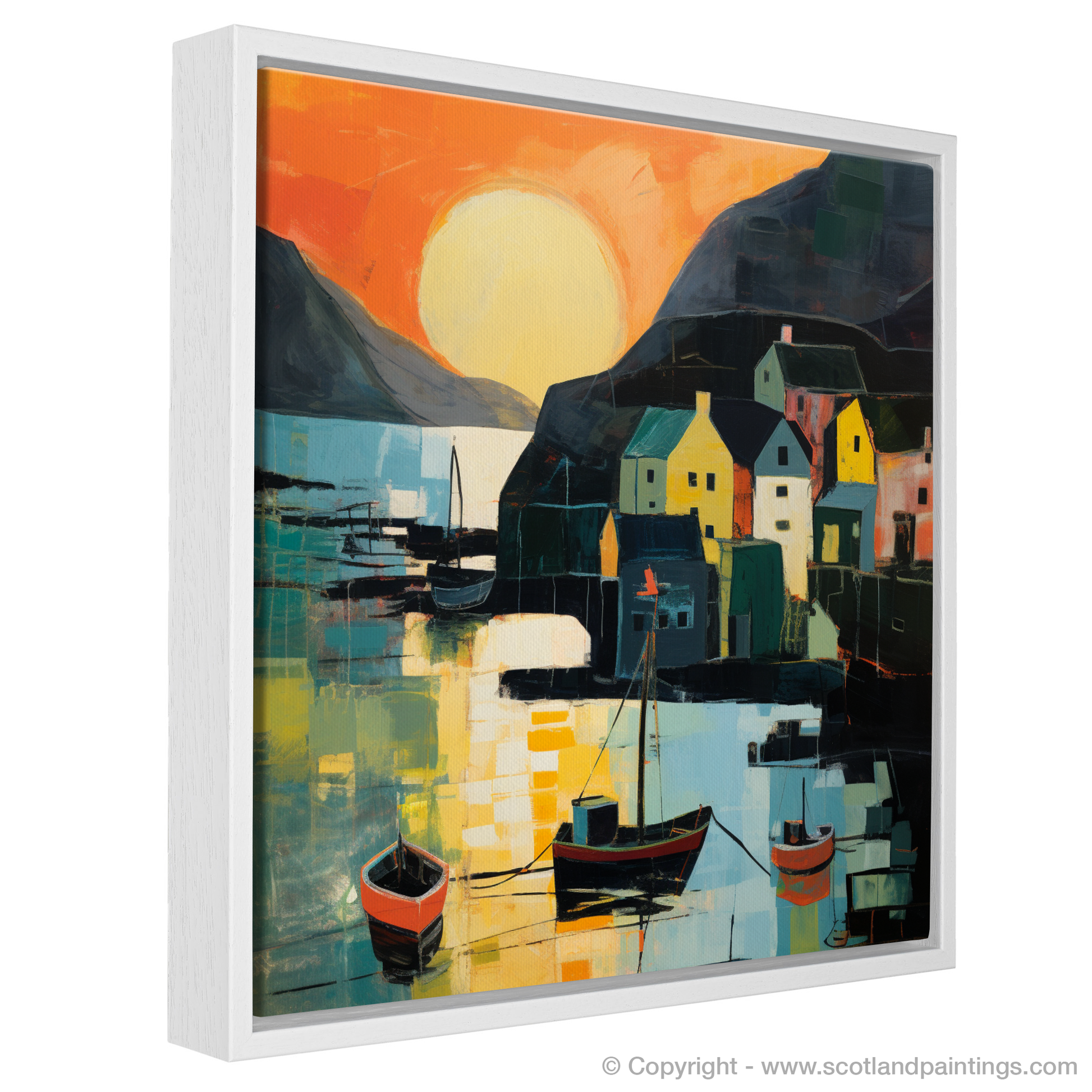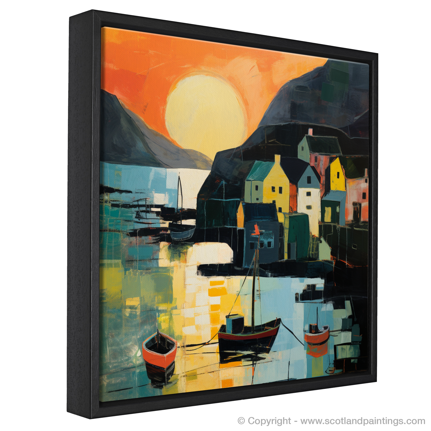 In this print, bold shapes and spirited strokes are deftly employed to portray a cluster of quaint cottages nestled against rolling hills. The homes, dappled in a medley of yellows, oranges, and muted greens, suggest a human touch amidst the wild Scottish coastline. Their angular roofs and crooked lines lend a dreamlike character to the scene, hinting at the timeless charm of the harbour.