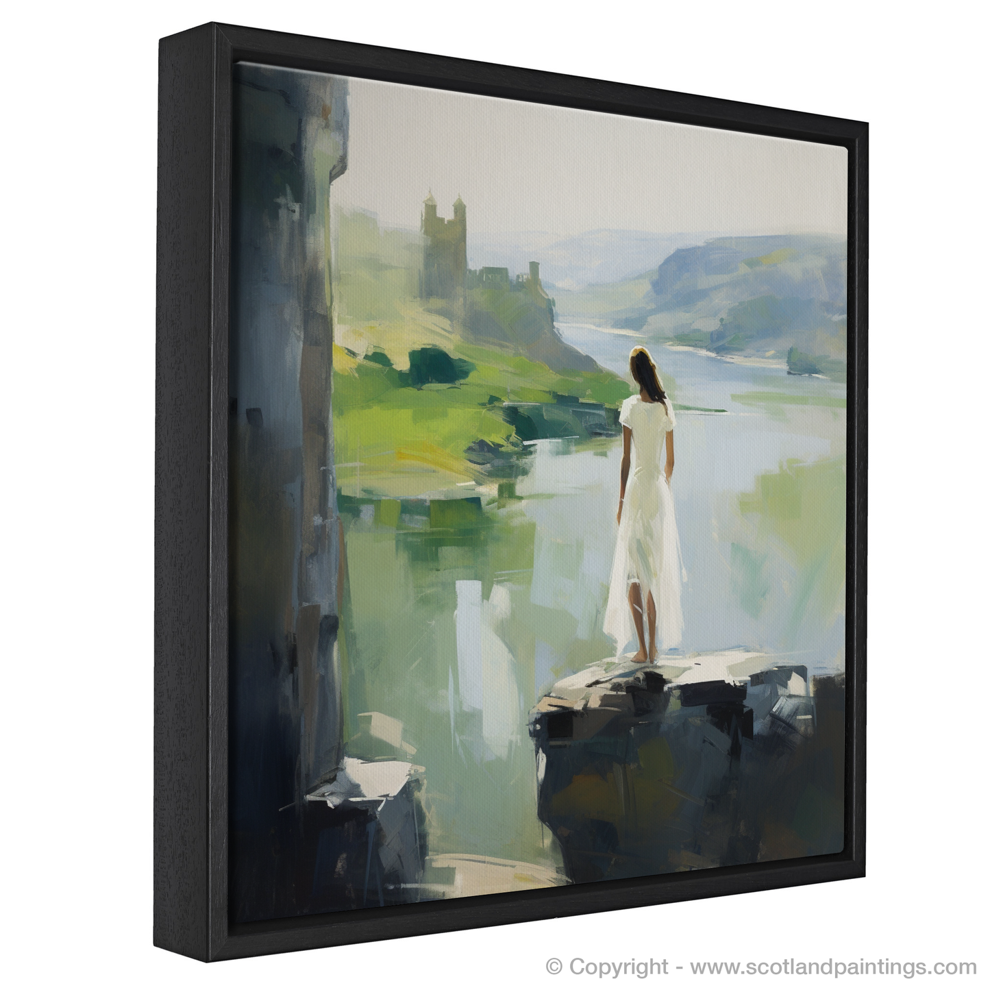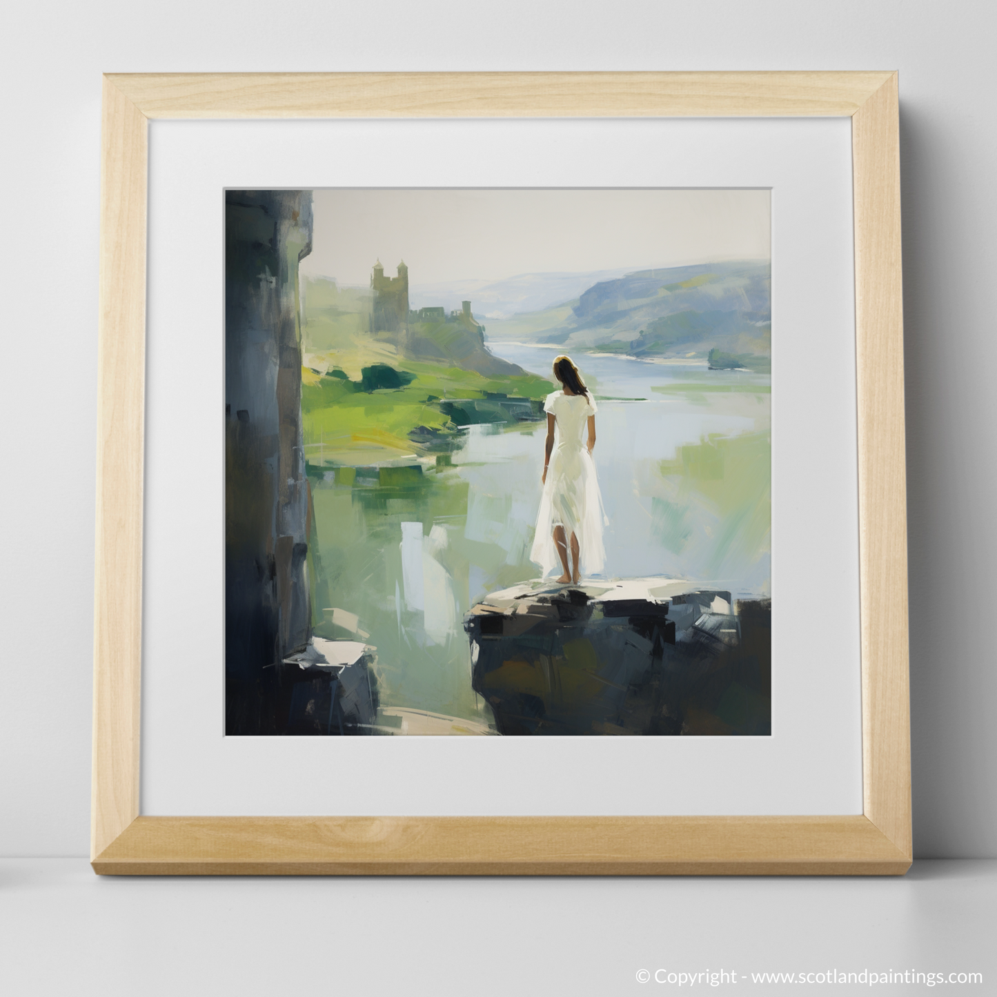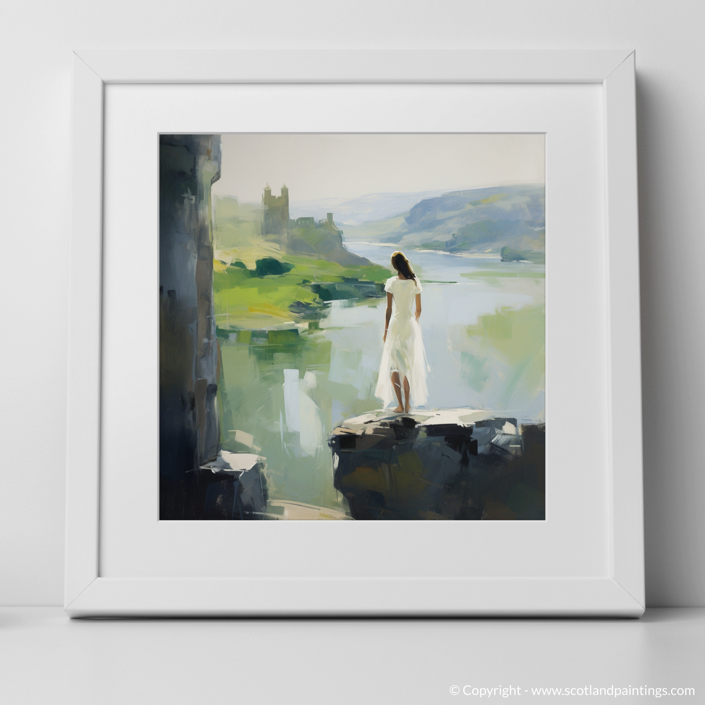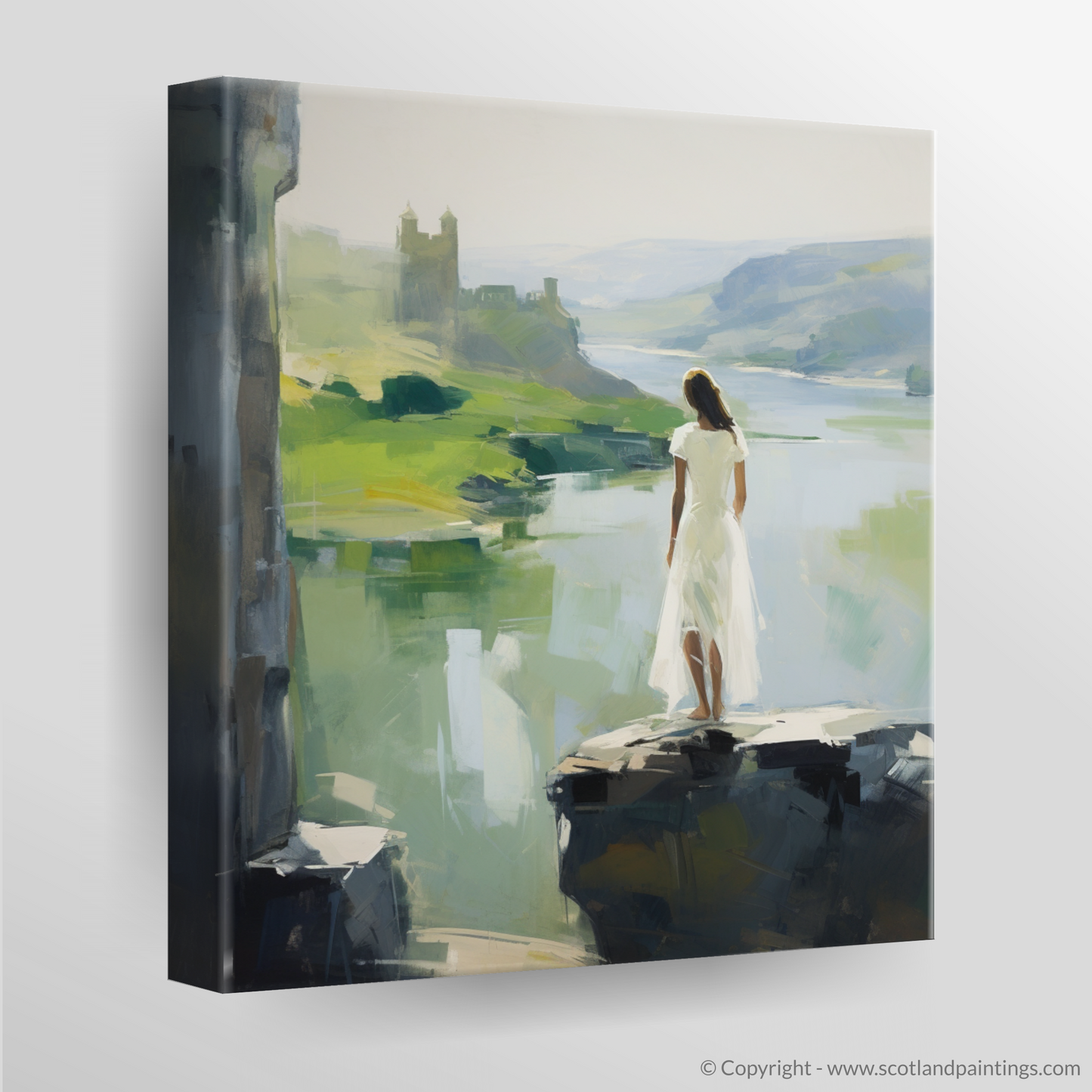 Immerse yourself in the ethereal beauty of this abstract artwork, where a solitary figure clad in a flowing white dress stands in repose, gazing across the historic vestiges of Urquhart Castle. The figure's stance, poised and serene against the canvas, evokes a sense of contemplative tranquillity, drawing the viewer into a moment suspended in time.