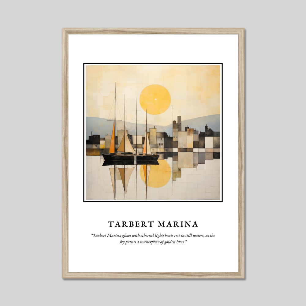 Beneath the painting lies the quote, “Tarbert Marina glows with ethereal light; boats rest in still waters, as the sky paints a masterpiece of golden hues.” This poetic addition invites viewers to immerse themselves in the tranquil beauty and dreamlike quality that Tarbert Marina exudes.