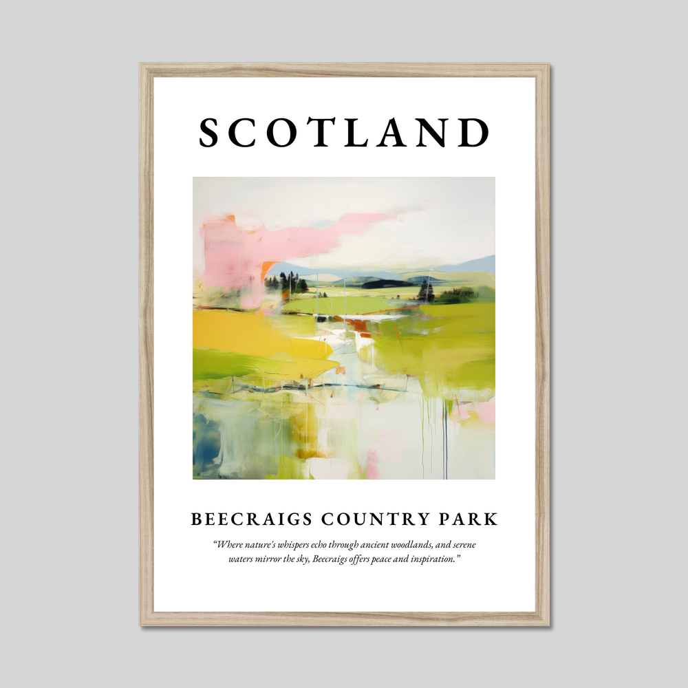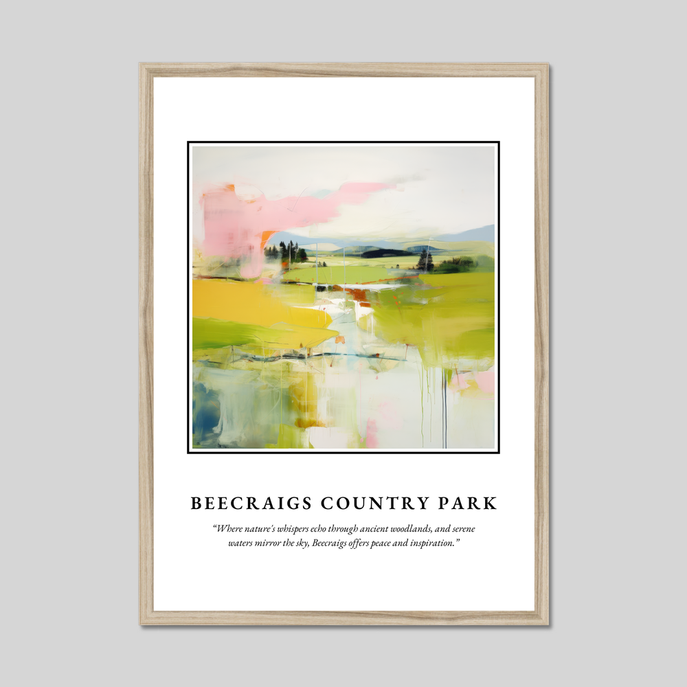 Underneath the painting, the quote "Where nature's whispers echo through ancient woodlands, and serene waters mirror the sky, Beecraigs offers peace and inspiration" encapsulates the allure of this remarkable location. This large poster is perfect for those wishing to adorn a spacious wall with a piece that speaks to the heart, all without the hefty price tag.