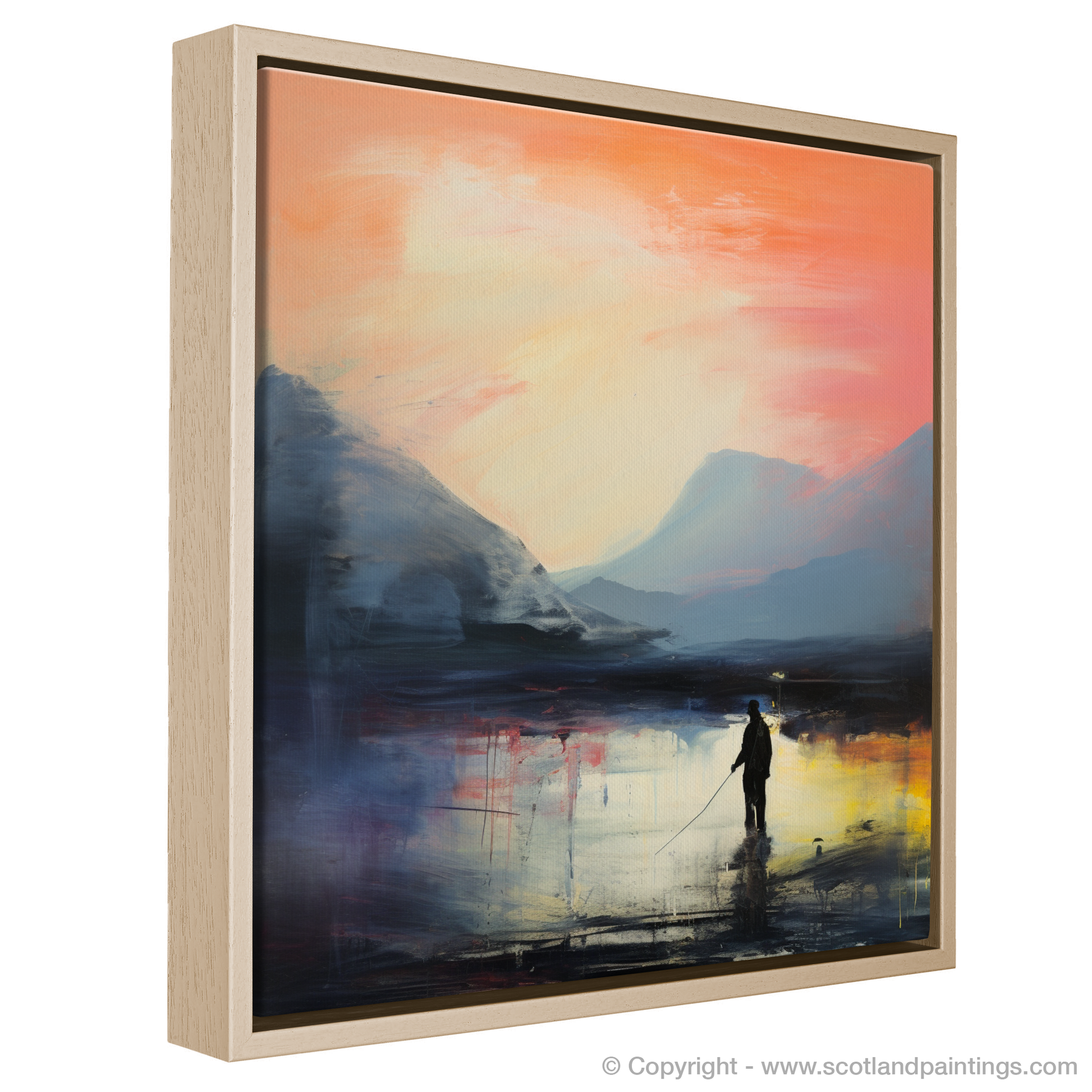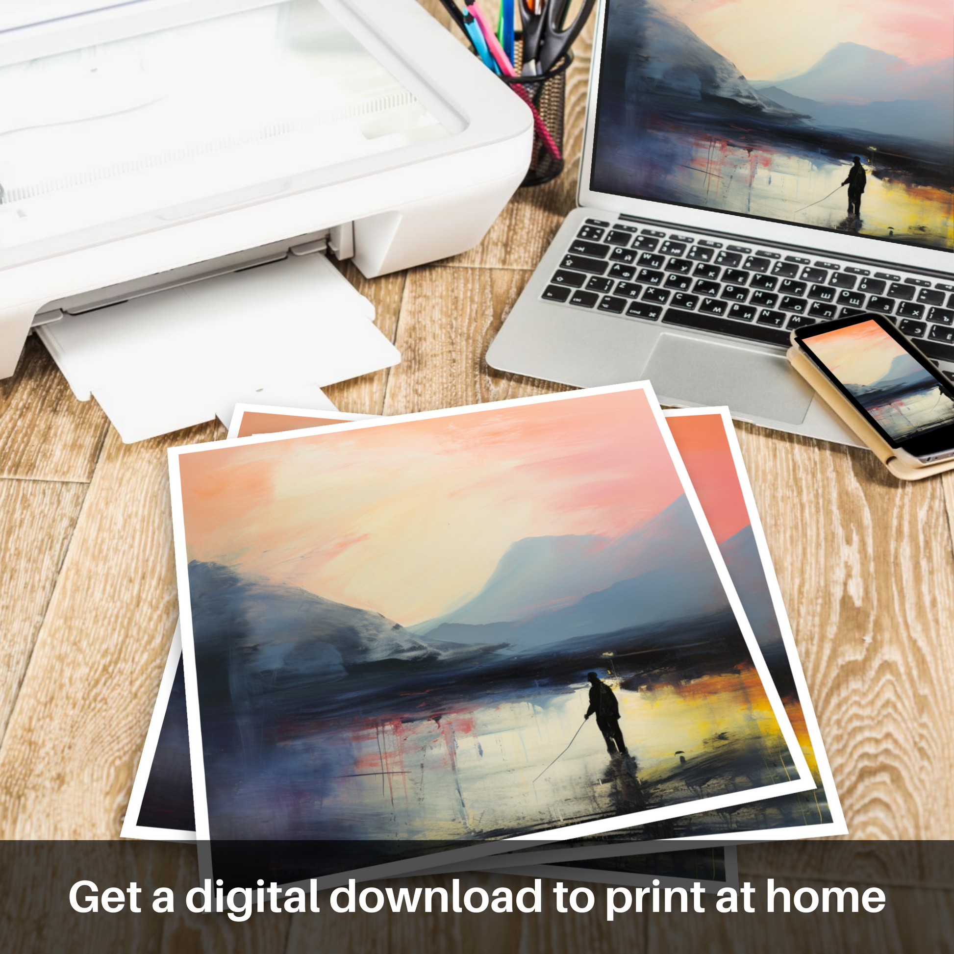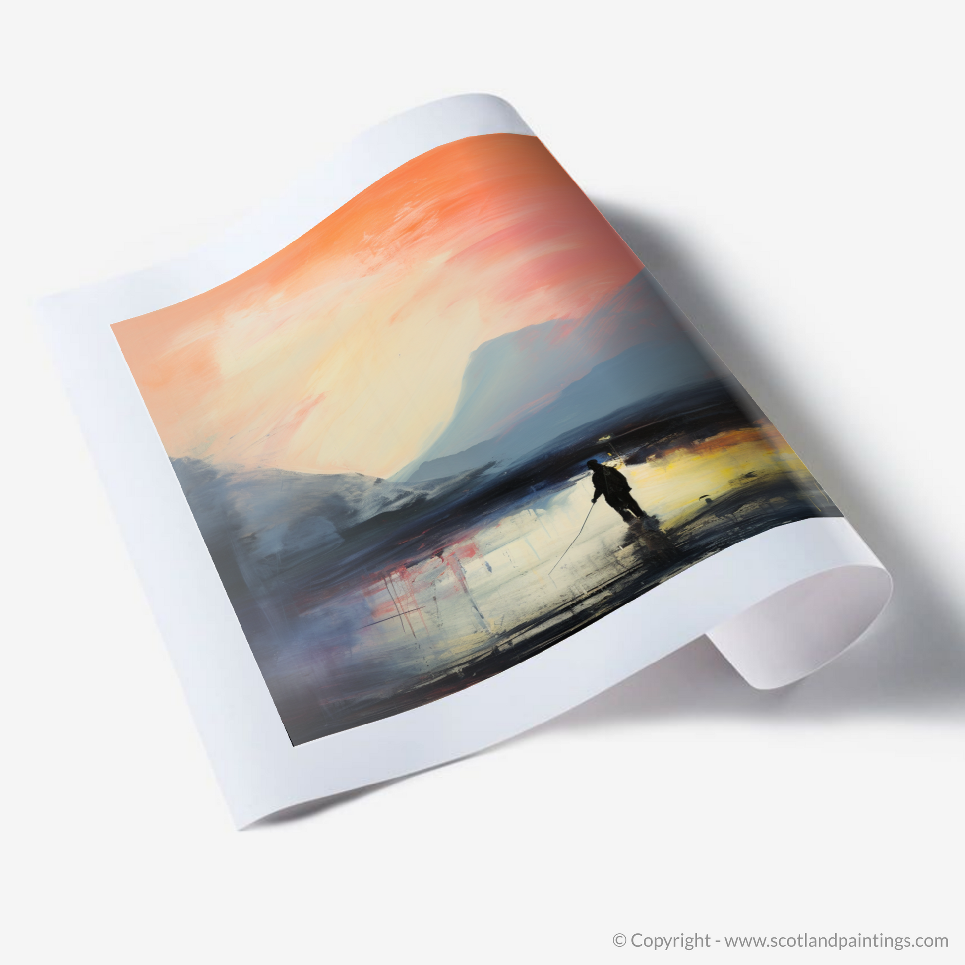 Indulge in the serene abstraction of Scotland's natural beauty with this evocative print. The scene is an immersive blend of colour and form, encapsulating the tranquil pastime of fly fishing on the idyllic Loch Lomond. A lone figure stands immersed in the gentle waters, rod in hand, casting a line into the reflective tranquility beneath a dramatically interpreted sky. The hills of Loch Lomond rise in silent majesty behind the angler, their silhouettes softened in the capturing of light and shadow.