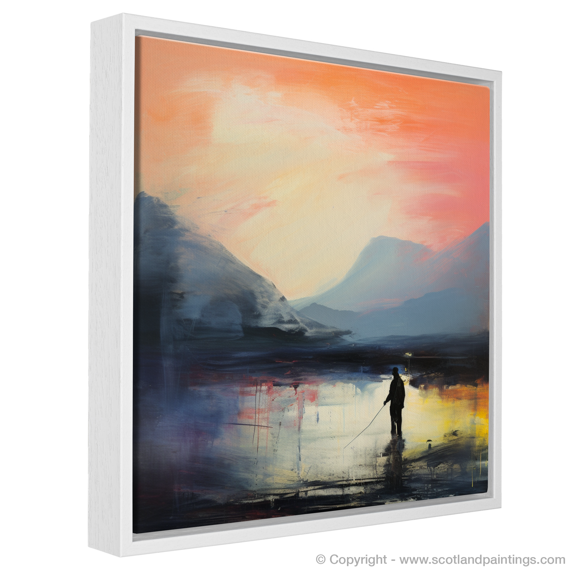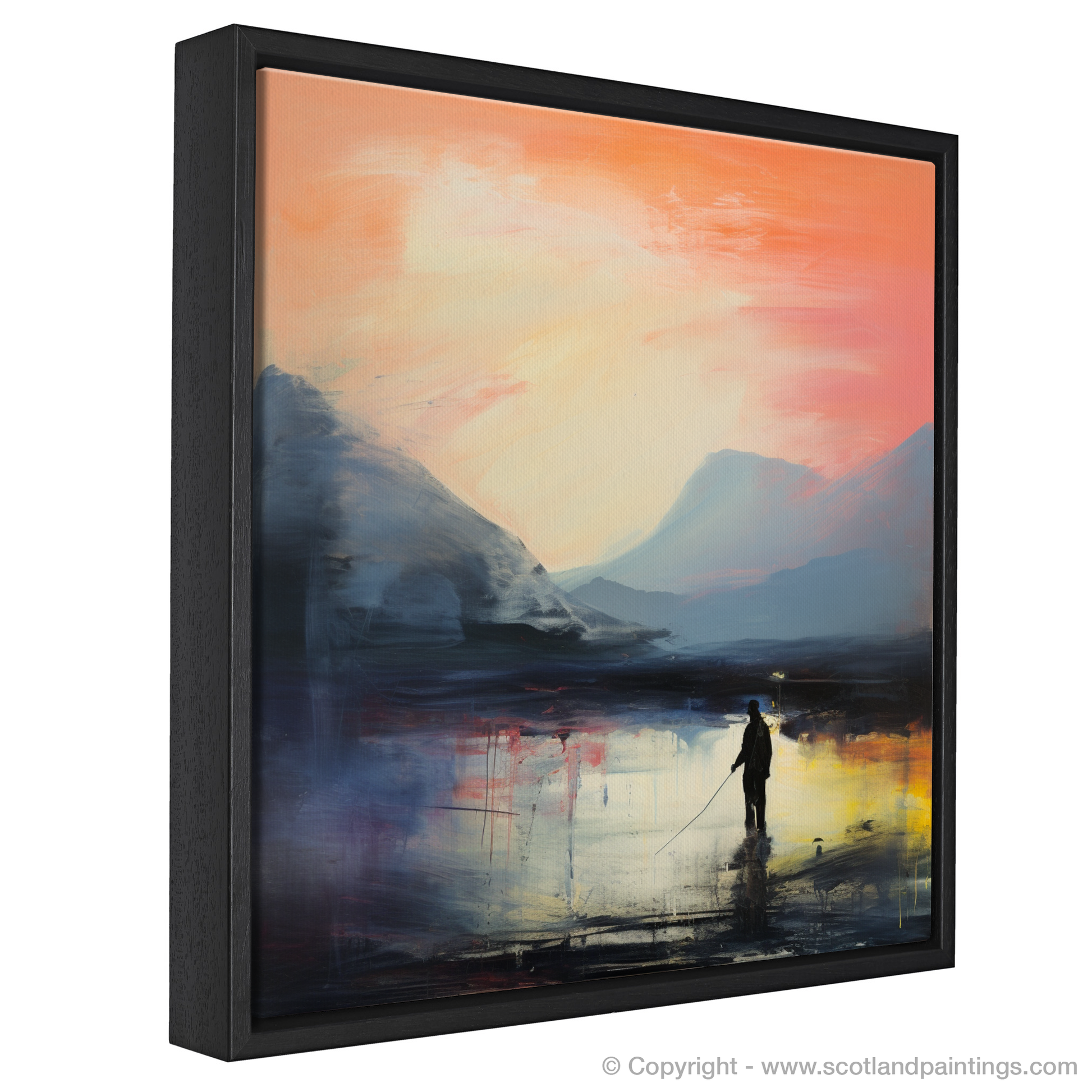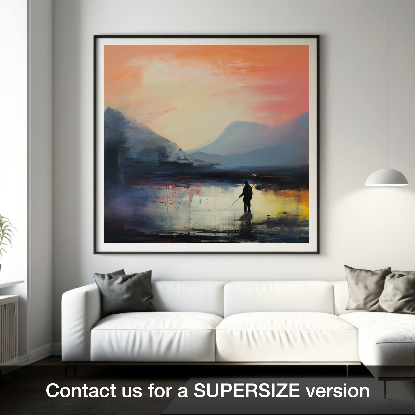 Indulge in the serene abstraction of Scotland's natural beauty with this evocative print. The scene is an immersive blend of colour and form, encapsulating the tranquil pastime of fly fishing on the idyllic Loch Lomond. A lone figure stands immersed in the gentle waters, rod in hand, casting a line into the reflective tranquility beneath a dramatically interpreted sky. The hills of Loch Lomond rise in silent majesty behind the angler, their silhouettes softened in the capturing of light and shadow.