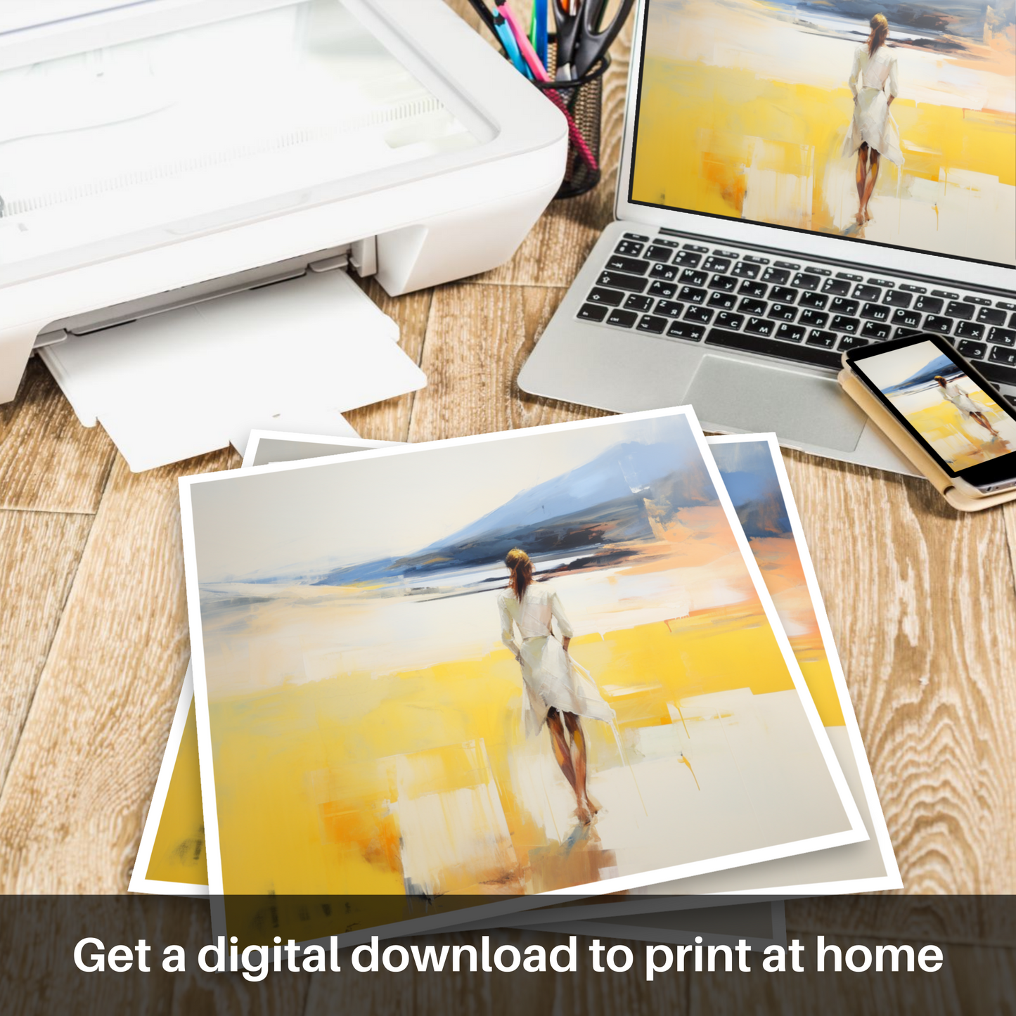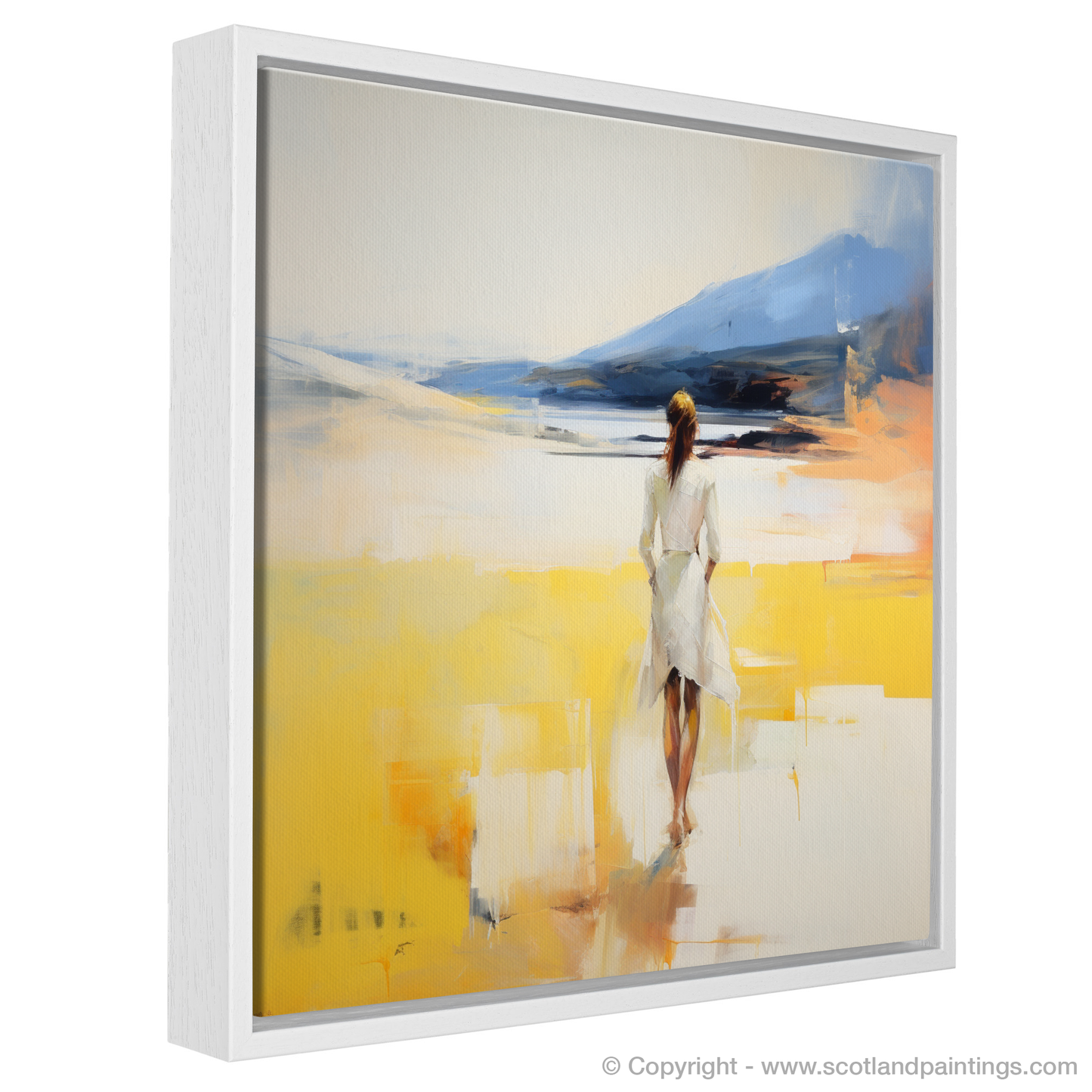 Capturing the essence of contemplation and the serene beauty of nature, this exquisite piece from our 'White Dress' collection invites viewers to immerse themselves into a realm of abstract elegance and tranquility. The artwork features a solitary figure cloaked in a flowing white dress, gazing out towards the golden expanses of Morar. The horizon is met with a harmonious blend of delicate blues and soft greys—a stark contrast against the vivid, sunlit sands that are rendered in warm and rich golden hues.