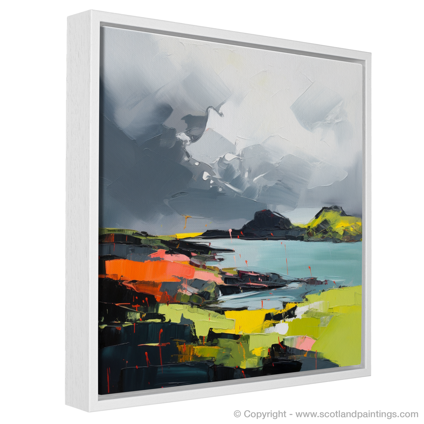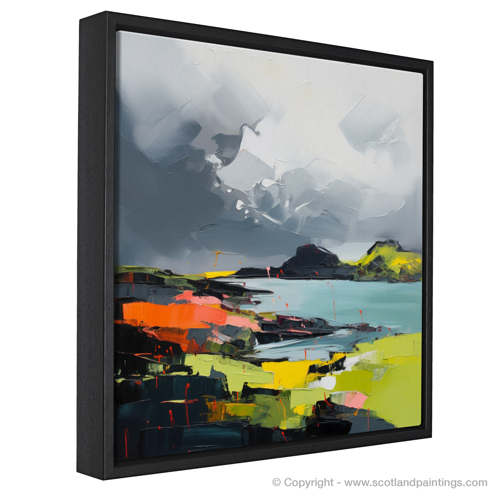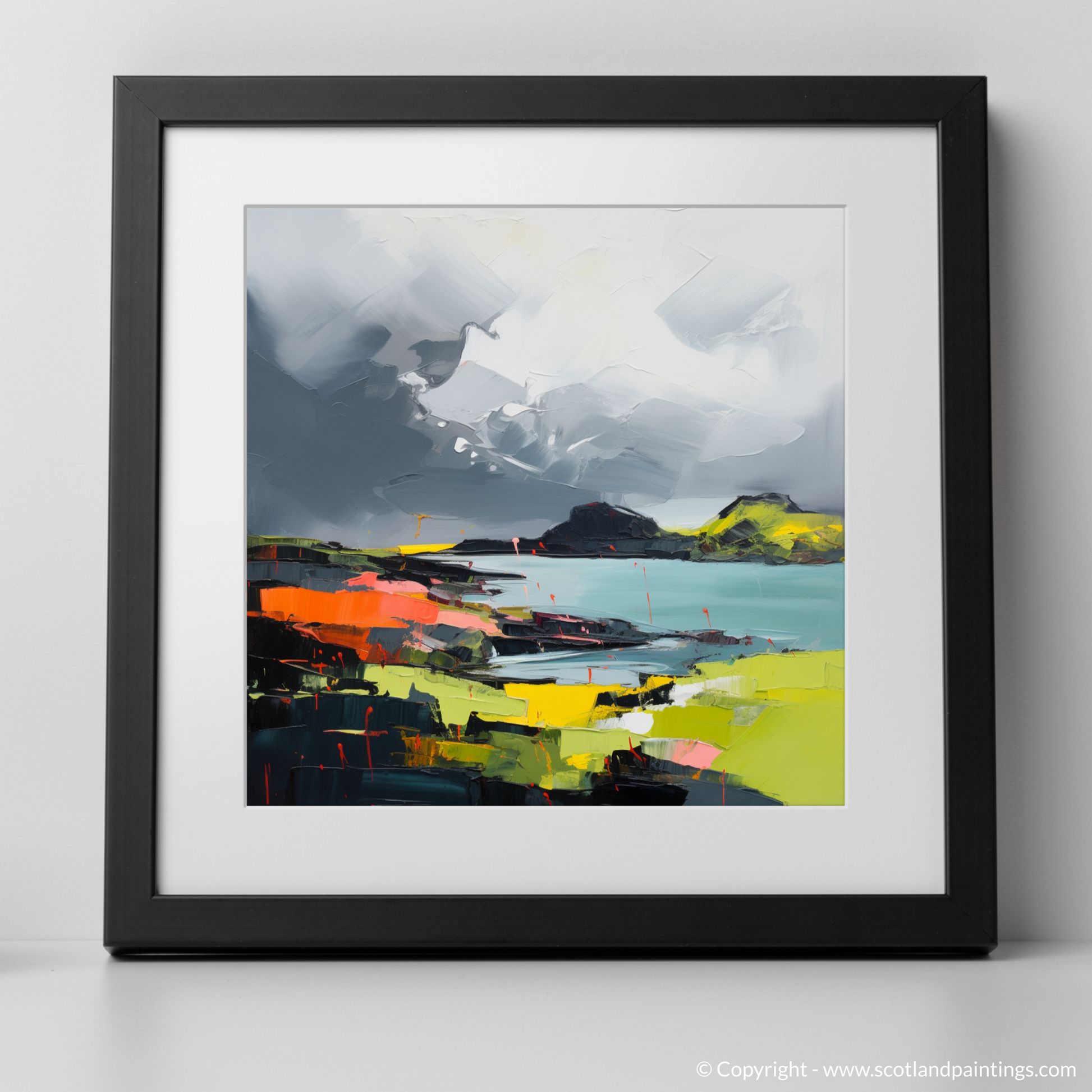 Immerse yourself in the tempestuous beauty of Easdale Sound, as captured in this evocative abstract print. The artwork invites the viewer to experience the raw, untamed essence of one of Scotland's most picturesque inlets. Dominating the canvas is a brooding, storm-laden sky, an array of greys swirling together in a symphony of shadows and light, suggesting the unpredictable nature of the elements.