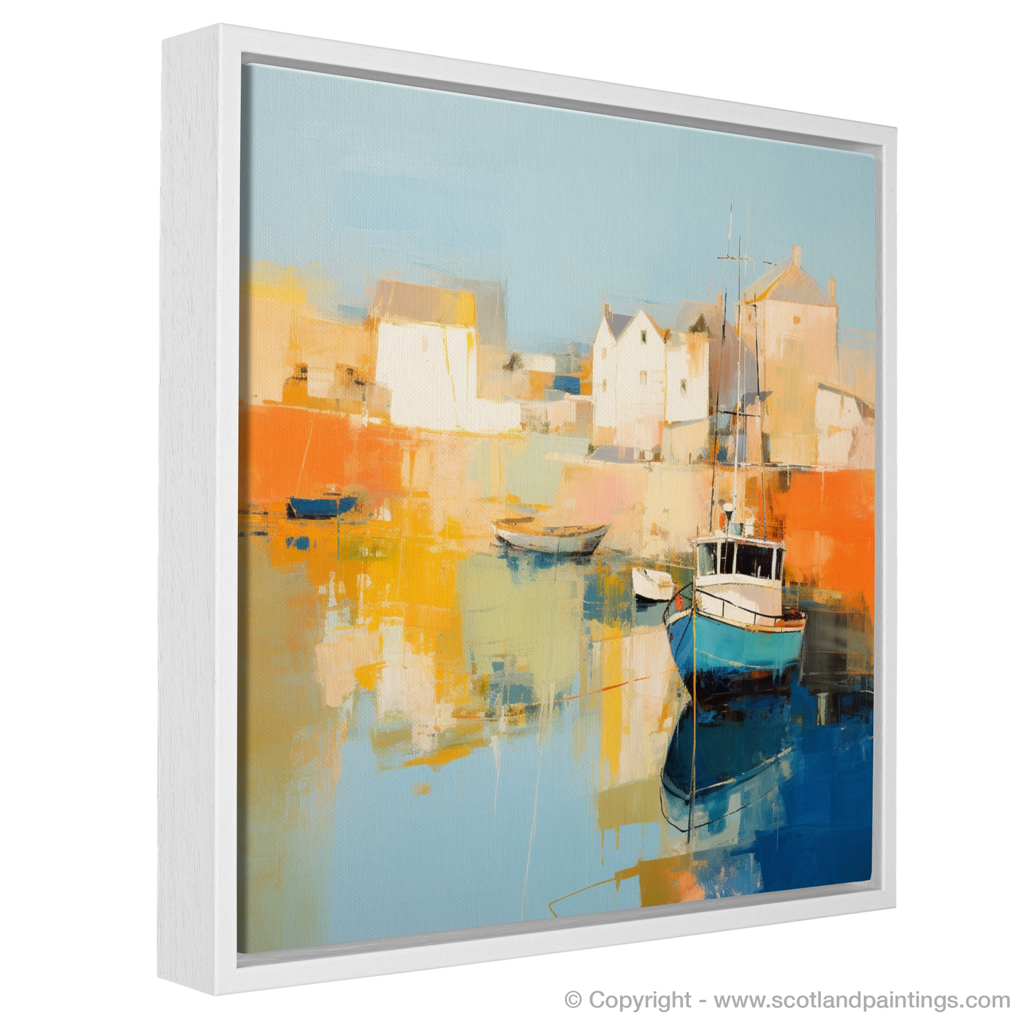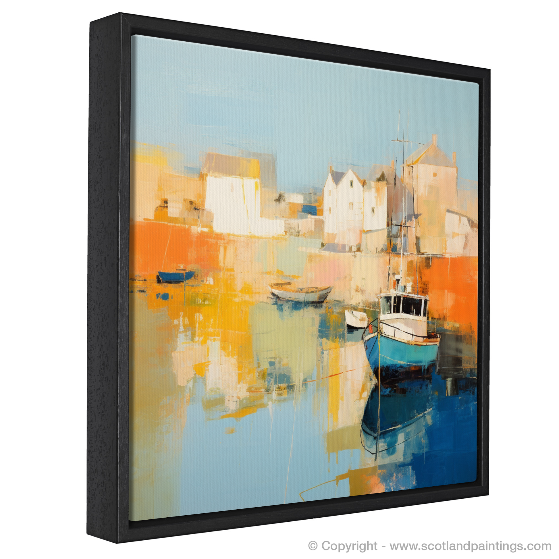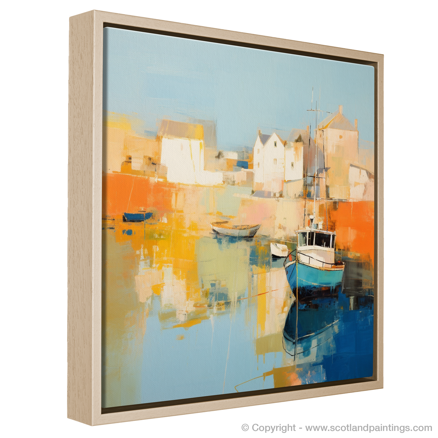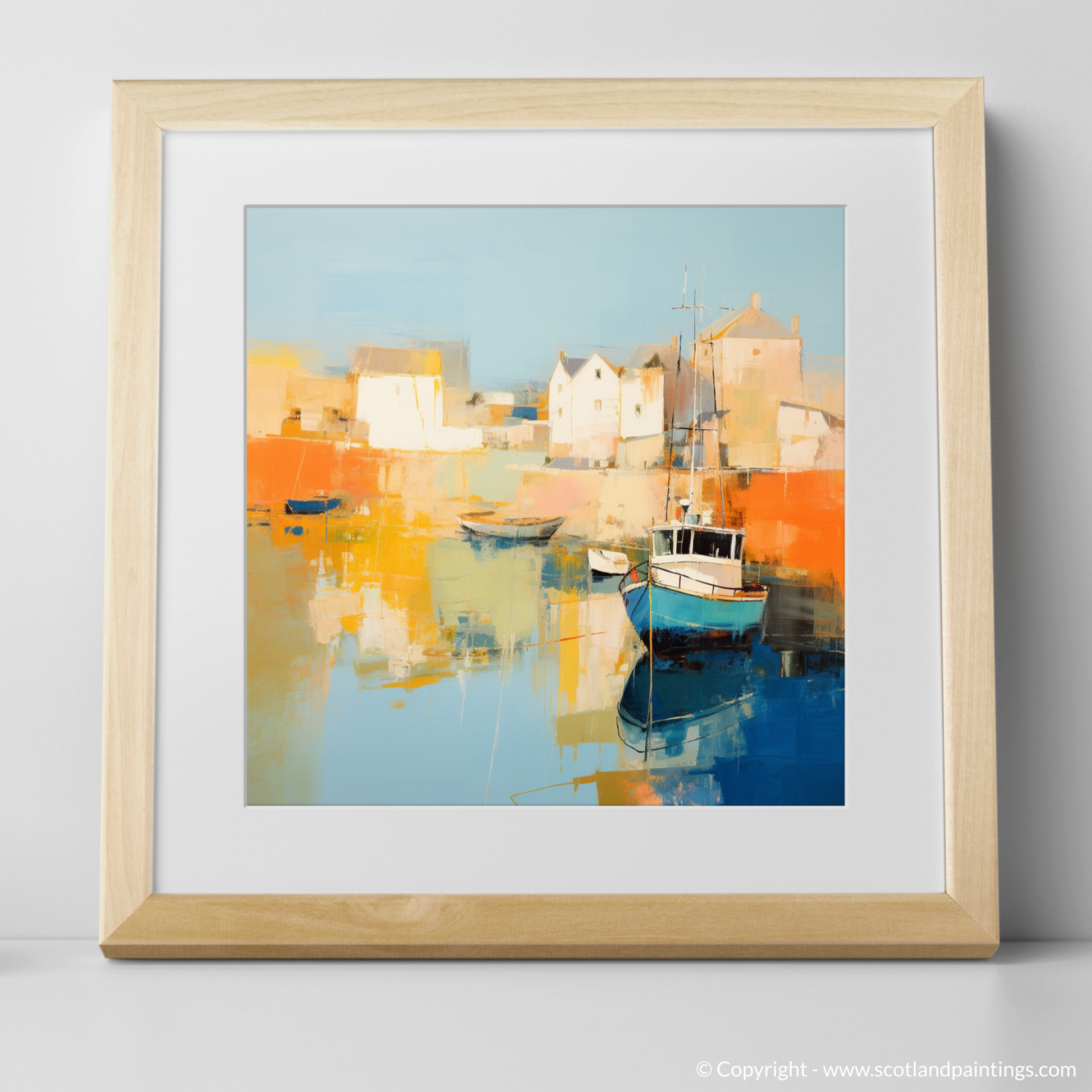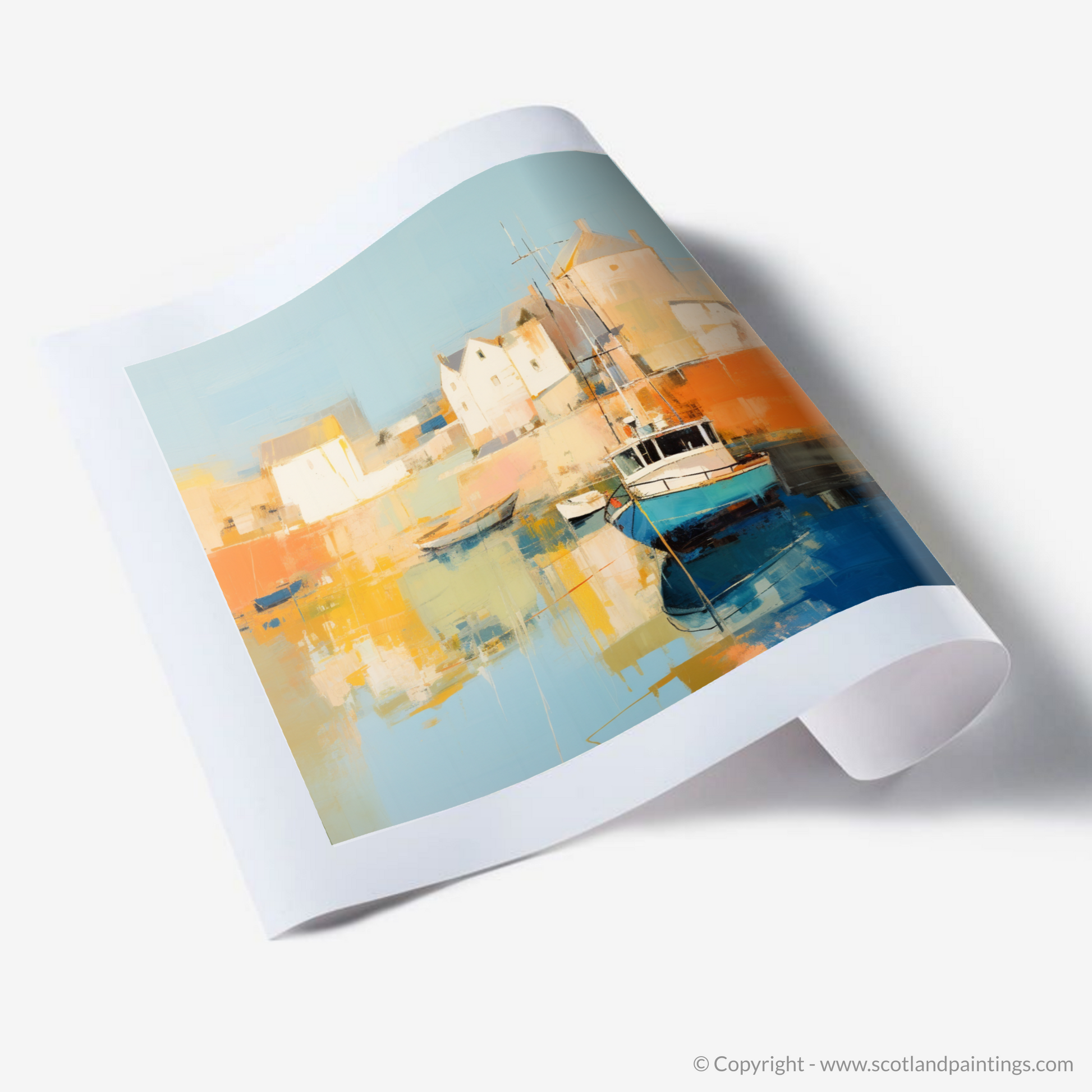 Immerse yourself in the tranquil beauty of coastal life with our striking abstract interpretation of Stonehaven Harbour bathed in the ethereal light of golden hour. This exquisite print captures the serene essence of the Scottish shoreline as day gently transitions to evening.