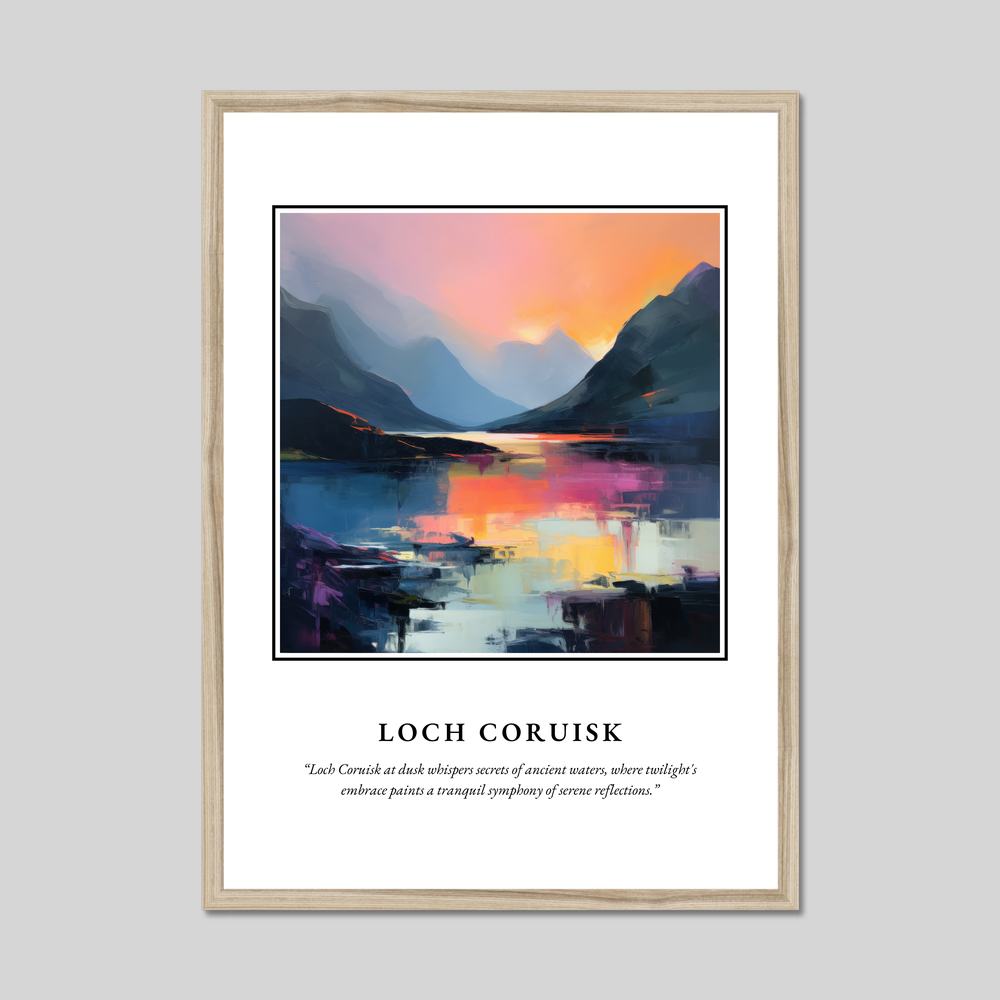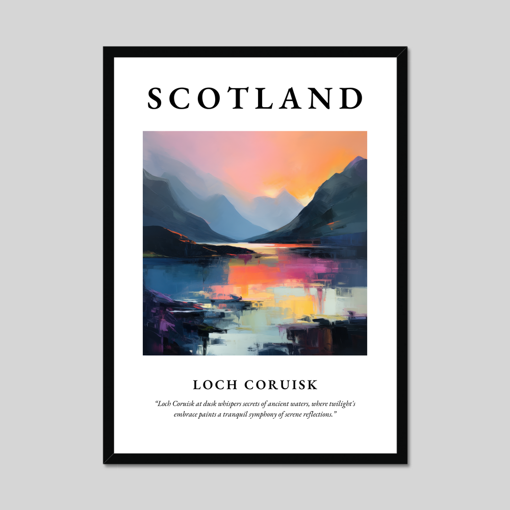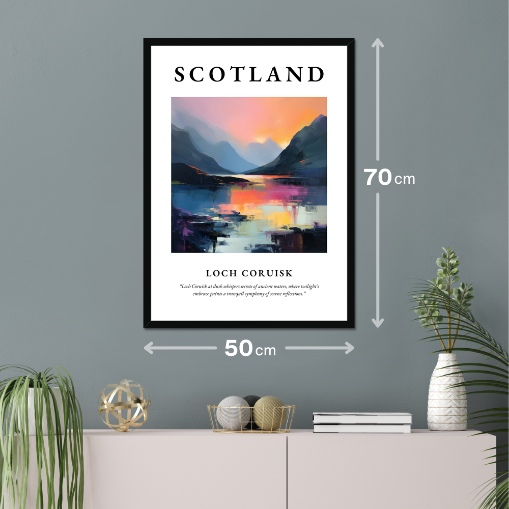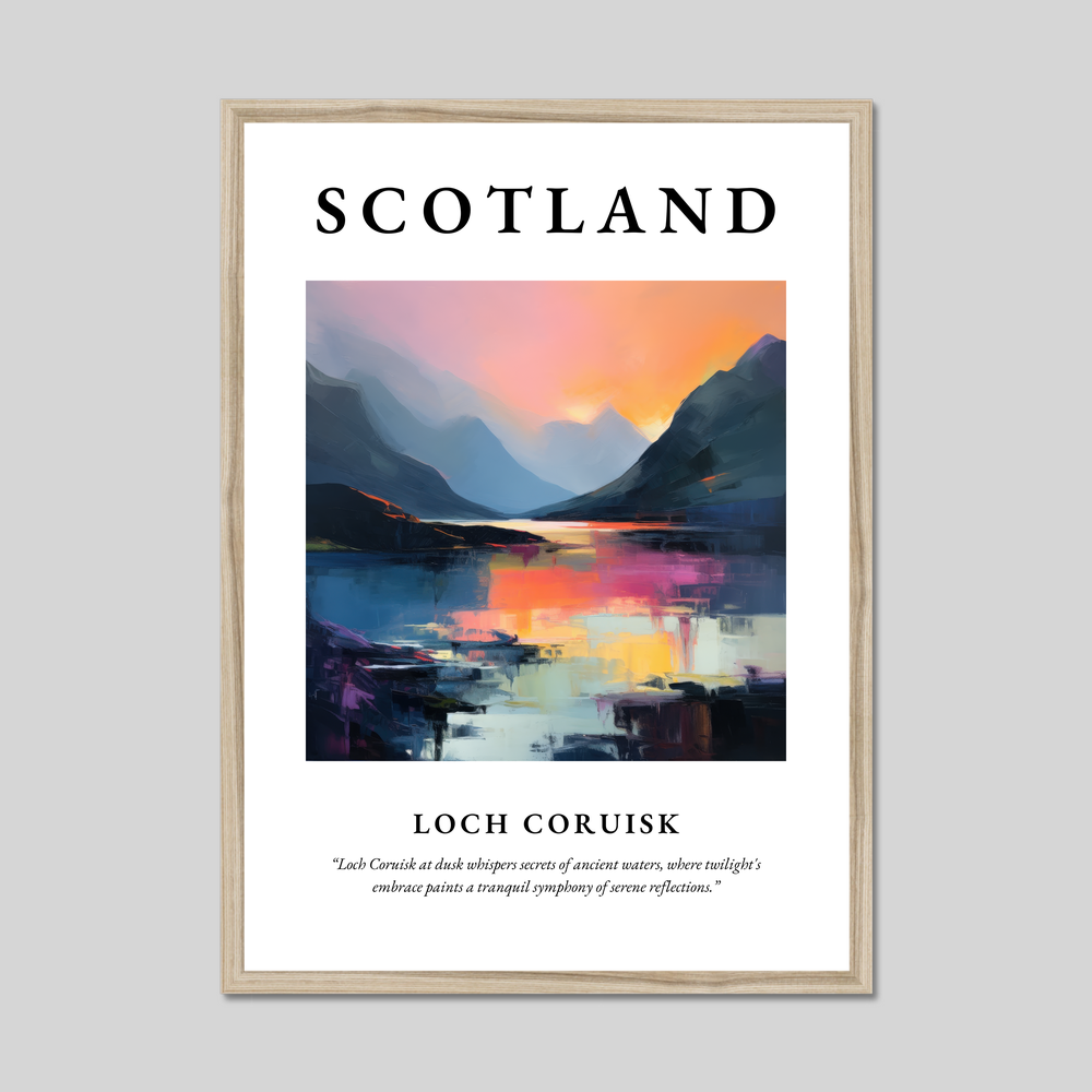 Immerse yourself in the enchanting beauty of Scotland with our striking art print poster, designed to captivate the hearts of art aficionados and Scottish enthusiasts alike. Measuring an impressive 50cm x 70cm, this large-scale piece is a statement addition to any room, offering a majestic portrayal of the mystical Loch Coruisk. Available in a choice of sophisticated black, pristine white, or natural wood-effect frame options, it elegantly complements a variety of interior styles.