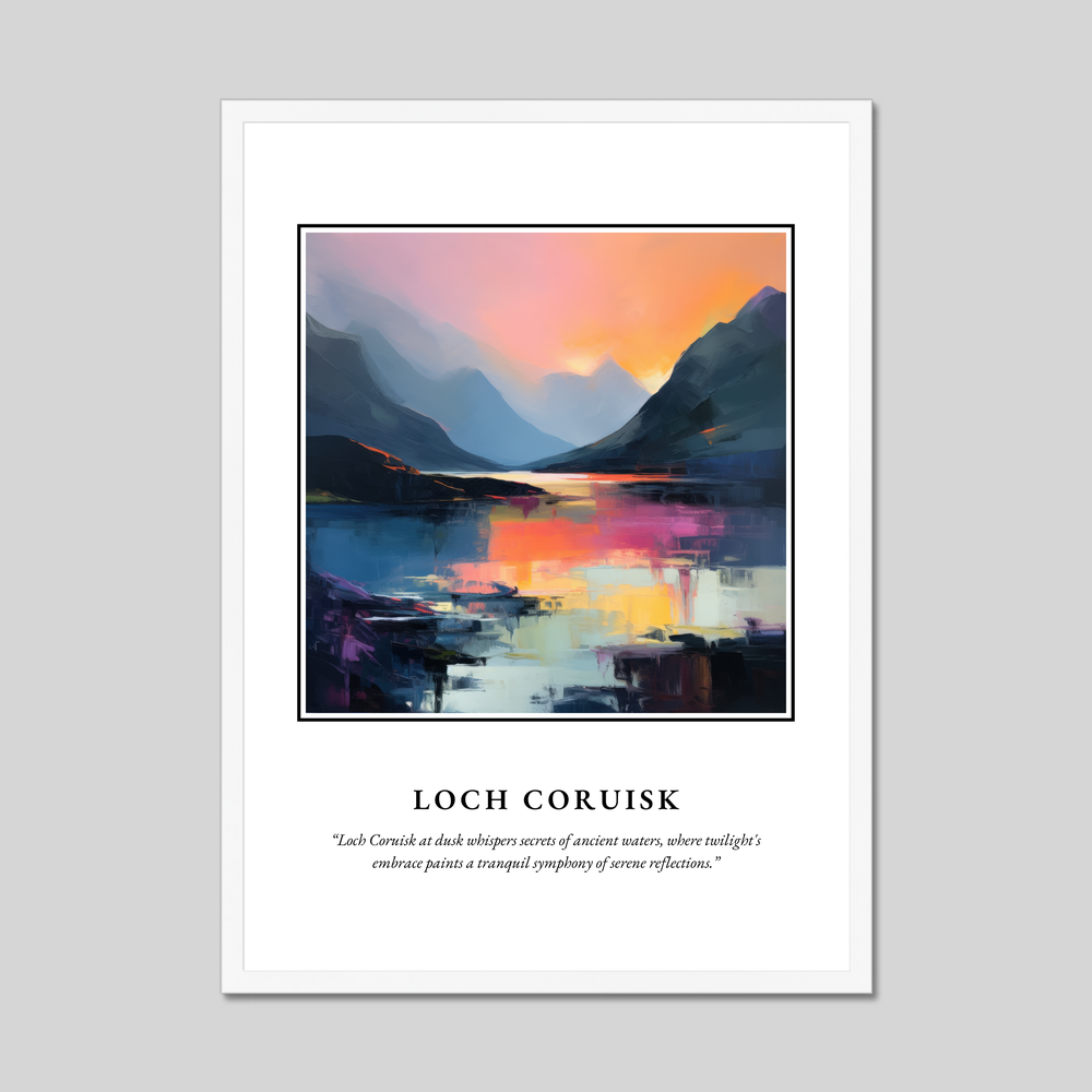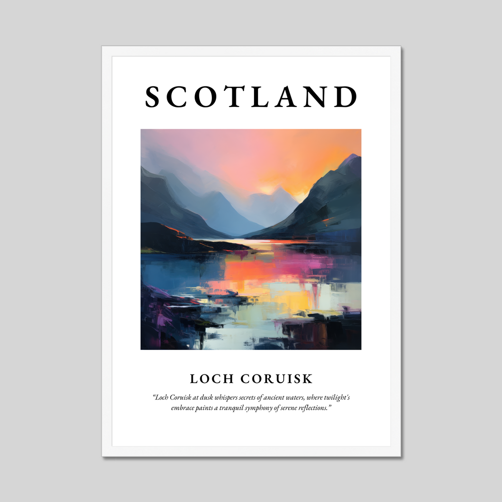 The abstract painting captures Loch Coruisk in a mesmerising dance of colour and form, where twilight hues blend effortlessly into serene reflections. At the pinnacle of the poster, the name "SCOTLAND" is emblazoned in bold lettering, setting the stage for the visual symphony below. Beneath the artwork, a poetic quote breathes life into the scene: “Loch Coruisk at dusk whispers secrets of ancient waters, where twilight's embrace paints a tranquil symphony of serene reflections.” This beautifully lyrical description enriches the experience, inviting both contemplation and nostalgia.