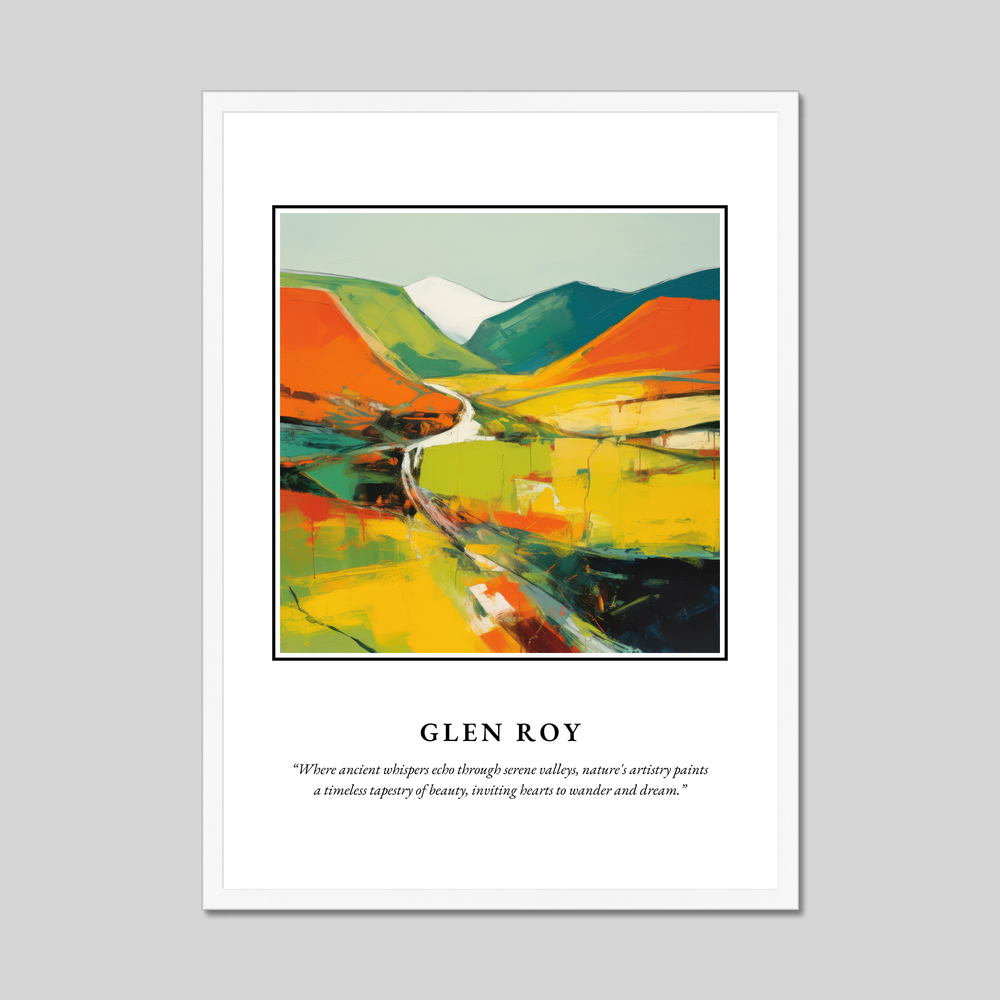 The centrepiece of the poster is an abstract interpretation of Glen Roy, where vibrant swathes of colour blend seamlessly, capturing the essence of the landscape's natural beauty. Bold oranges, lush greens, and serene blues intertwine to depict rolling hills and winding paths, offering a glimpse into the sublime tranquillity of this scenic glen. It's perfect for art lovers who appreciate the abstract style, nature enthusiasts, or anyone who cherishes a connection to the Scottish Highlands.