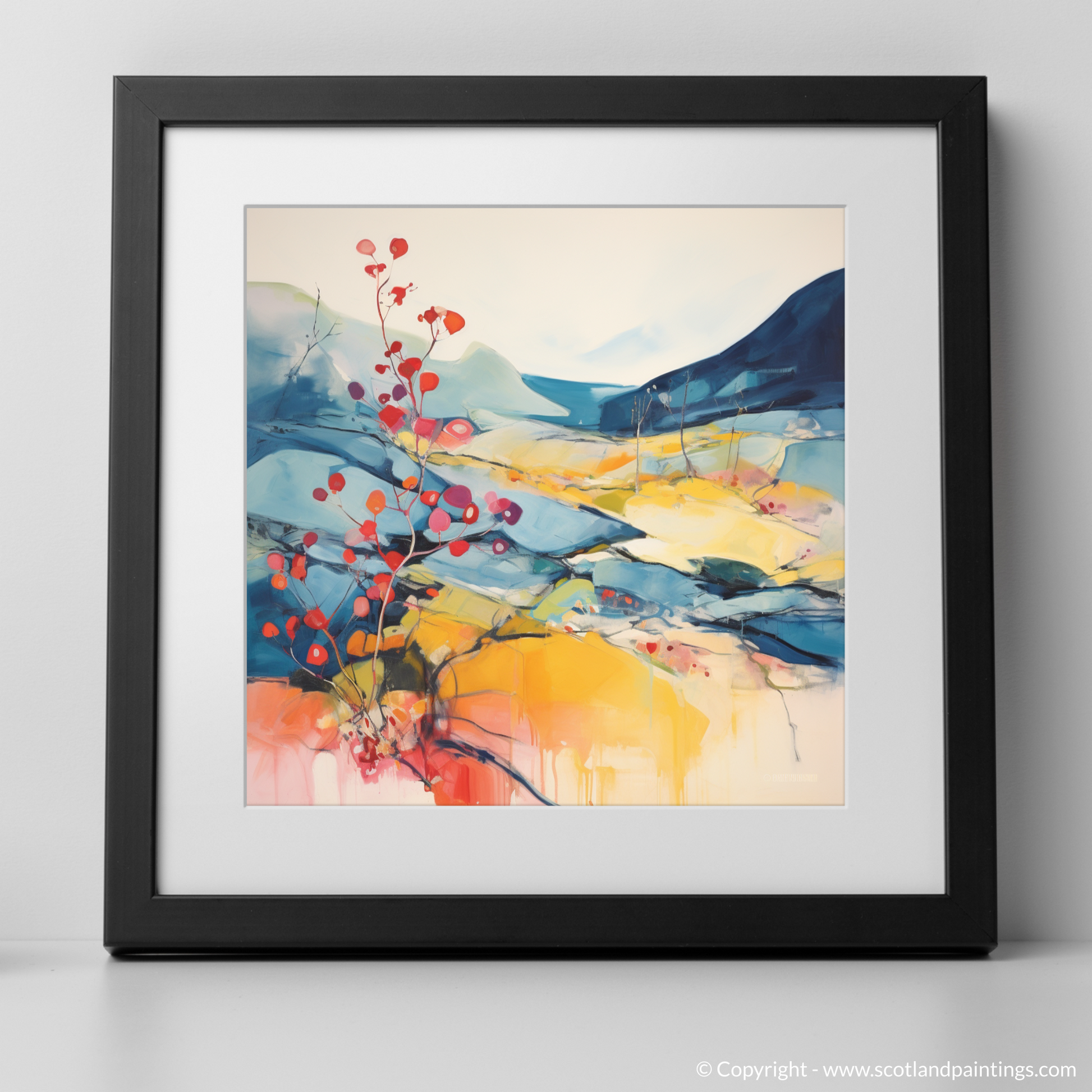 As you gaze upon this vivid abstract portrayal of Bearberry adorning the rugged terrain of the Cairngorm Mountains, allow your senses to be whisked away to the wild heart of Scotland. This exquisite print, a celebration of Scottish Flowers and Flora, features a harmonious blend of organic shapes and strokes that evoke the essence of the highland landscape.