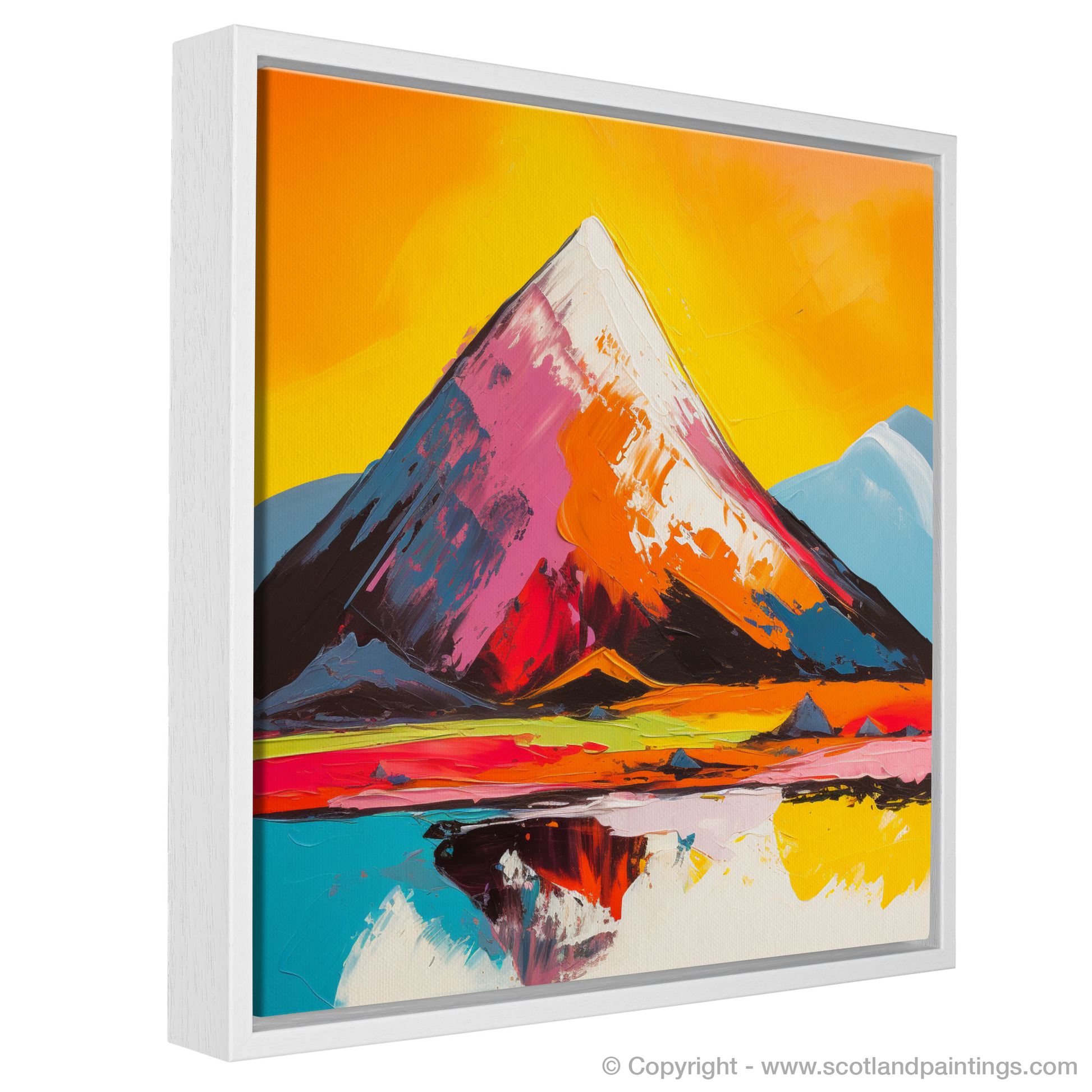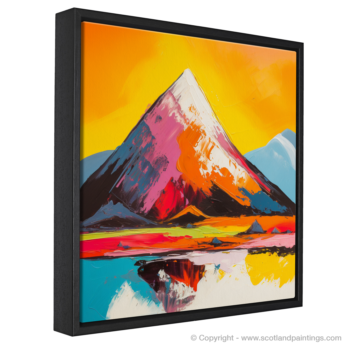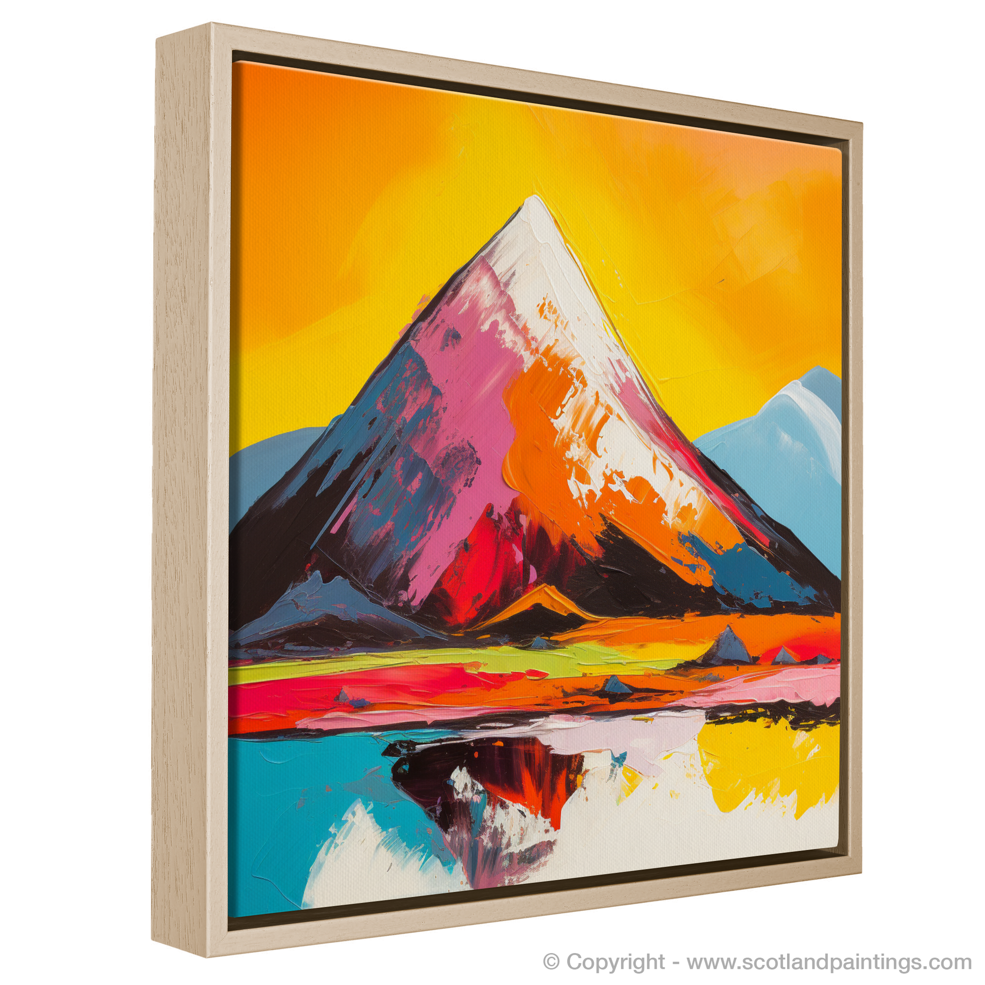 Immerse yourself in the vibrant splendour of the Scottish Highlands through this visually arresting abstract print inspired by the majestic Buachaille Etive Mòr. The piece bursts into life with a daring palette, where flamboyant oranges and vivid yellows evoke the awe-inspiring sunsets that grace Glencoe's expansive skies. These warm hues cascade over the central pyramid-like peak, suggesting the last light caressing its rugged silhouette.