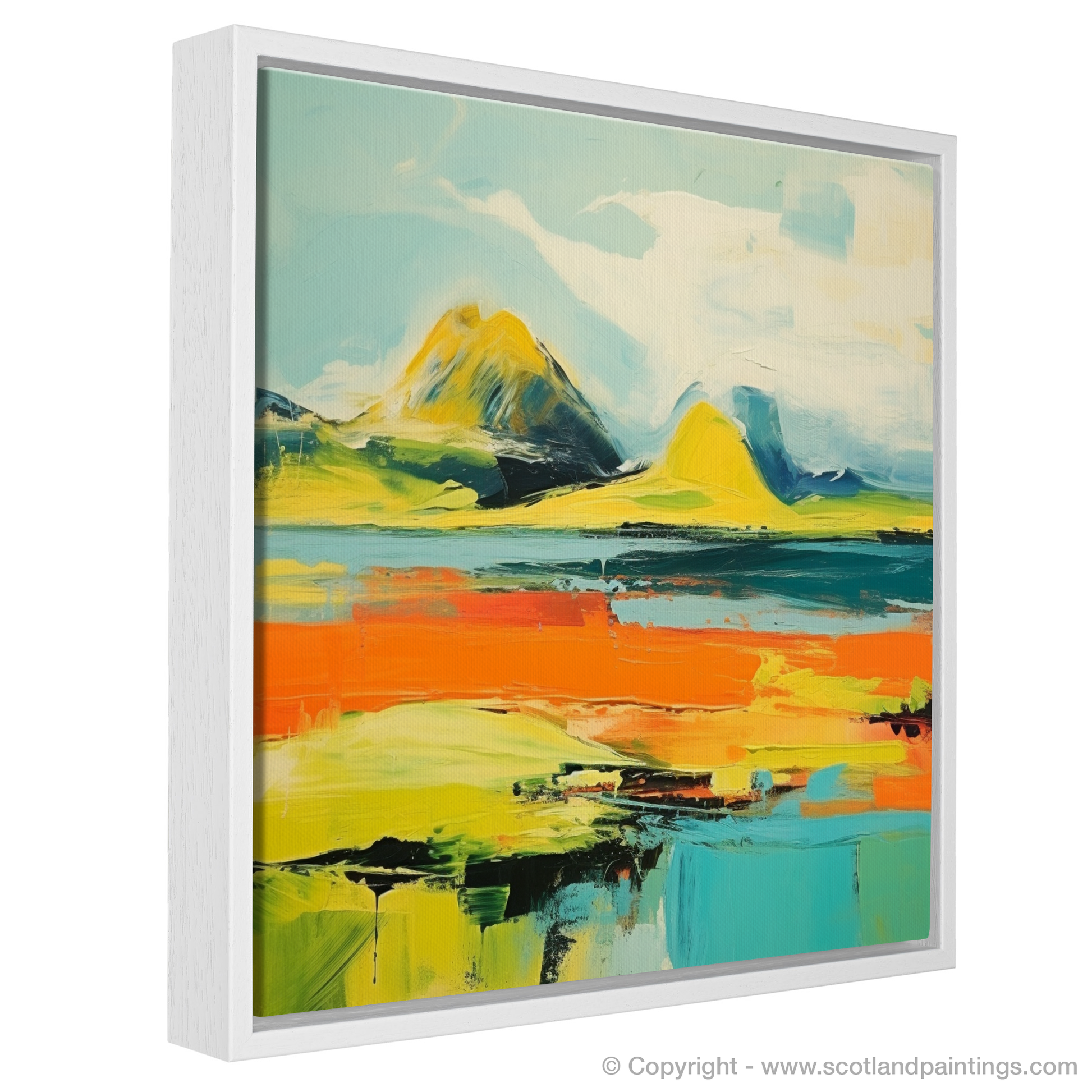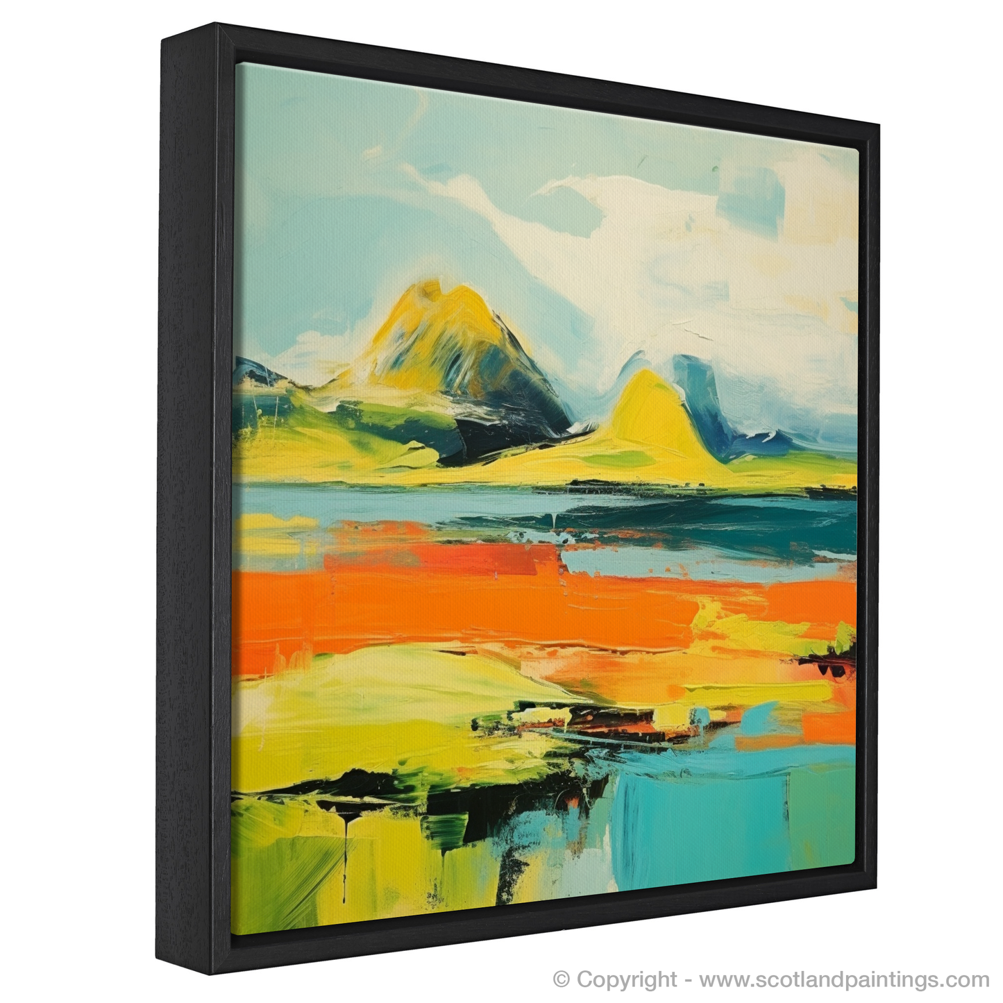 Let the bold strokes and vibrant hues of this abstract masterpiece transport you to the Isle of Rum, a gem nestled in the Inner Hebrides. Echoes of the island's natural charm resonate through the vivid layers of paint, where the essence of rugged peaks and undulating hills are reimagined in a symphony of colors. Pops of fiery orange and tranquil aquamarine dance across the canvas, reflecting the dynamic meeting of land and sea characteristic of Scottish landscapes.