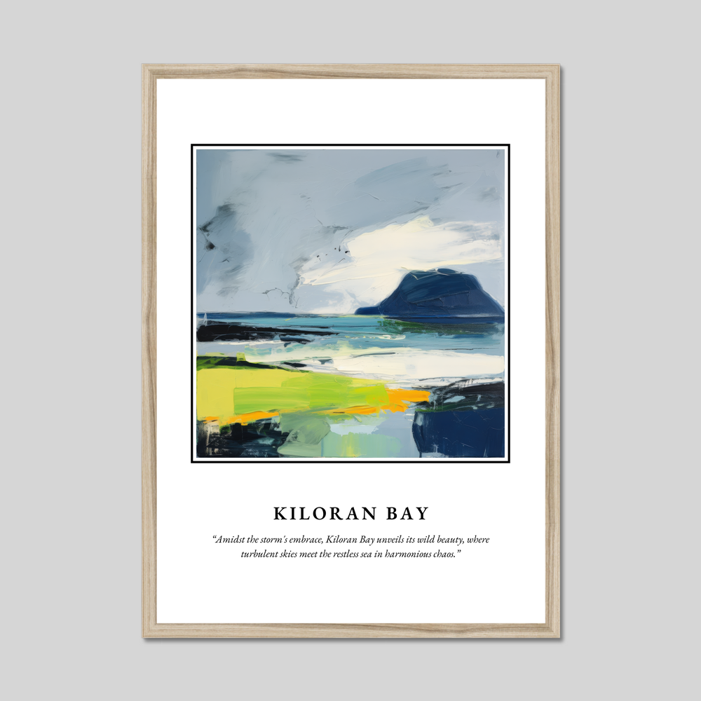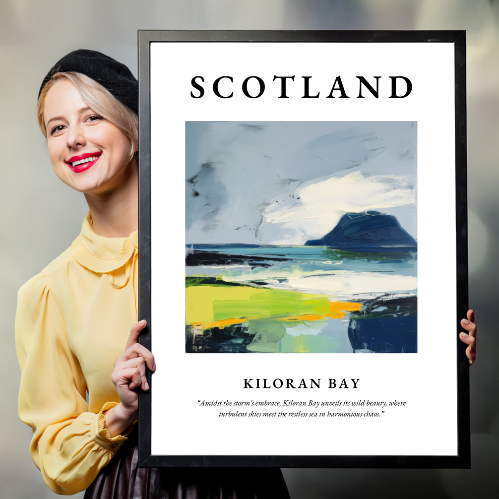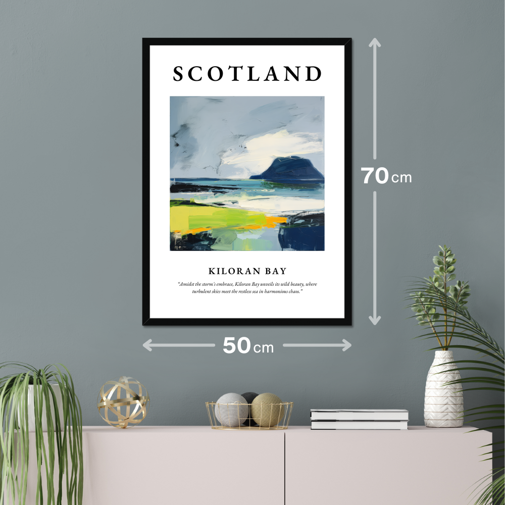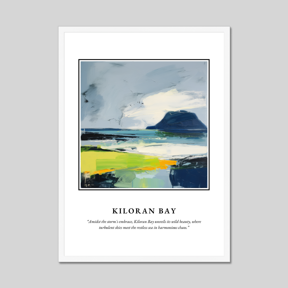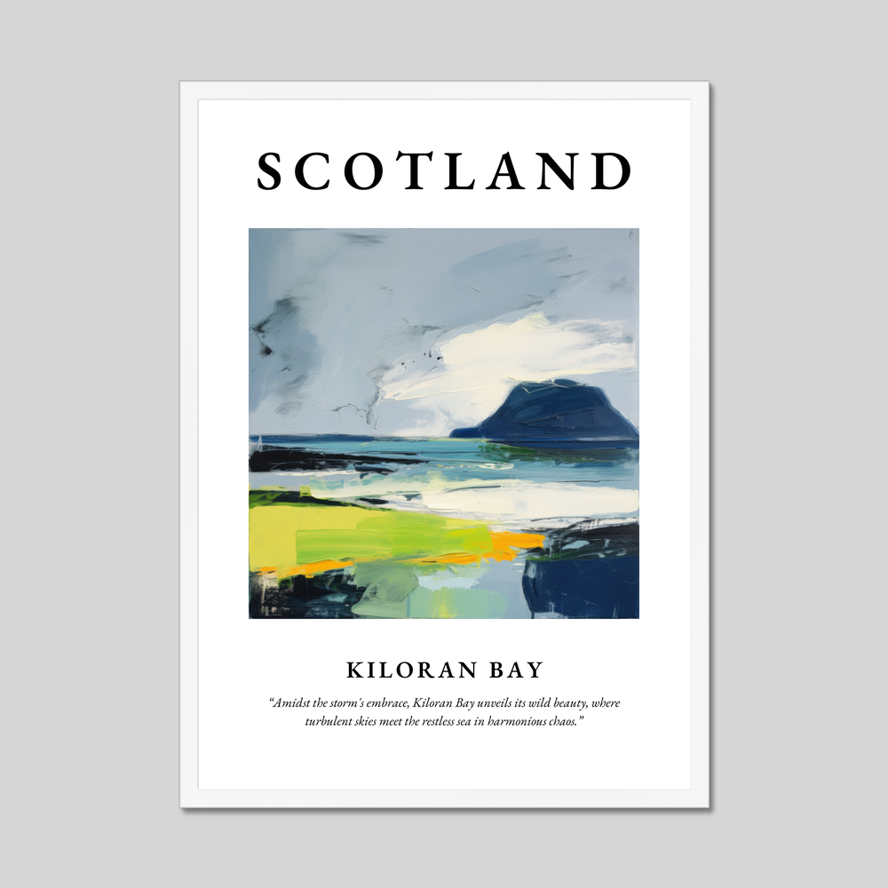 The poster’s layout is a visual journey, with “SCOTLAND” prominently displayed in bold lettering, inviting viewers to explore the renowned landscape beneath. The abstract painting of Kiloran Bay captures the essence of a place where nature’s heart beats wild and free. Swathes of rich blues and dramatic greens play amidst dynamic brush strokes, reflecting the turbulent skies and the restless sea in stunning harmony. Beneath this visual masterpiece, discover the evocative quote, “Amidst the storm's embrace, Kiloran Bay unveils its wild beauty, where turbulent skies meet the restless sea in harmonious chaos.”