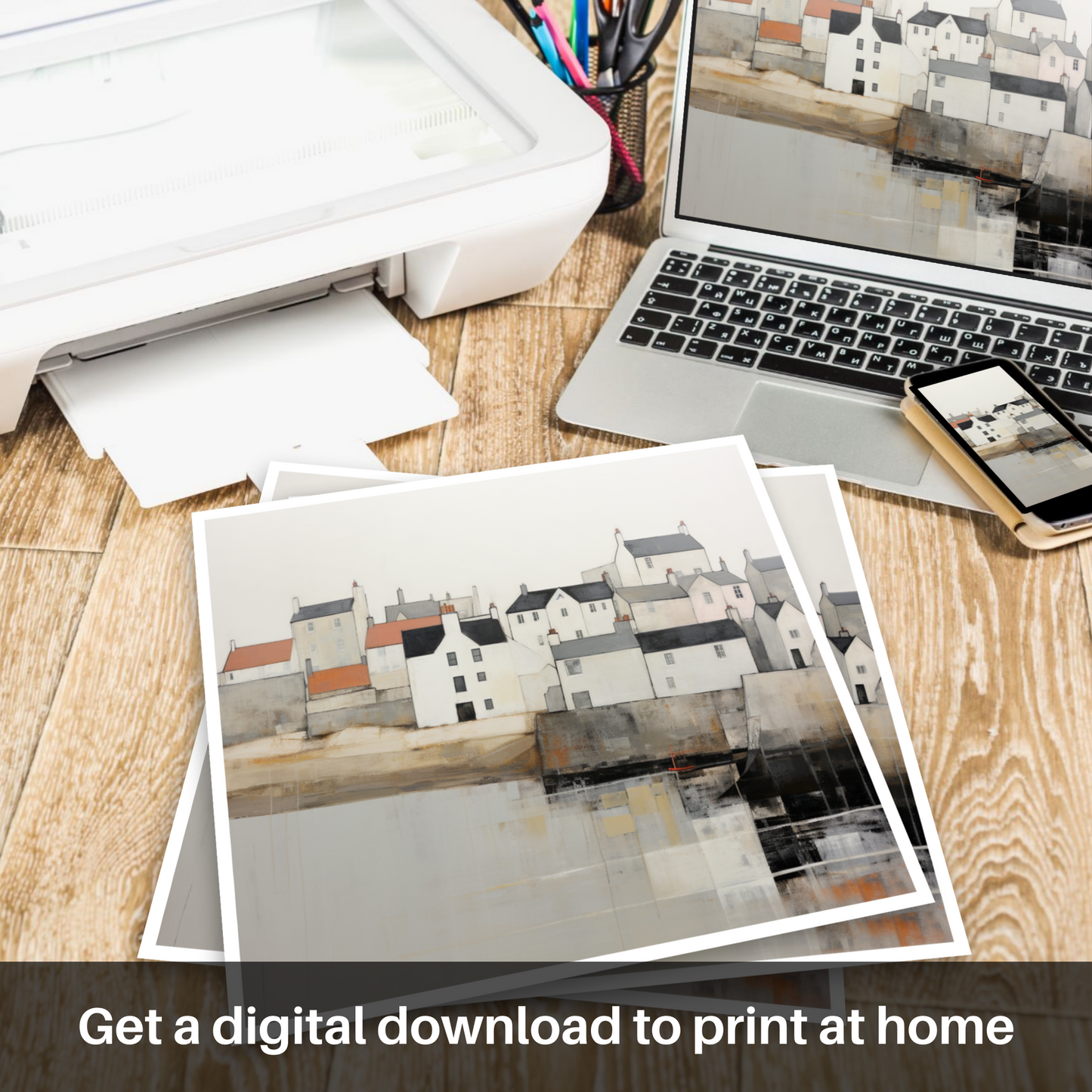 Immerse yourself in the whimsical charm of a Scottish village with this evocative abstract print, capturing the essence of Elie, Fife. The scene before you is a captivating blend of the familiar and the imaginatively reinterpreted; a quaint hamlet seemingly paused in time.