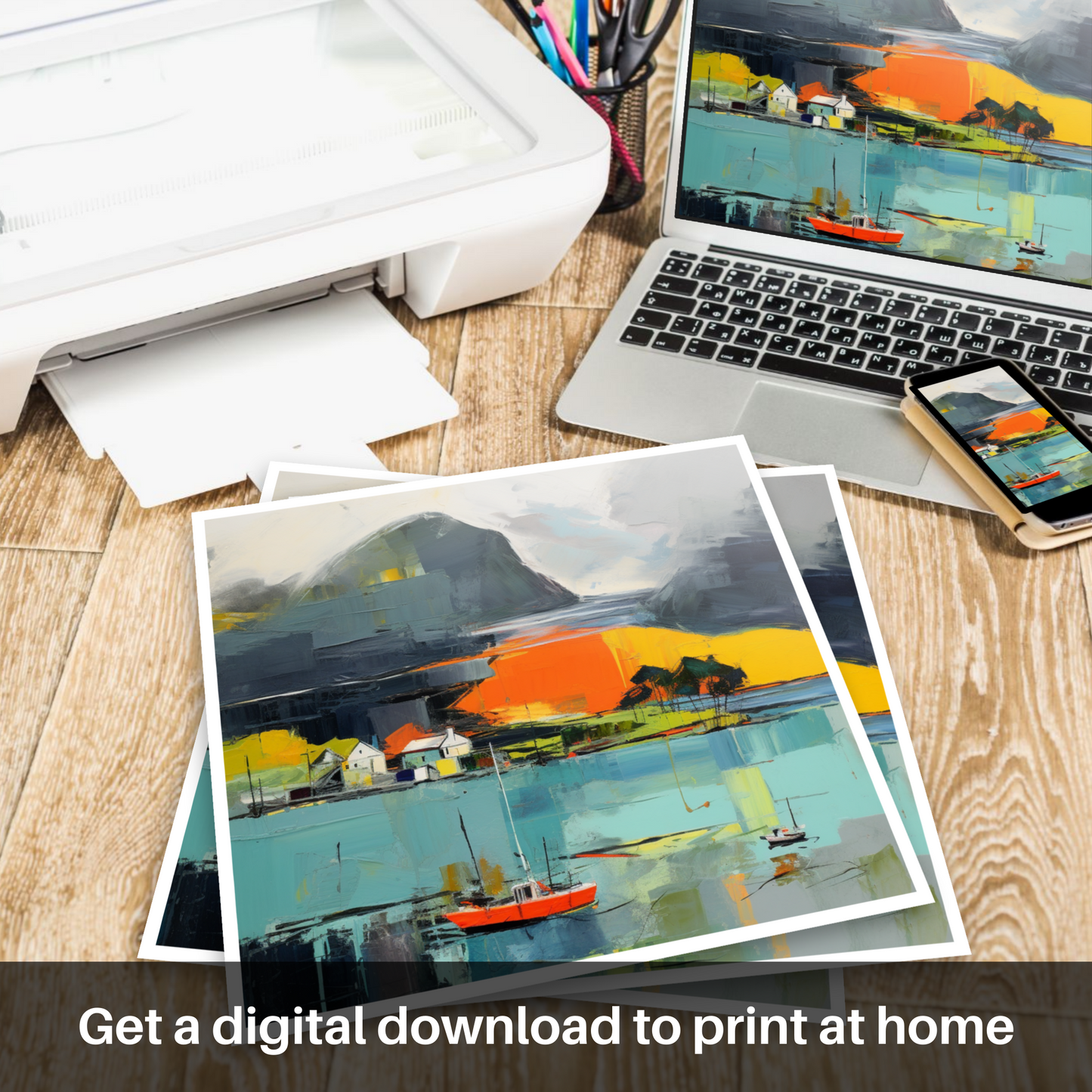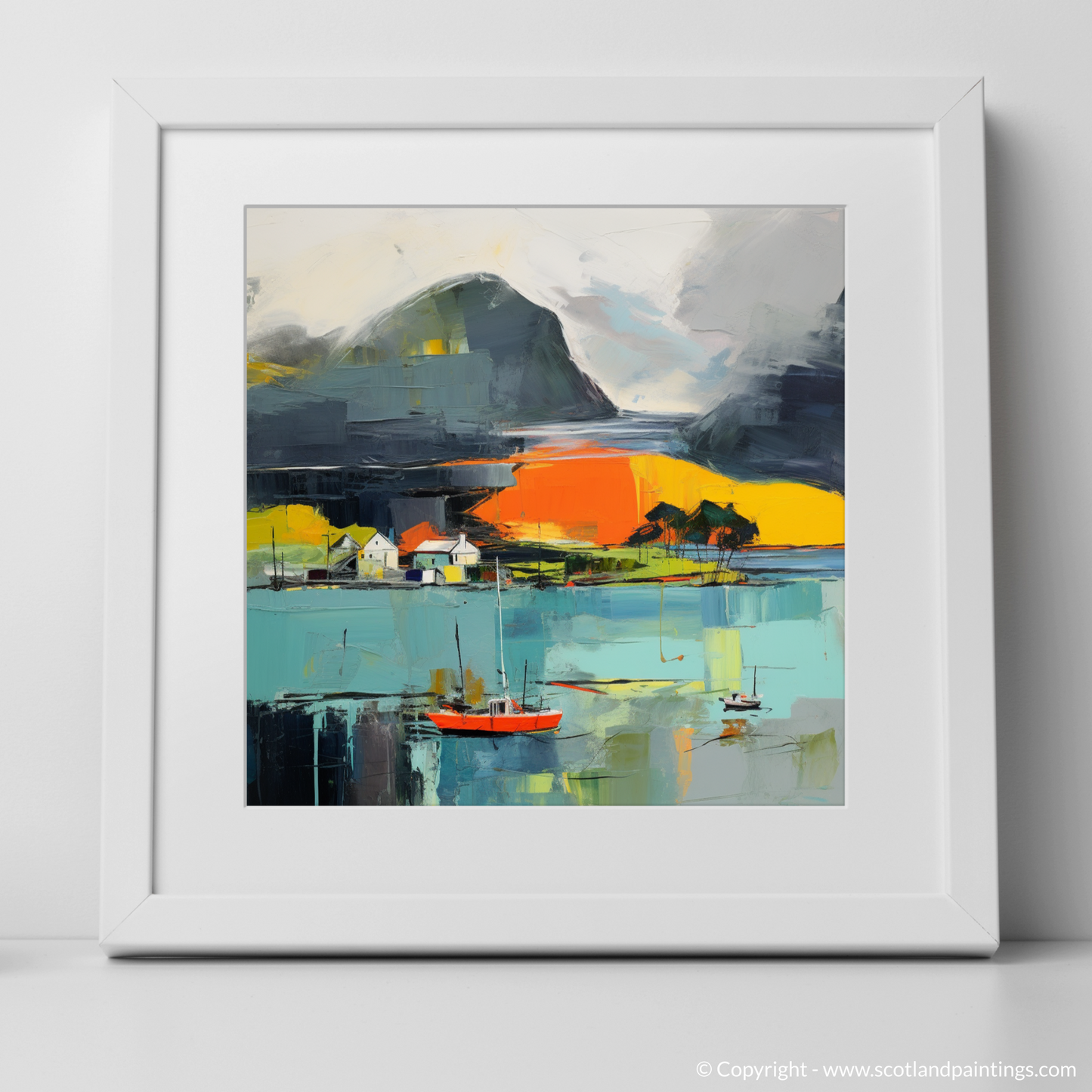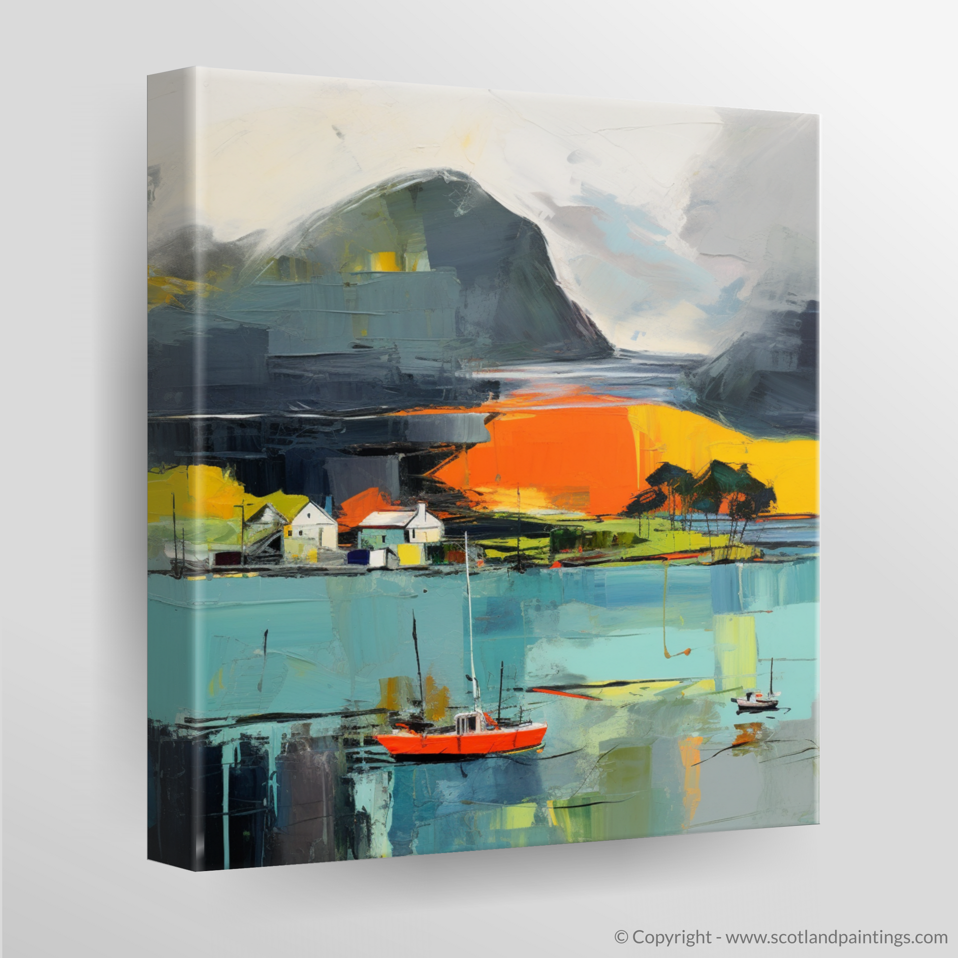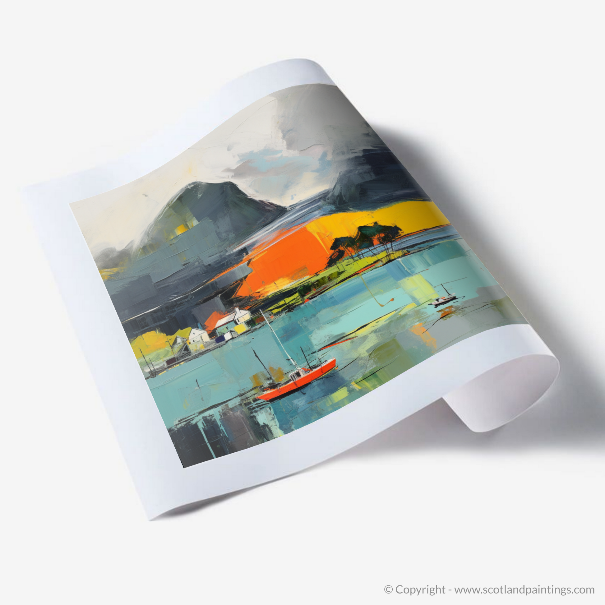 This print is more than a visual escape; it is an ode to the Scottish coast's ever-changing beauty, an abstract representation that inscribes the soul of Isleornsay Harbour onto canvas, offering viewers a gateway to a world where land, sea, and sky converge in a symphony of colour and form.