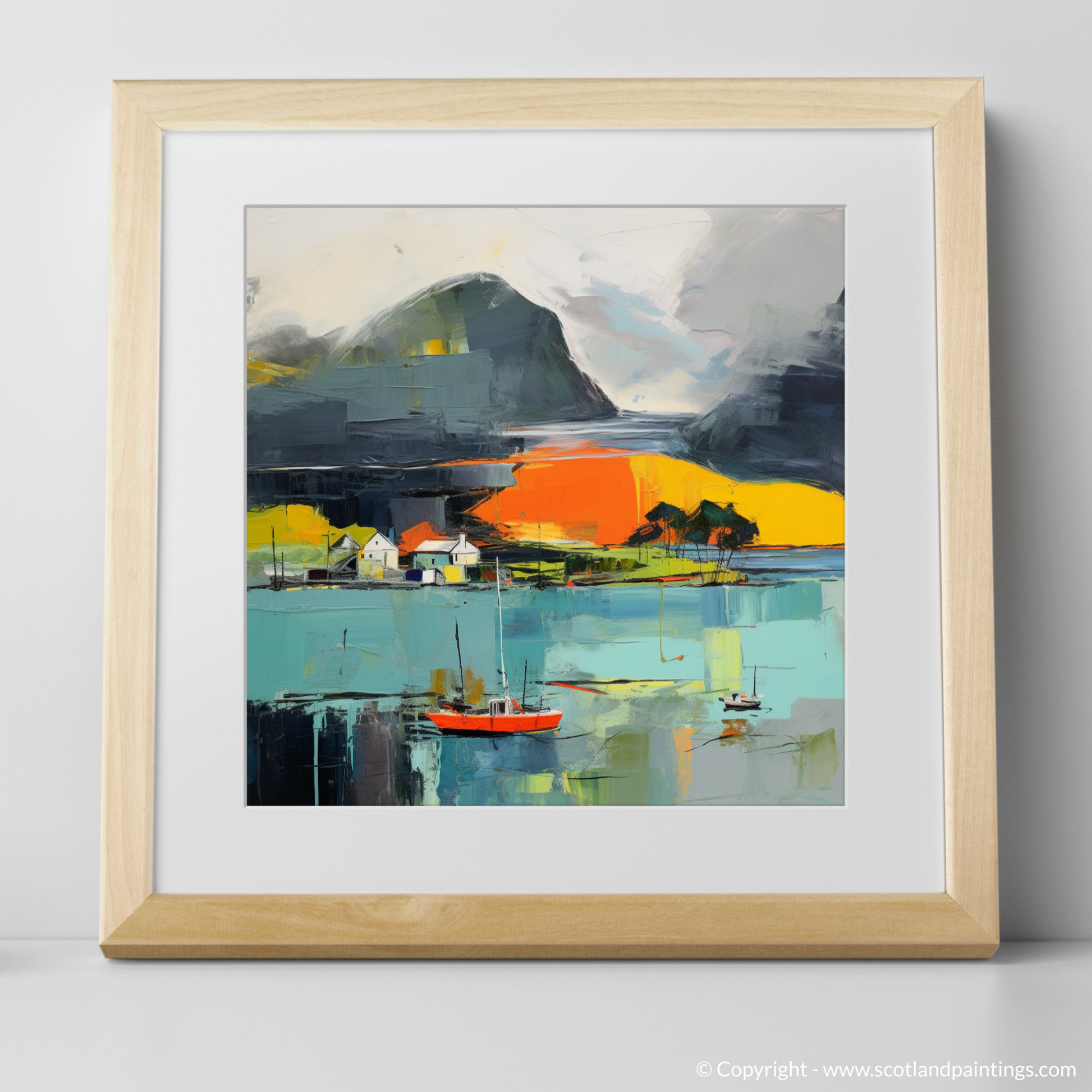 Swept by the tempestuous embrace of a stormy sky, this captivating abstract print brings to life Isleornsay Harbour with a vividness that stirs the soul. Broad, impulsive strokes of slate and charcoal conjure the brooding presence of clouds rolling in from the horizon, an embodiment of nature’s raw elements at play.
