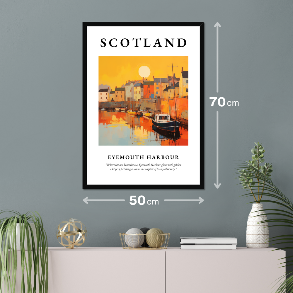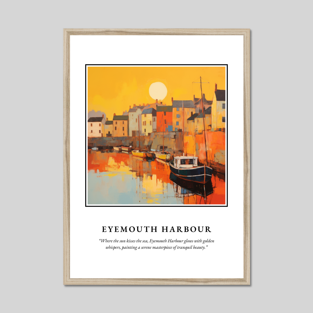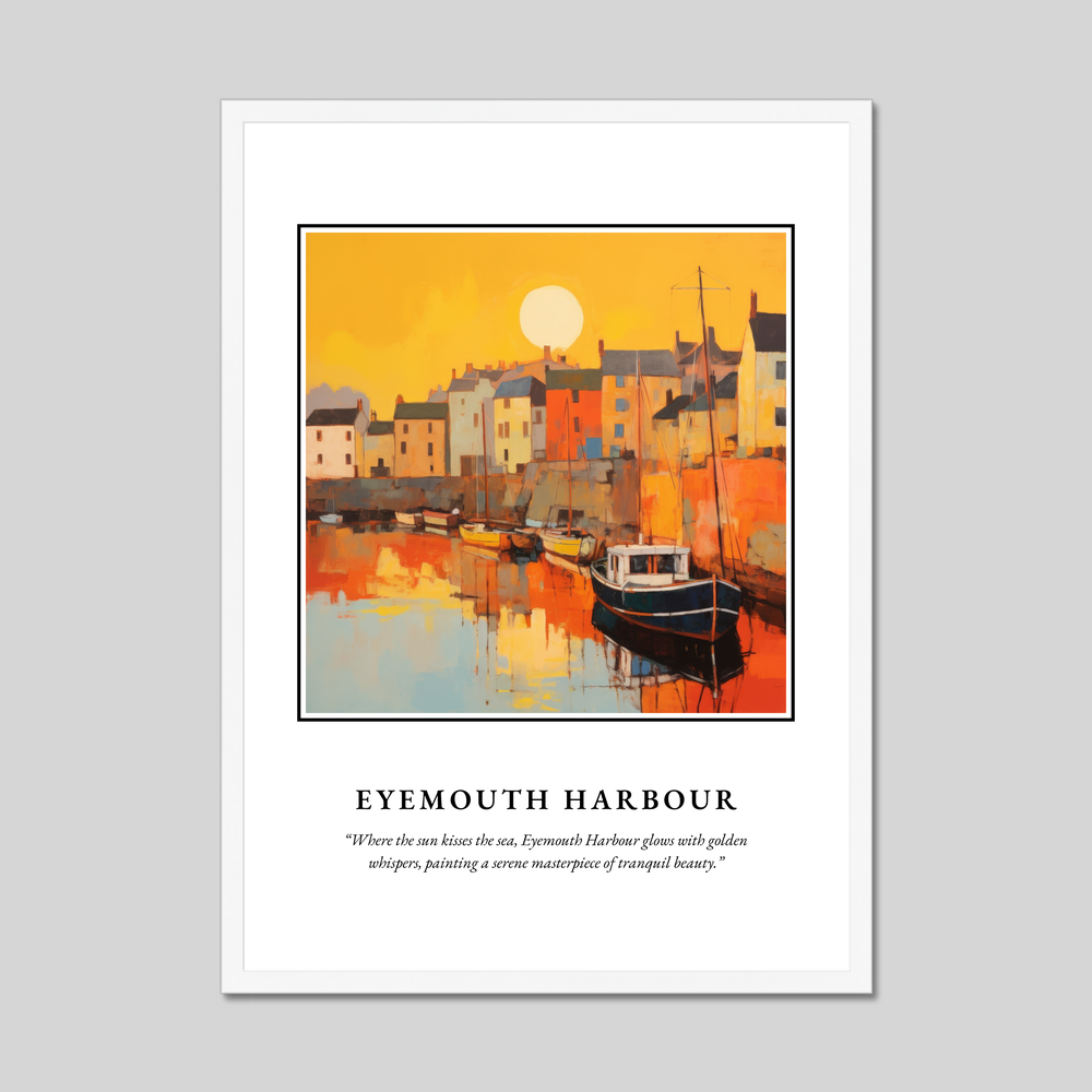 Experience the enchanting allure of the Scottish coast with this striking framed poster print, perfectly sized at a generous 50cm x 70cm. Ideal for art enthusiasts and admirers of the abstract style, this captivating piece brings the vibrancy of Eyemouth Harbour into your home, adorned with the resonating words: “Where the sun kisses the sea, Eyemouth Harbour glows with golden whispers, painting a serene masterpiece of tranquil beauty.”