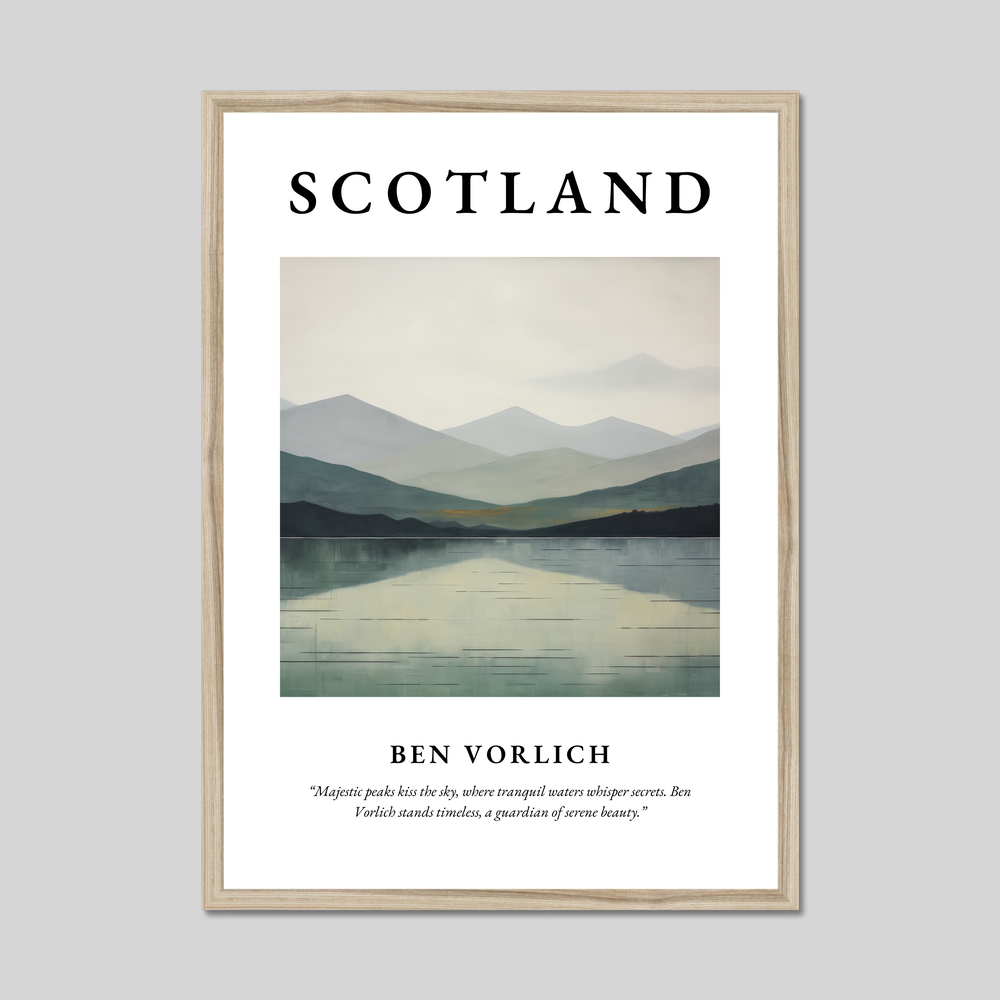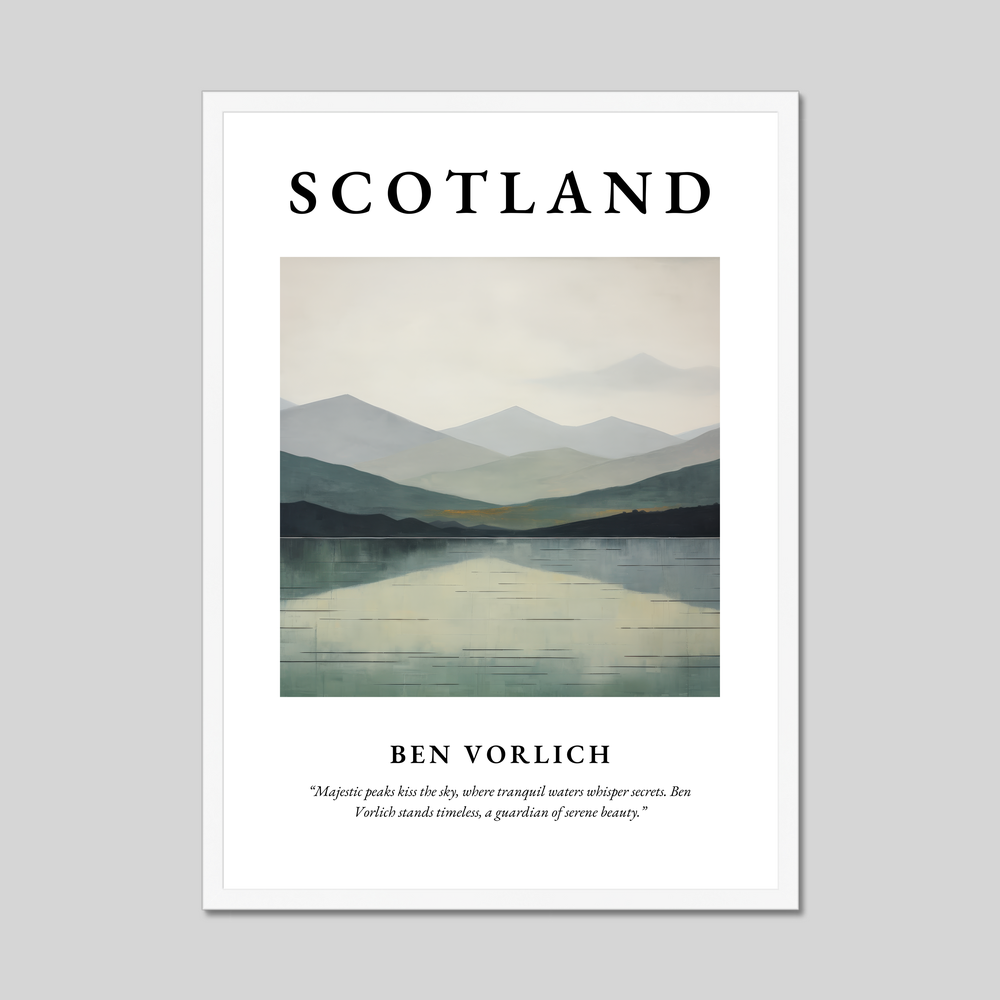 The word "SCOTLAND" stands proudly at the top in striking bold lettering, evoking the strength and heritage of this storied land. Below, an abstract portrayal of Ben Vorlich captures the scene’s ethereal beauty. The artistry employs subdued tones and sweeping brushstrokes to depict the mountain’s majestic peaks and serene waters, offering a contemporary twist on a classic natural wonder.