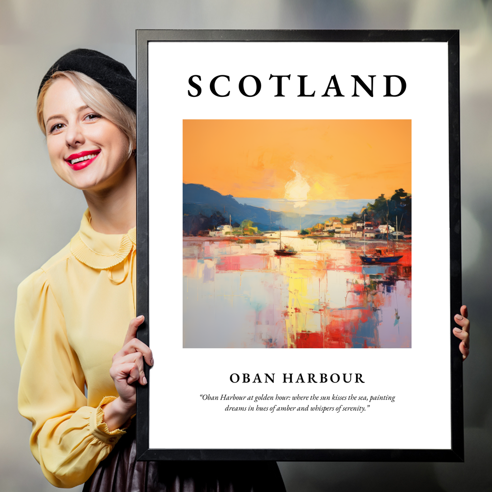 The giant lettering of “SCOTLAND” at the top proudly announces the origin of this serene vista, an essential addition for those with a love of Scotland or a cherished connection to Oban. Beneath the dramatic brushstrokes capturing the harbour at its golden hour, the evocative quote reads: “Oban Harbour at golden hour: where the sun kisses the sea, painting dreams in hues of amber and whispers of serenity.” This description perfectly encapsulates the warm, dreamy atmosphere that the artwork conveys.