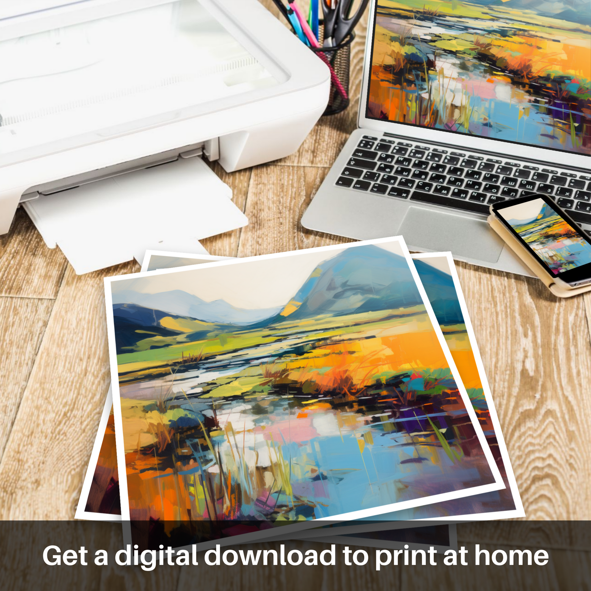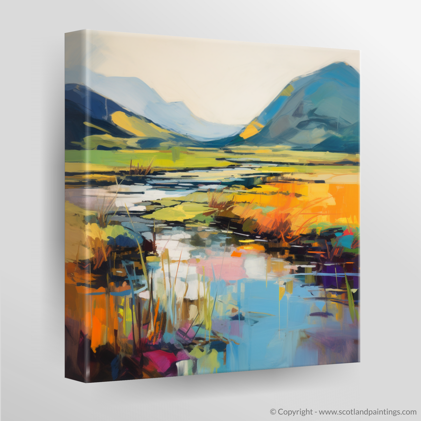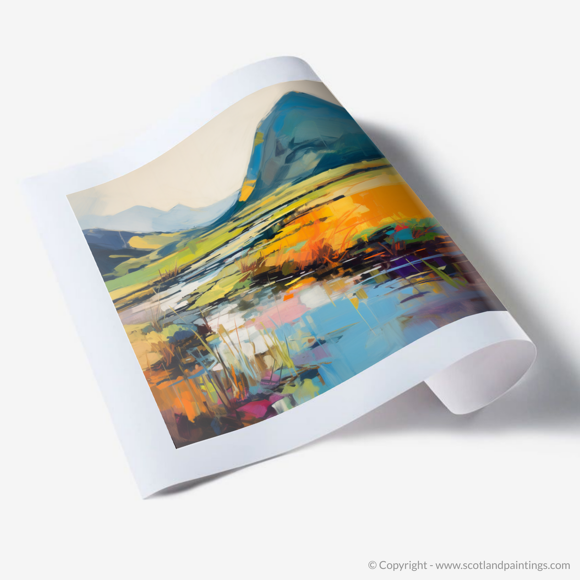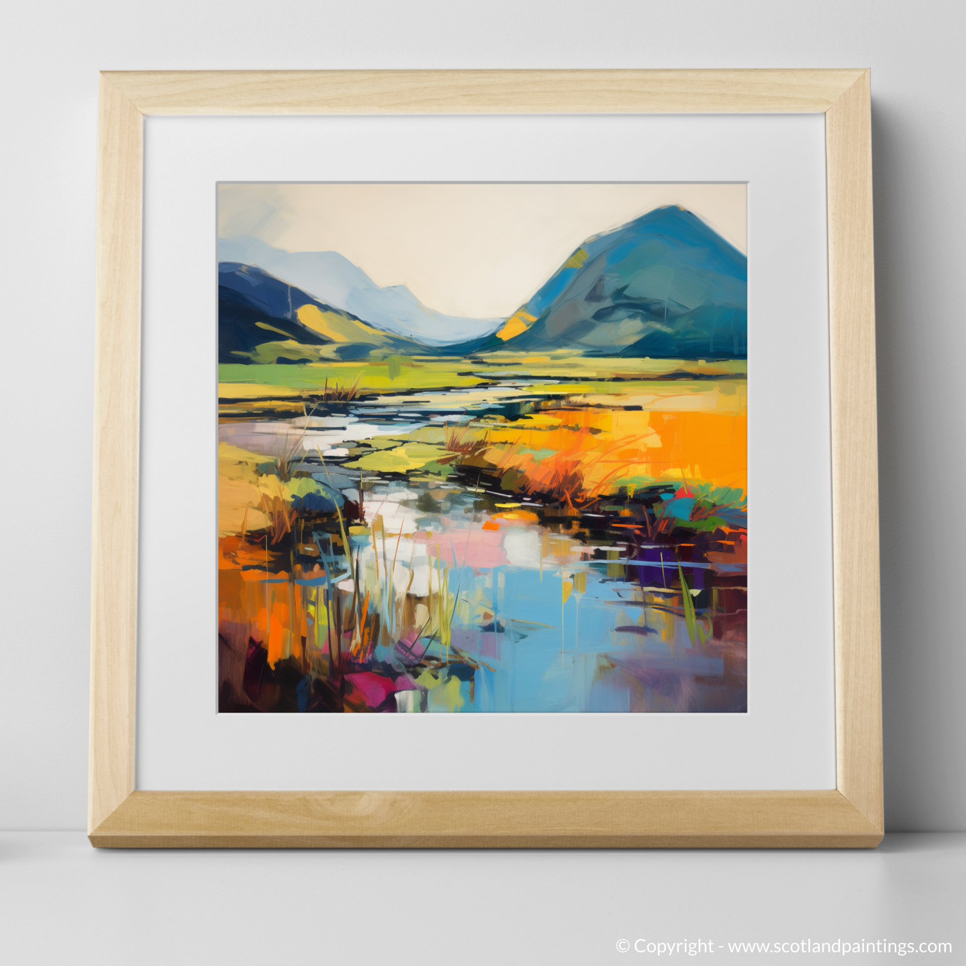 Immerse yourself in the vibrant tapestry of colour and emotion with this exquisite print, a piece that offers a contemporary abstract take on the serene beauty of the River Coe reflections in Glencoe. Bold, expressive brushstrokes dance across the canvas, capturing the dynamic essence of this breathtaking landscape in a symphony of saturated hues and abstract forms.