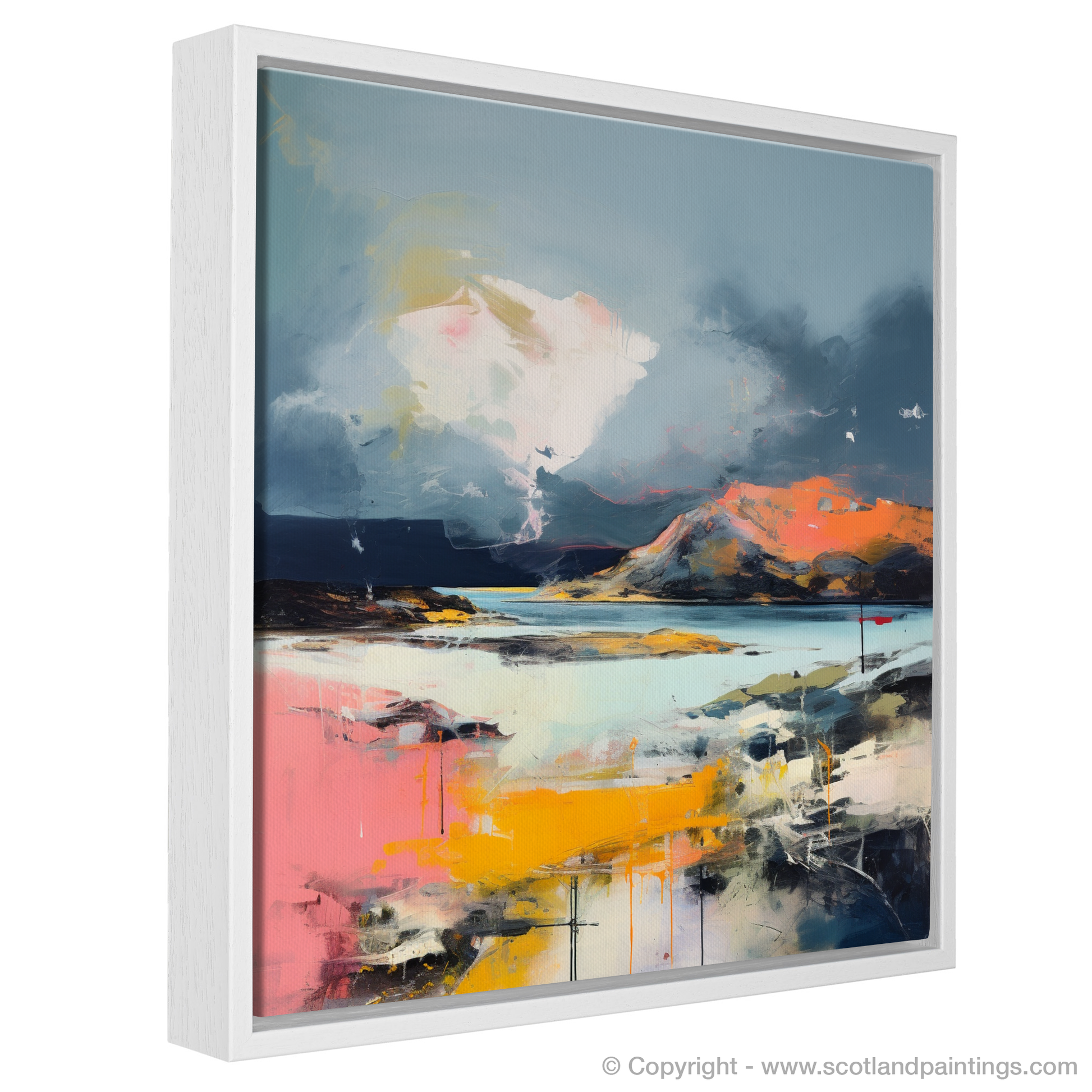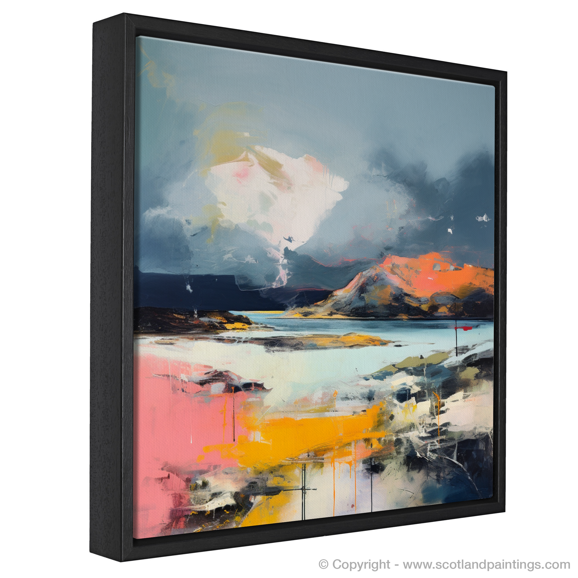 Embrace the untamed spirit of Scotland's natural beauty with an expressive abstract rendition of Achmelvich Bay, where the brooding might of an impending storm is masterfully transformed into a symphony of bold colour and textured stratums. Dashes of electrifying yellows, corals, and pinks strike through the canvas like the final defiant rays of sunlight piercing heavy, tumultuous clouds, captured in thick impasto strokes that relay the ferocity of the elements. The serene blue of the Bay itself contrasts with the darkening skies, offering a striking visual representation of calm in the face of nature's restless performance.