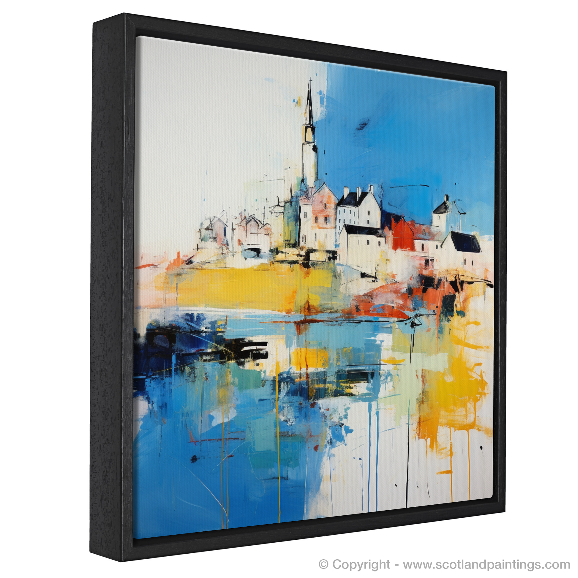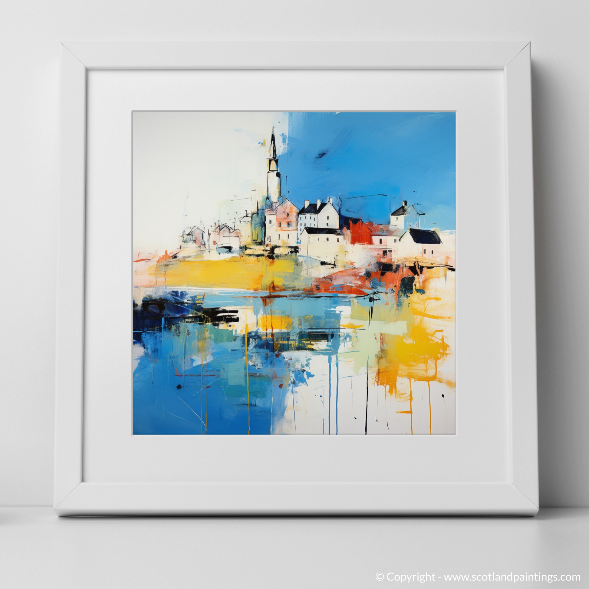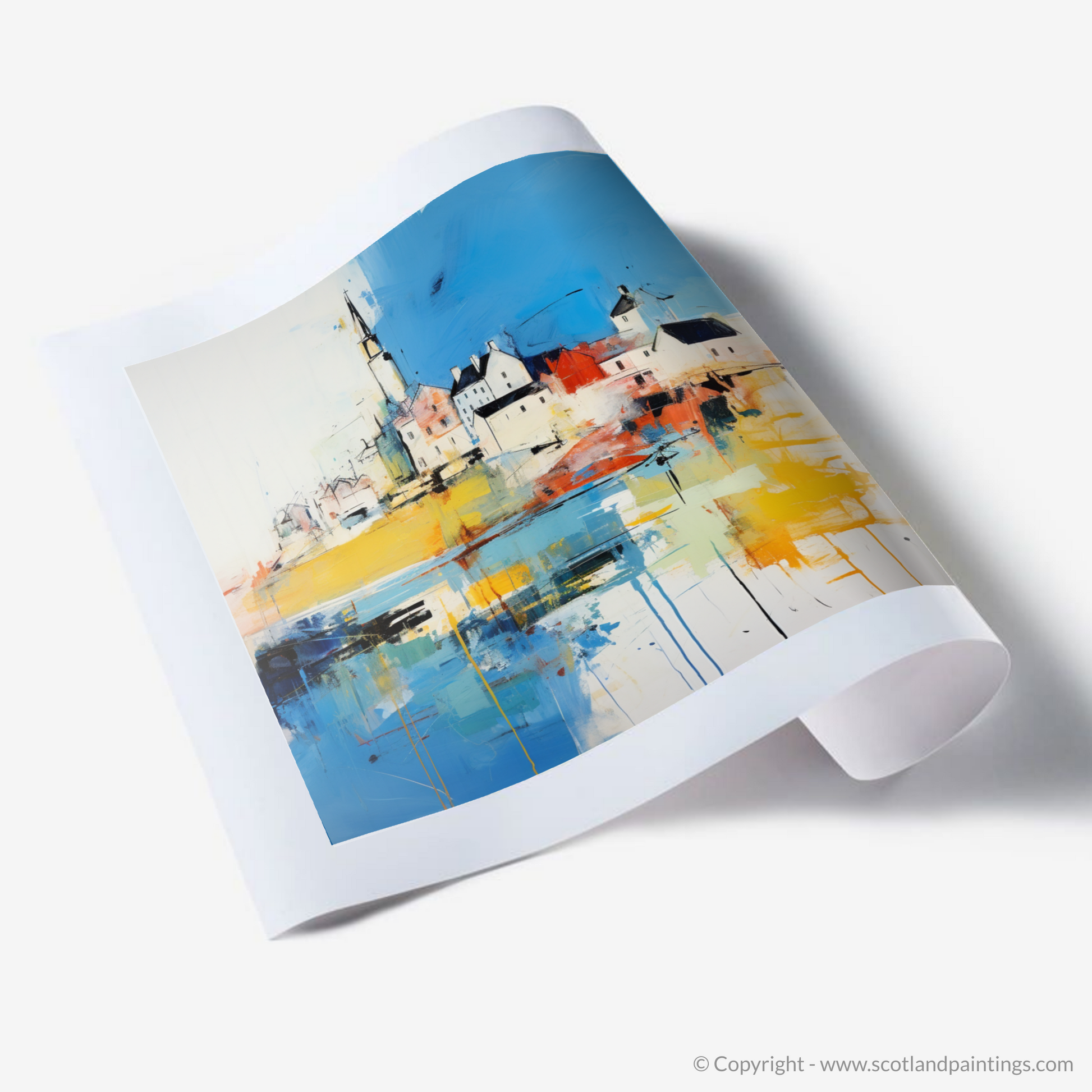 Immerse yourself in the vibrant essence of a Scottish Harbour, captured in the energetic strokes and vivid colours of this abstract print. Inspired by the picturesque Macduff Harbour in Aberdeenshire, this piece evokes the dynamic interplay of sea against land, and sky against harbour. Streaks of cobalt and ultramarine herald the dominance of the ocean, while splashes of sunny yellow and fiery orange reflect the marine glow at the heart of harbour life.