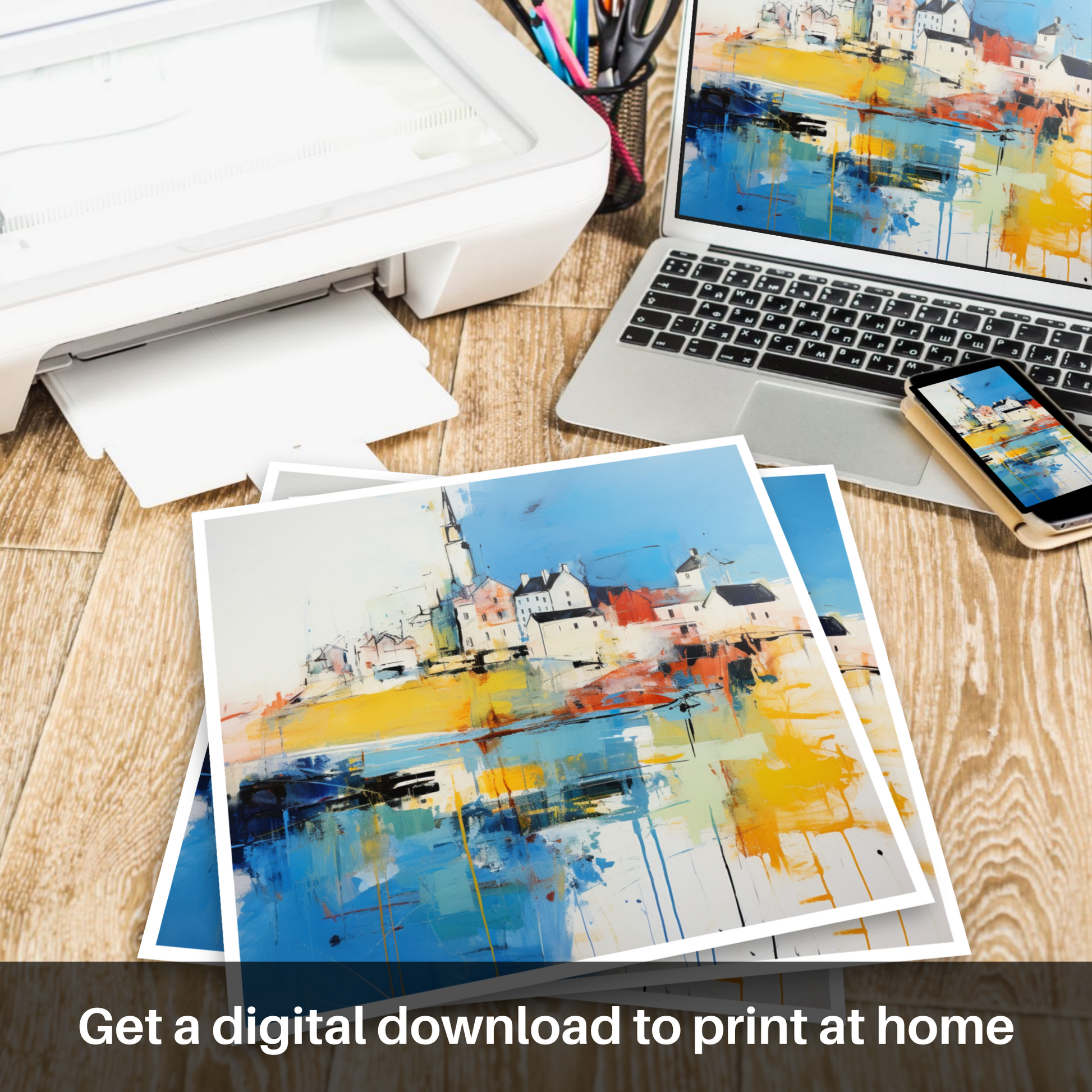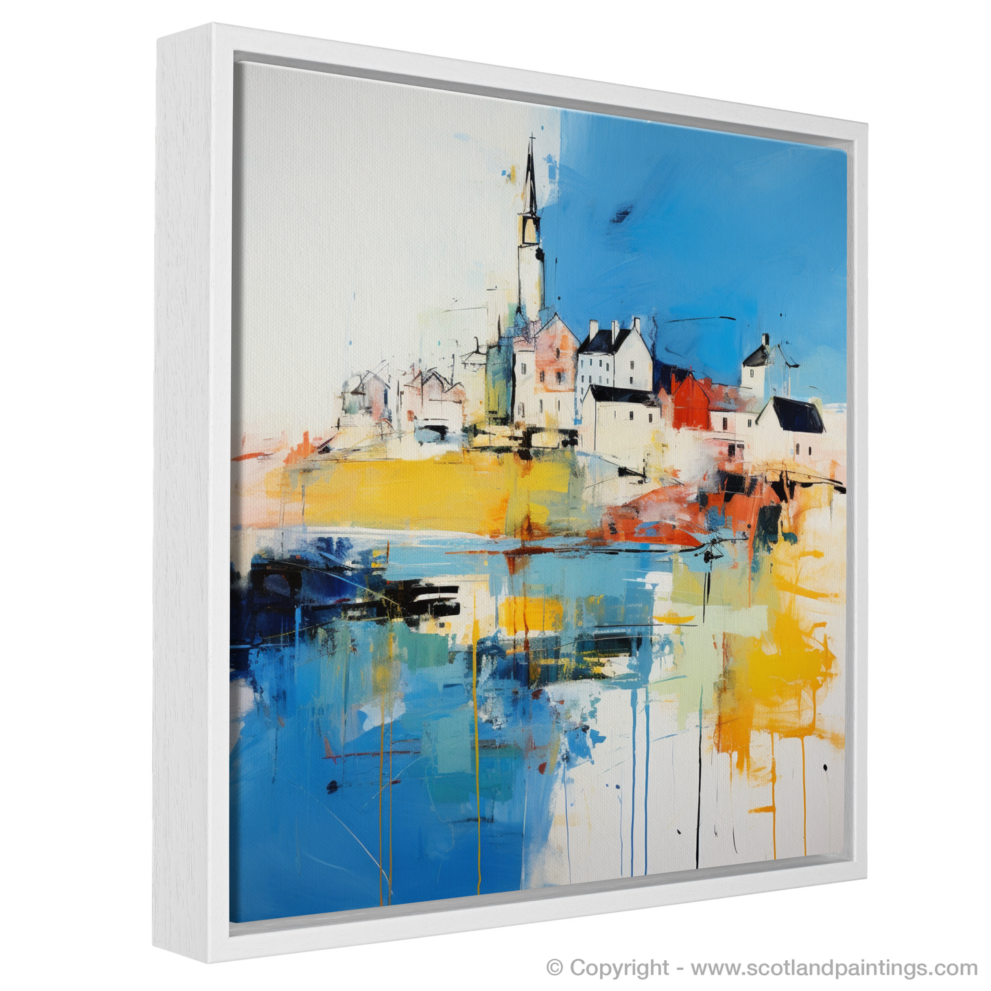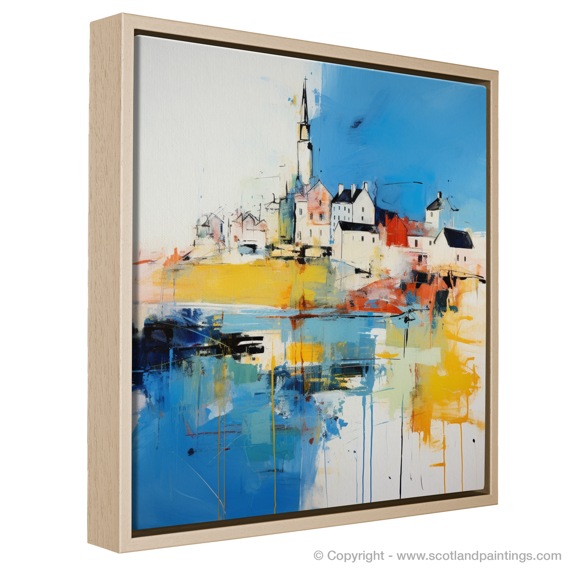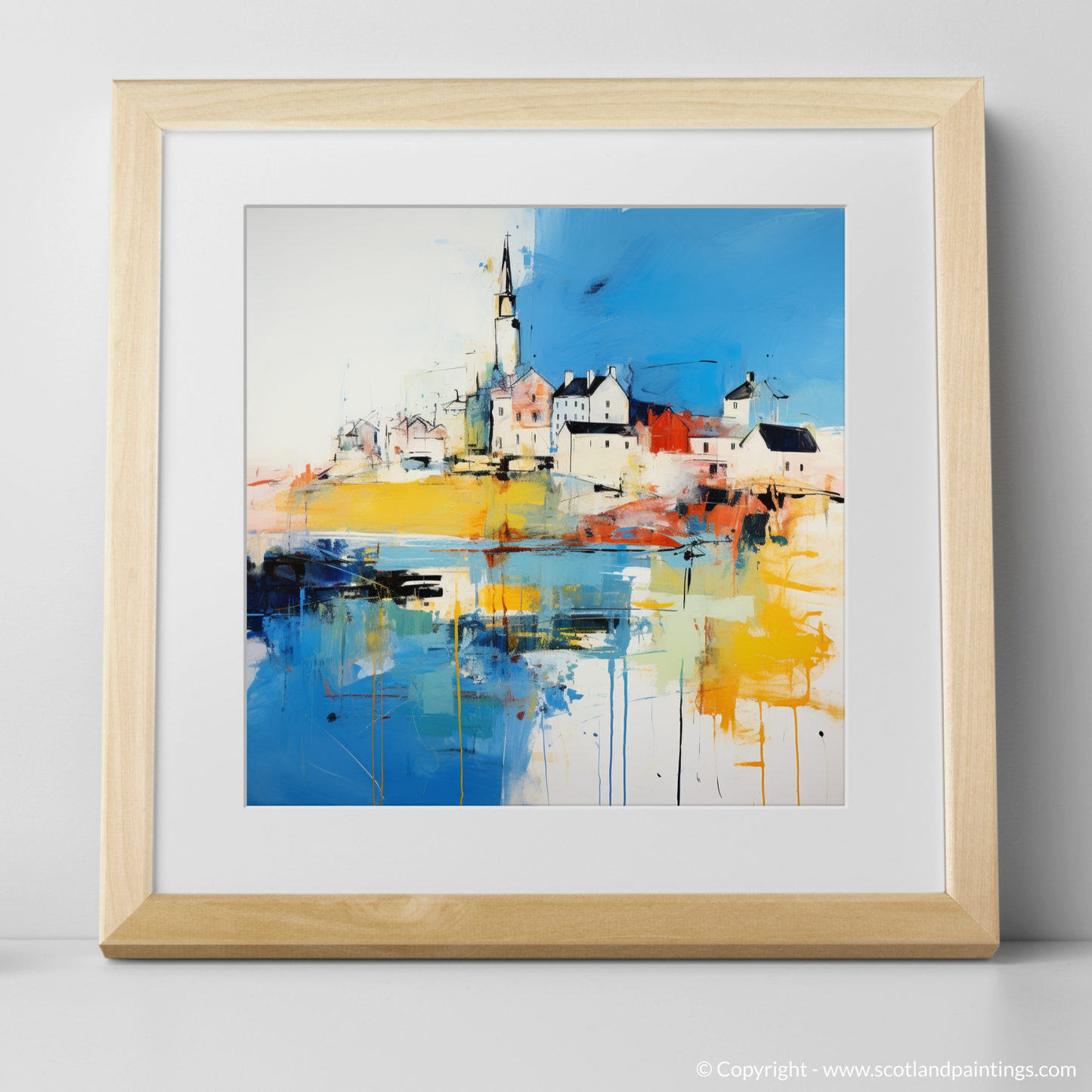 Immerse yourself in the vibrant essence of a Scottish Harbour, captured in the energetic strokes and vivid colours of this abstract print. Inspired by the picturesque Macduff Harbour in Aberdeenshire, this piece evokes the dynamic interplay of sea against land, and sky against harbour. Streaks of cobalt and ultramarine herald the dominance of the ocean, while splashes of sunny yellow and fiery orange reflect the marine glow at the heart of harbour life.