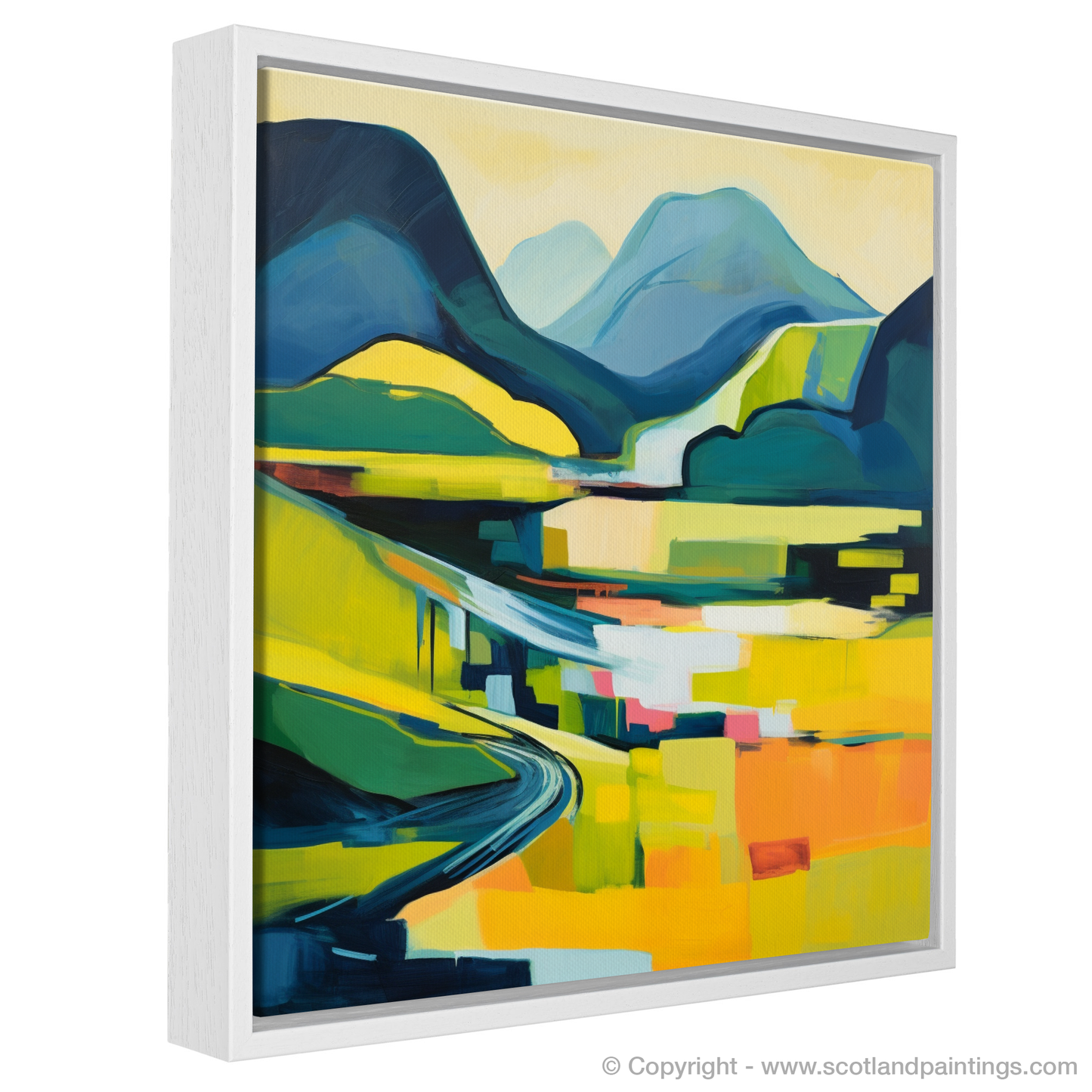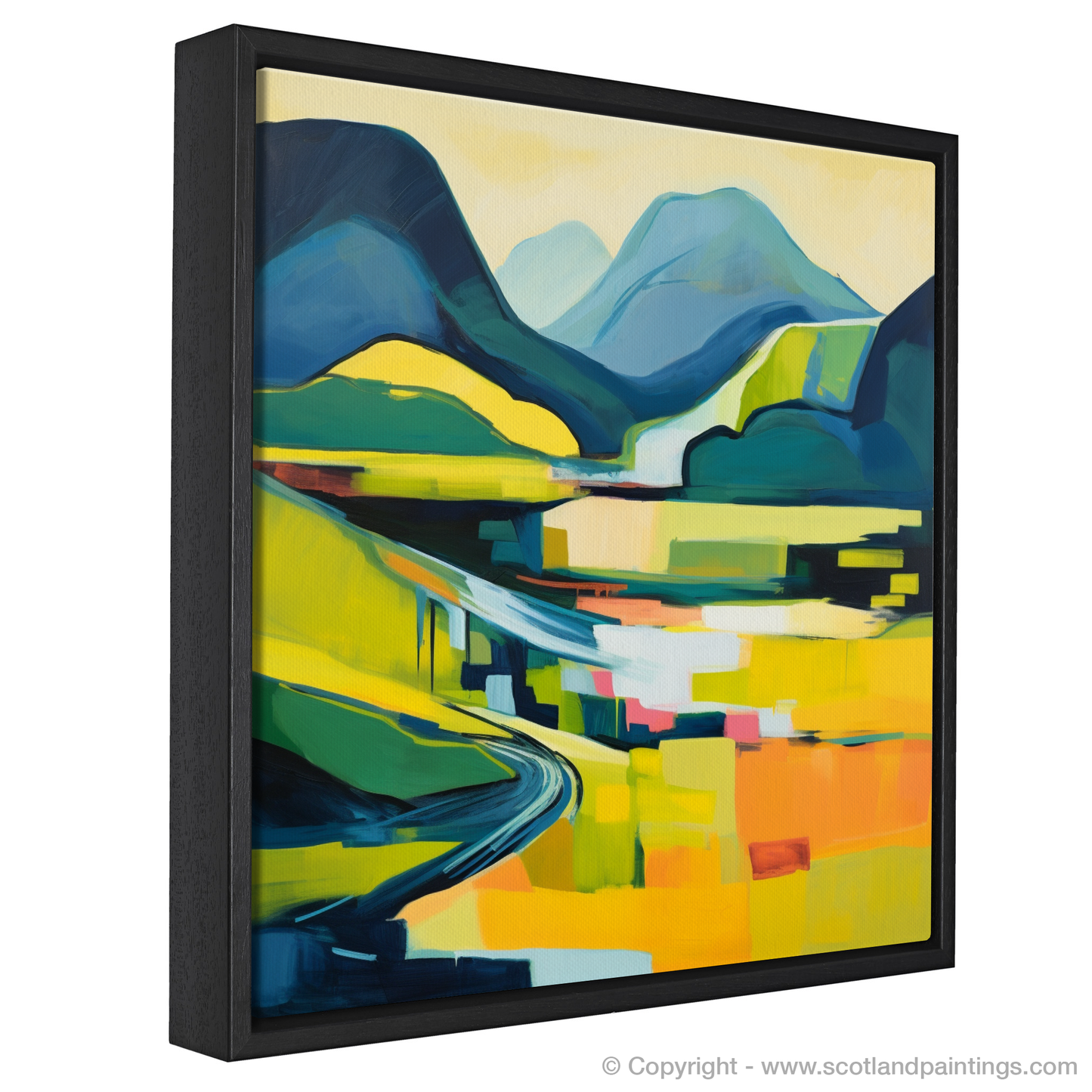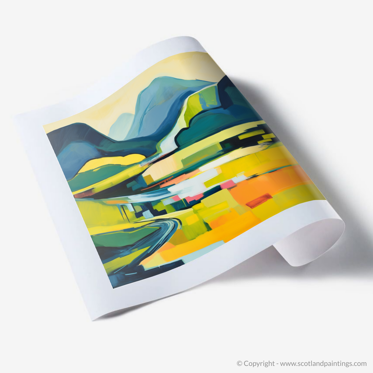 Immerse yourself in the vibrant hues and flowing contours that capture the robust essence of the Glenfinnan landscape. This exquisite print is a celebration of the Scottish Highlands' natural beauty, distilled into bold abstract forms. Swathes of verdant green and rich blue mimic the undulating hills and serene lochs while splashes of bright yellow and delicate pastels evoke the stunning light and diverse textures found in this picturesque region. Strokes of black and white add depth and contrast, creating a dynamic interplay between light and shadow, mirrored by the seamless integration of natural curves and geometric abstraction.