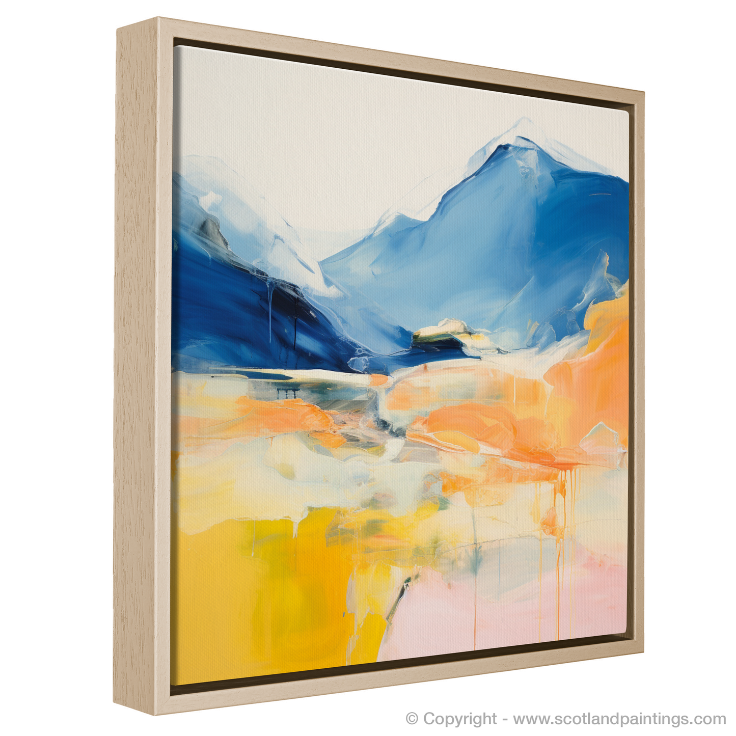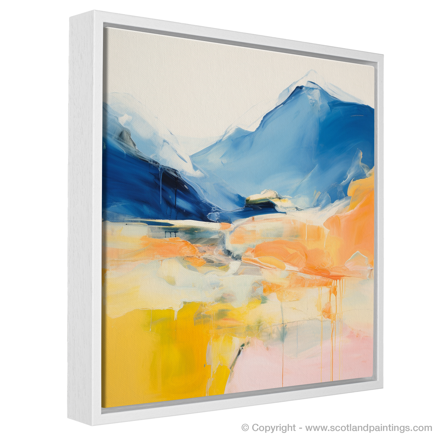 Dramatic blue hues cascade across the canvas, evoking the stately grandeur of towering mountain slopes, while bold strokes of amber and gold intermingle with crisp whites, imparting the warmth of a sun-kissed Glen. The interplay of colour and texture is reminiscent of light playing upon the mountain's facets throughout the day, shifting from the gentle luminescence of dawn to the vibrant blaze of dusk.